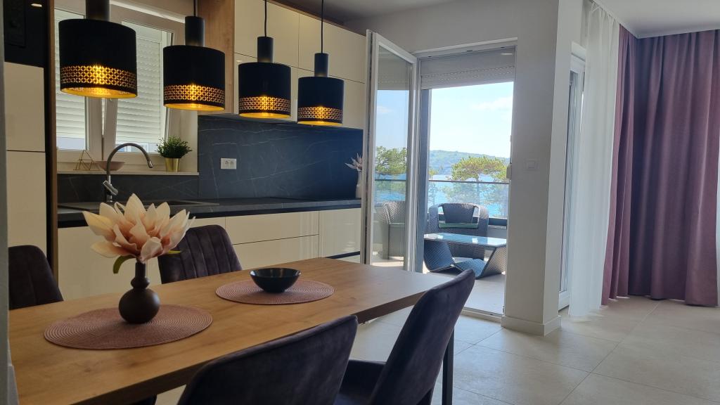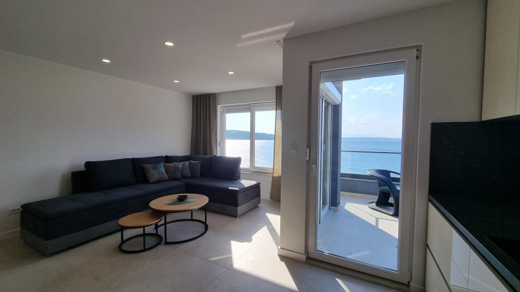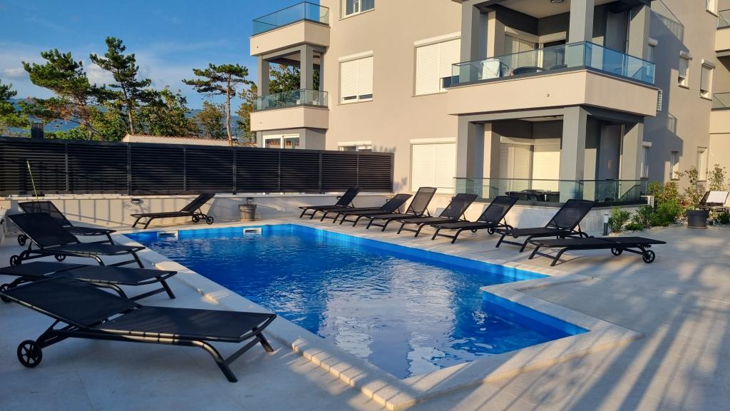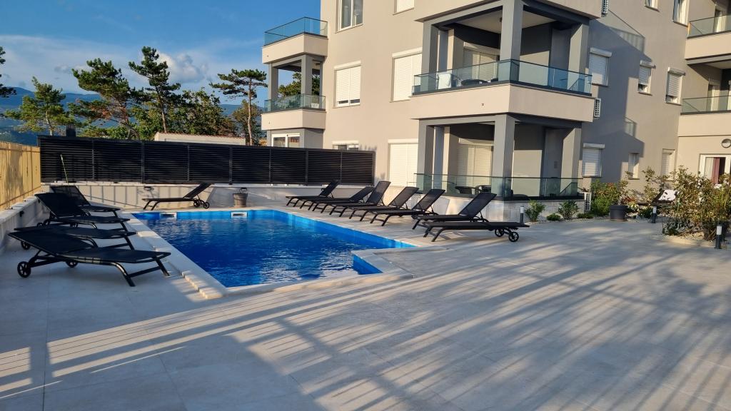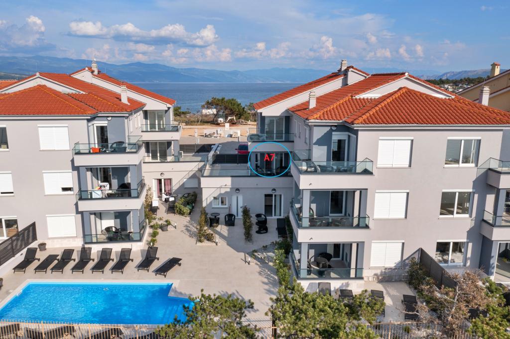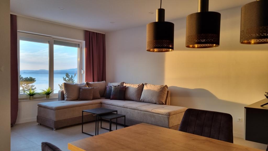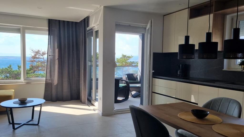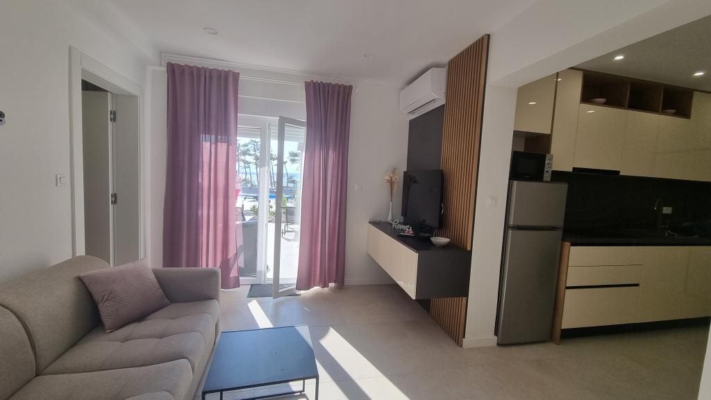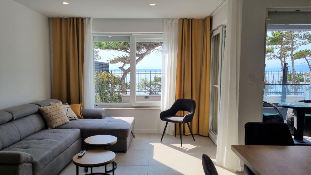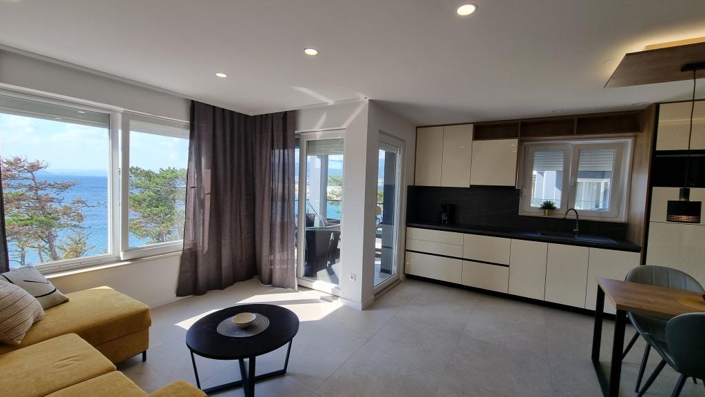 Disse luksuslejligheder med havudsigt er beliggende i et kompleks af bygninger i en rolig beliggenhed. Alle lejligheder er moderne udstyret med to eller endda tre klimaanlæg og smart-tv i stuer og soveværelser. Bygningen har en stor swimmingpool med saltvand (36 m2) til fælles brug, og den er åben fra maj til oktober, med temperaturer der normalt når op på 20-26°C.. Bygningen har i alt 12 lejligheder. Bygningen har en fuldt indhegnet privat parkeringsplads. Der er også en stor stenstrand i umiddelbar nærhed, og i den tilstødende bygning er der en fremragende restaurant, der også byder på et udvalg af lokale specialiteter. Alle lejligheder er udstyret med induktionskomfur, køleskab med fryser, elkedel, kaffemaskine, brødrister, opvaskemaskine og mikroovn. Området ved siden af poolen er udstyret med liggestole, parasoller og en udendørs bruser. Der er gratis trådløs internetadgang overalt i bygningen.