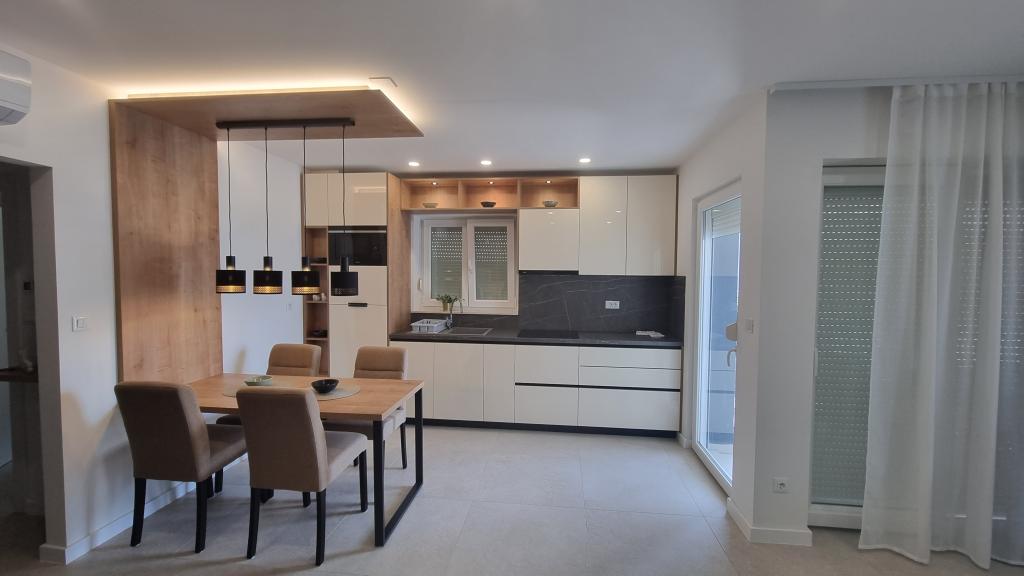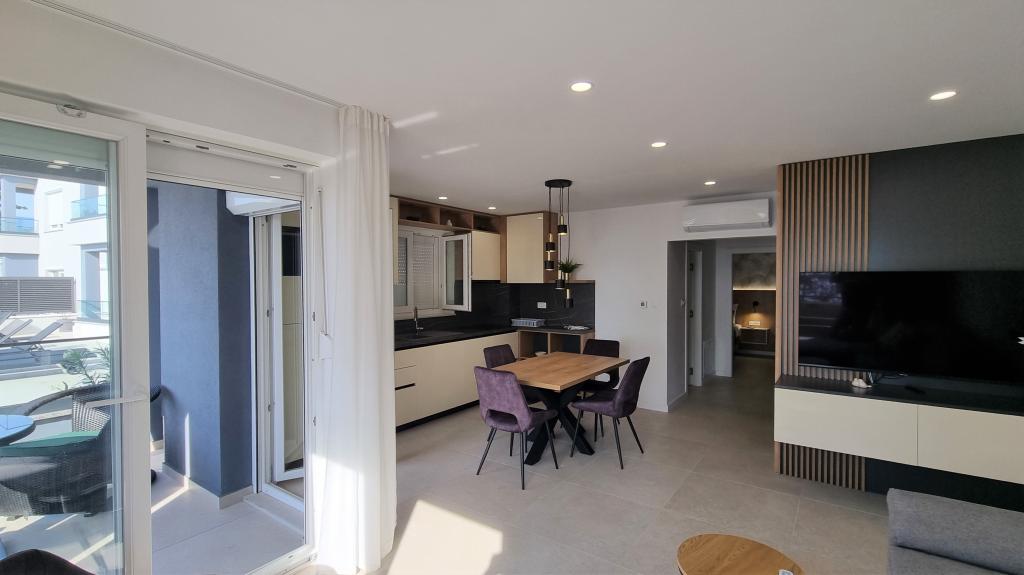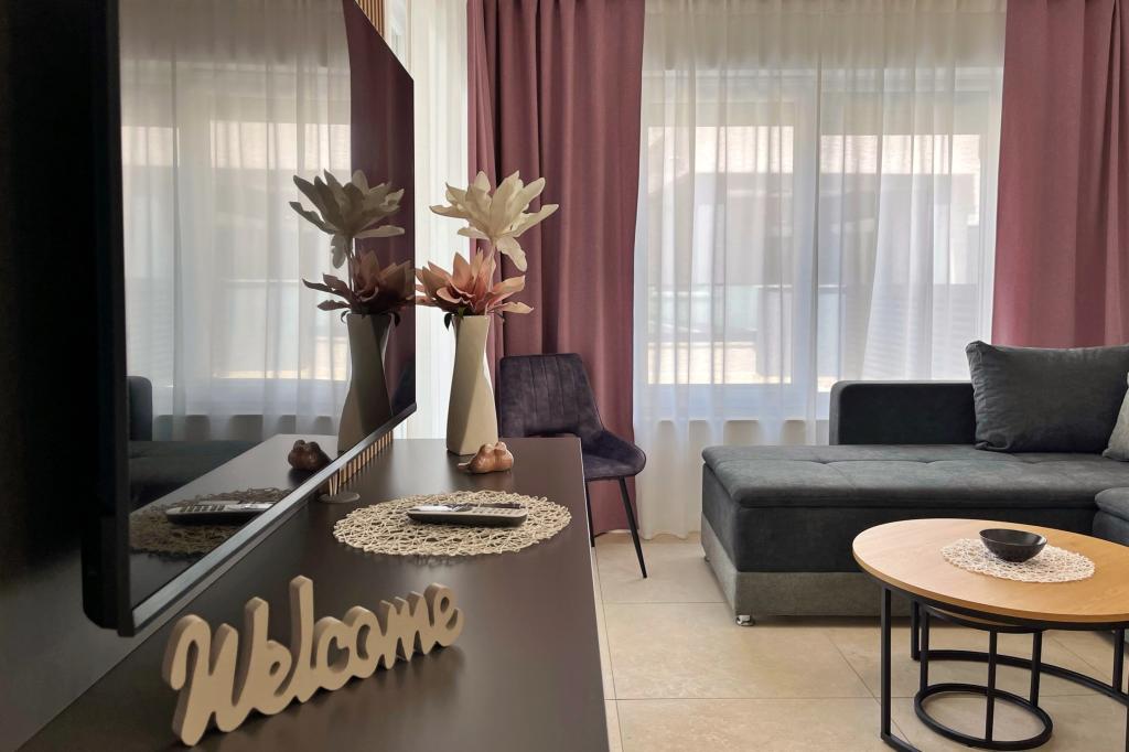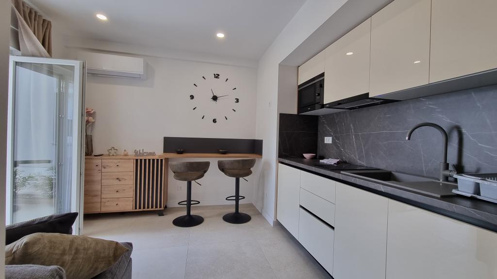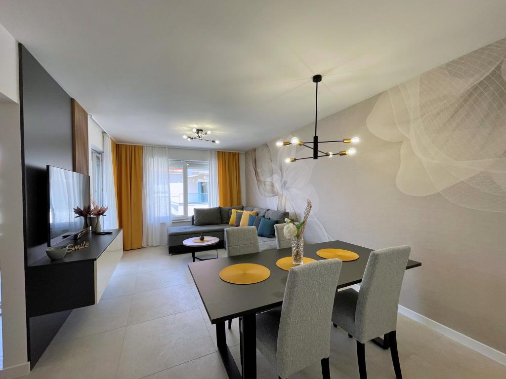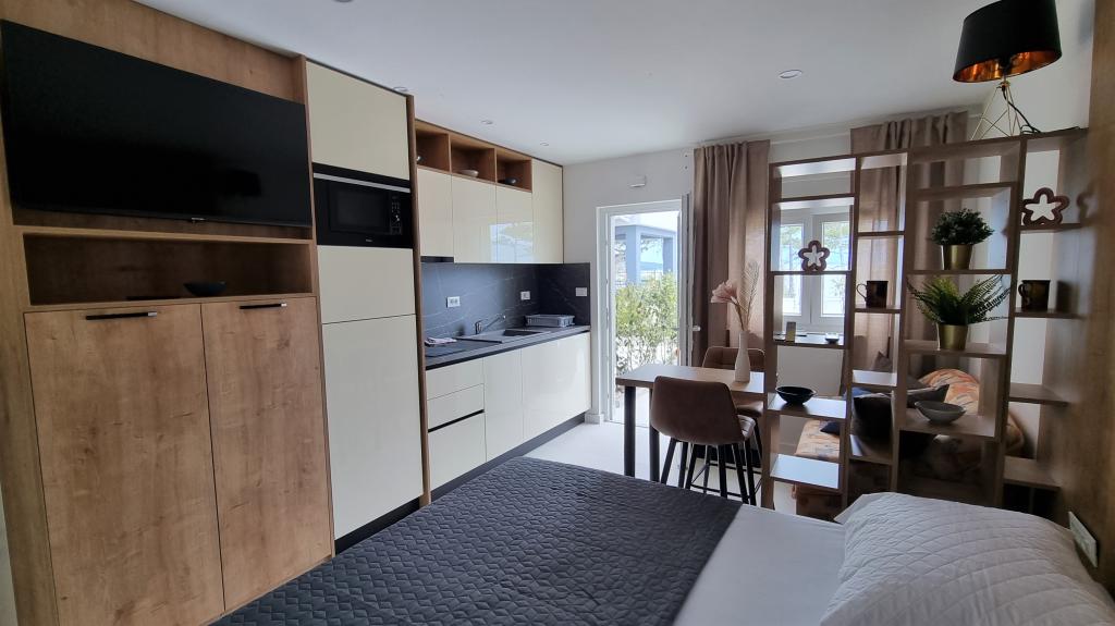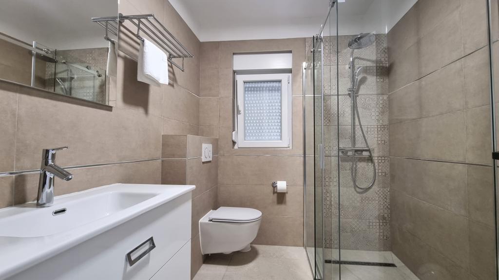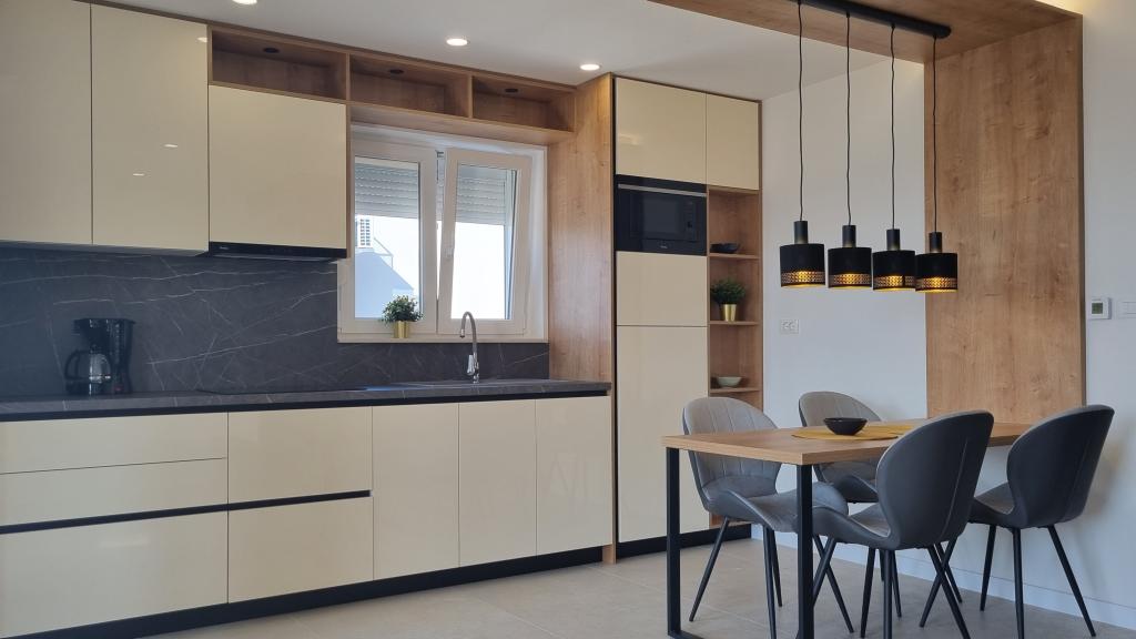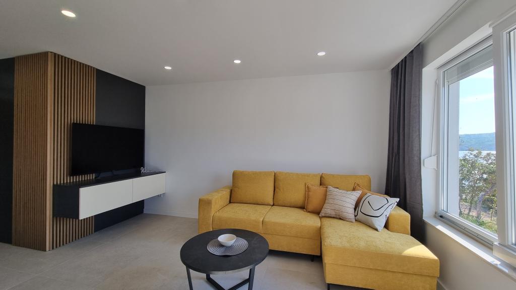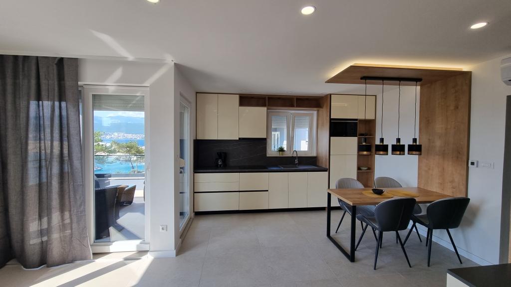 Disse luksuslejligheder med havudsigt er beliggende i et kompleks af bygninger i en rolig beliggenhed. Alle lejligheder er moderne udstyret med to eller endda tre klimaanlæg og smart-tv i stuer og soveværelser. Bygningen har en stor swimmingpool med saltvand (36 m2) til fælles brug, og den er åben fra maj til oktober, med temperaturer der normalt når op på 20-26°C.. Bygningen har i alt 12 lejligheder. Bygningen har en fuldt indhegnet privat parkeringsplads. Der er også en stor stenstrand i umiddelbar nærhed, og i den tilstødende bygning er der en fremragende restaurant, der også byder på et udvalg af lokale specialiteter. Alle lejligheder er udstyret med induktionskomfur, køleskab med fryser, elkedel, kaffemaskine, brødrister, opvaskemaskine og mikroovn. Området ved siden af poolen er udstyret med liggestole, parasoller og en udendørs bruser. Der er gratis trådløs internetadgang overalt i bygningen.