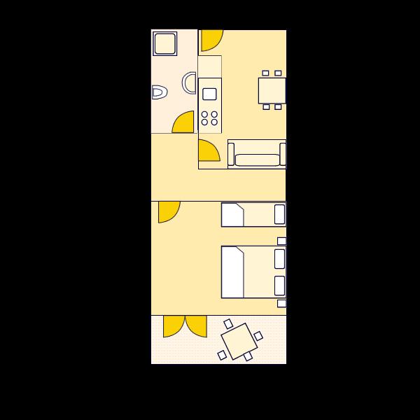 Studiolejlighed til to personer med tre ekstra senge (60 m2)