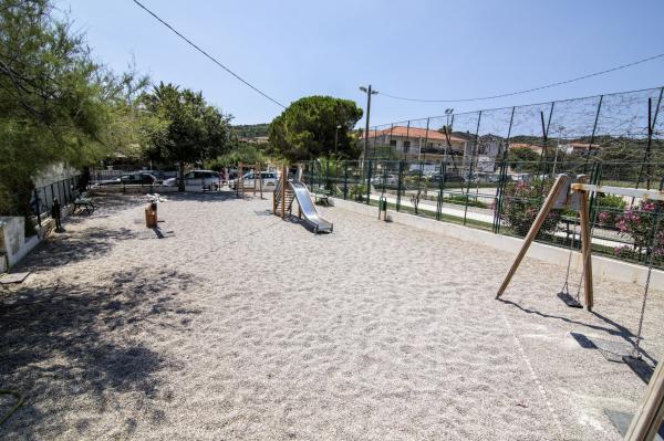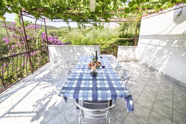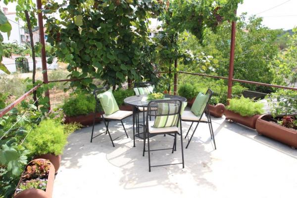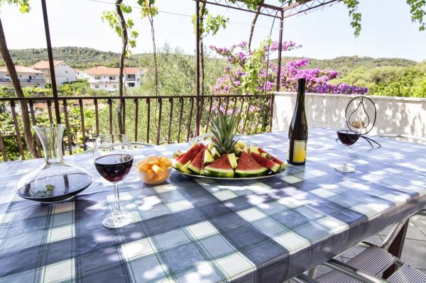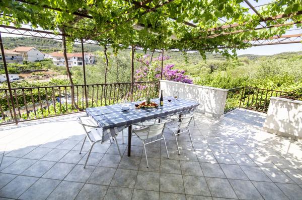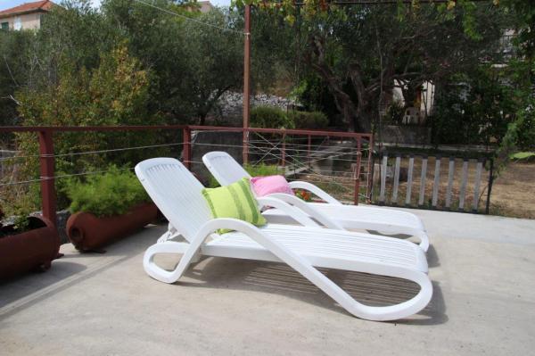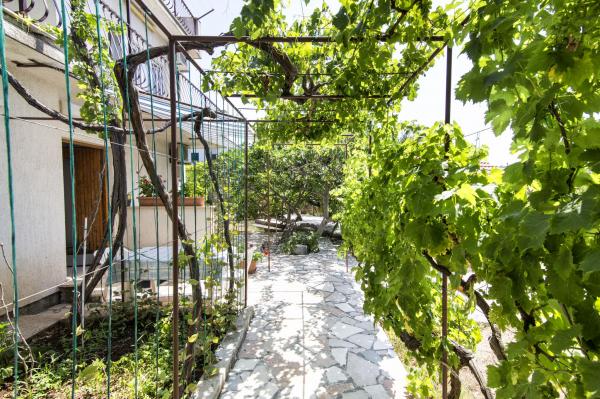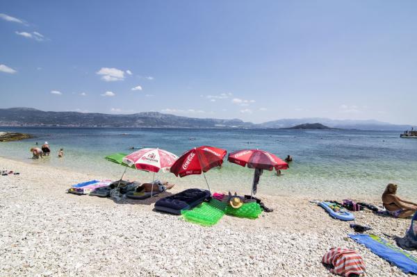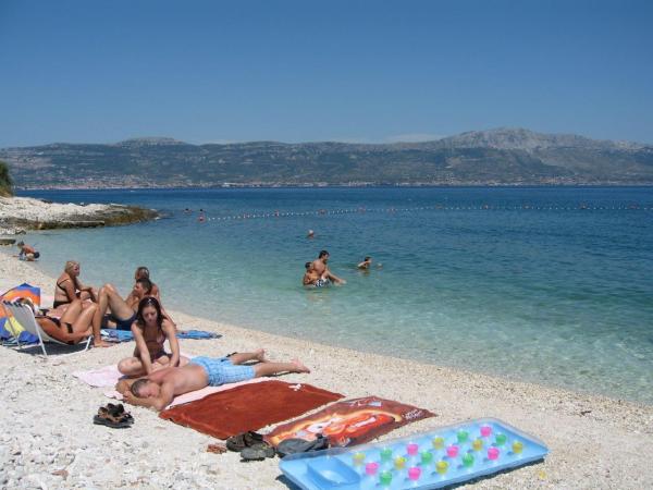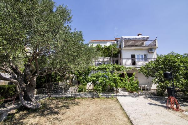 Lejlighederne er beliggende i et familiehus på en privat grund på 2000 m2 bevokset med middelhavsplanter, mandariner, appelsiner, citroner, figner og oliven. Hver lejlighed har en stor terrasse i den naturlige skygge af vinstokke med bord og stole. Alle lejligheder er fuldt møblerede og udstyrede, så alt hvad du behøver er strand- og hygiejnehåndklæder. Naturlig græs i skyggen af et oliventræ er velegnet til små børn at lege. Alle lejligheder har aircondition. En fælles terrasse på 150 m2 med en grill og et bord i den naturlige skygge af kiwi er tilgængelig for gæster til mulige sammenkomster. En udendørs bruser og liggestole er også tilgængelige. Der er også en indhegnet parkeringsplads til køretøjer på grunden til alle lejligheder. Den nærmeste strand ligger 140 m fra lejligheden. Den berømte naturlige strand Kava ligger 3 km fra lejligheden. 5 minutter fra lejligheden ligger turistbådens mole, der forbinder Slatine med Split og Trogir flere gange om dagen.