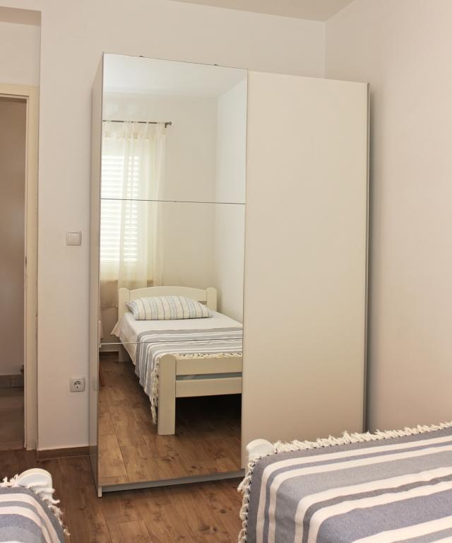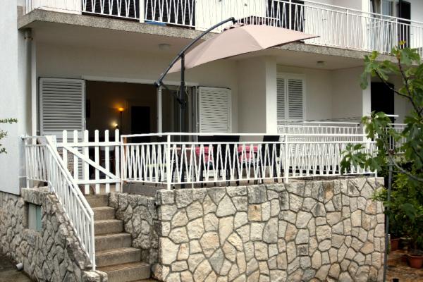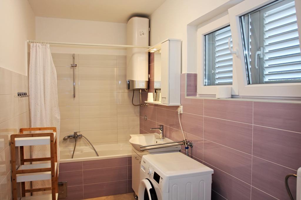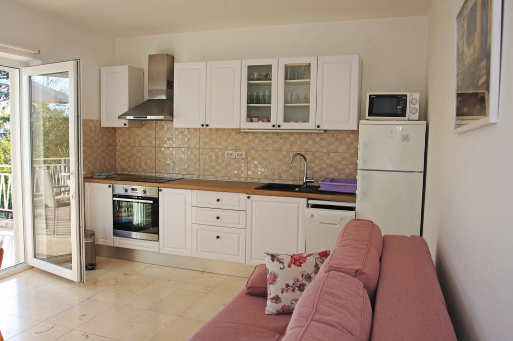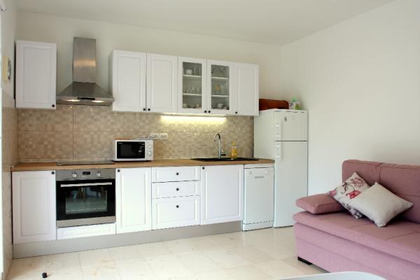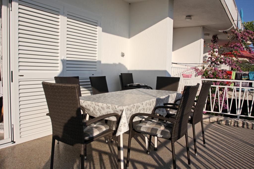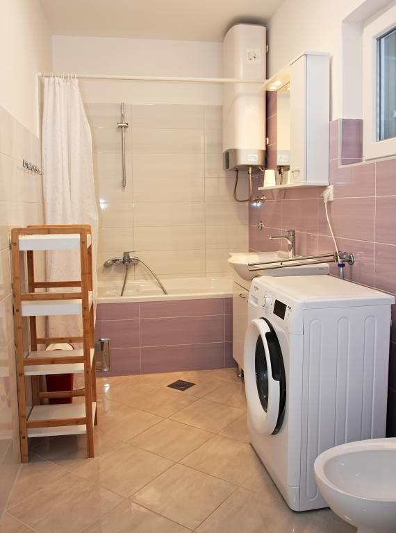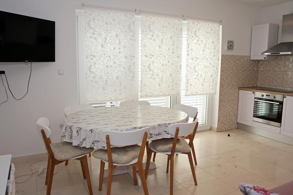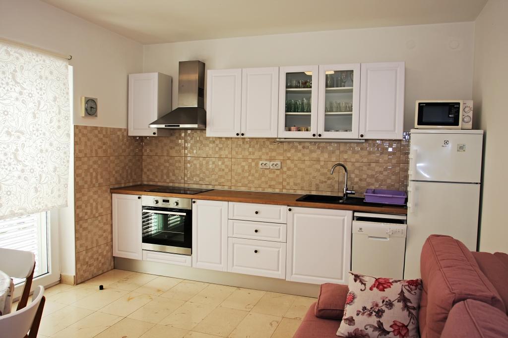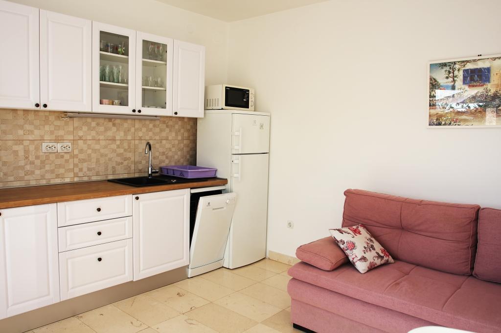 Nybygget 3-værelses lejlighed i stueetagen, første række til havet. Lejligheden består af et køkken med spisestue og stue, tre soveværelser, to badeværelser med toiletter, et andet separat toilet, har også en stor terrasse og en anden balkon. To soveværelser har dobbeltsenge og den ene har to separate senge. I stuen er der en tre seter, der strækker sig ind i en seng til to personer. Køkkenet er udstyret med opvaskemaskine, mikroovn, ovn, køleskab med fryser. Et badeværelse har en vaskemaskine. Der er to parkeringspladser i gården, og gæsterne har grillfaciliteter. Stranden ligger lige foran huset.