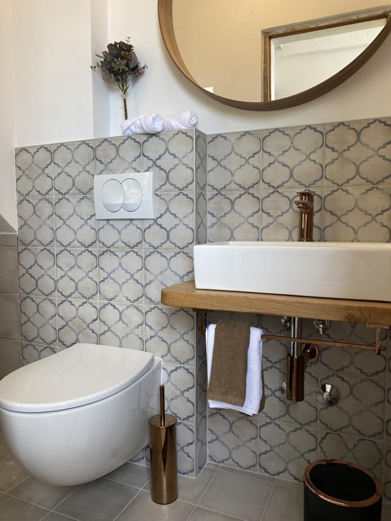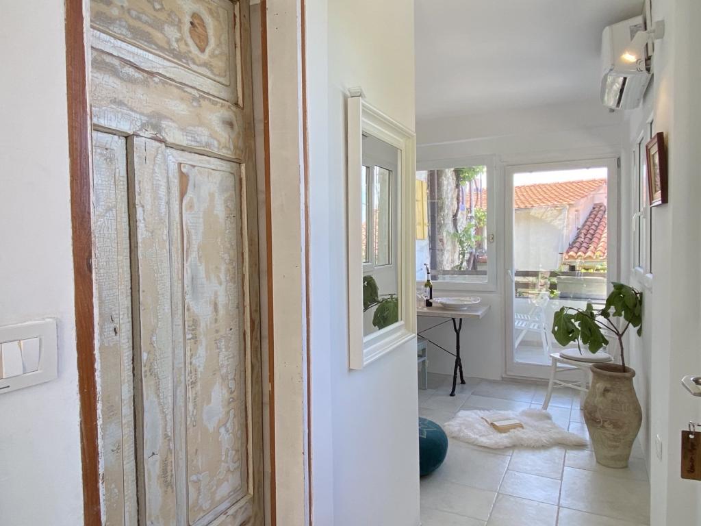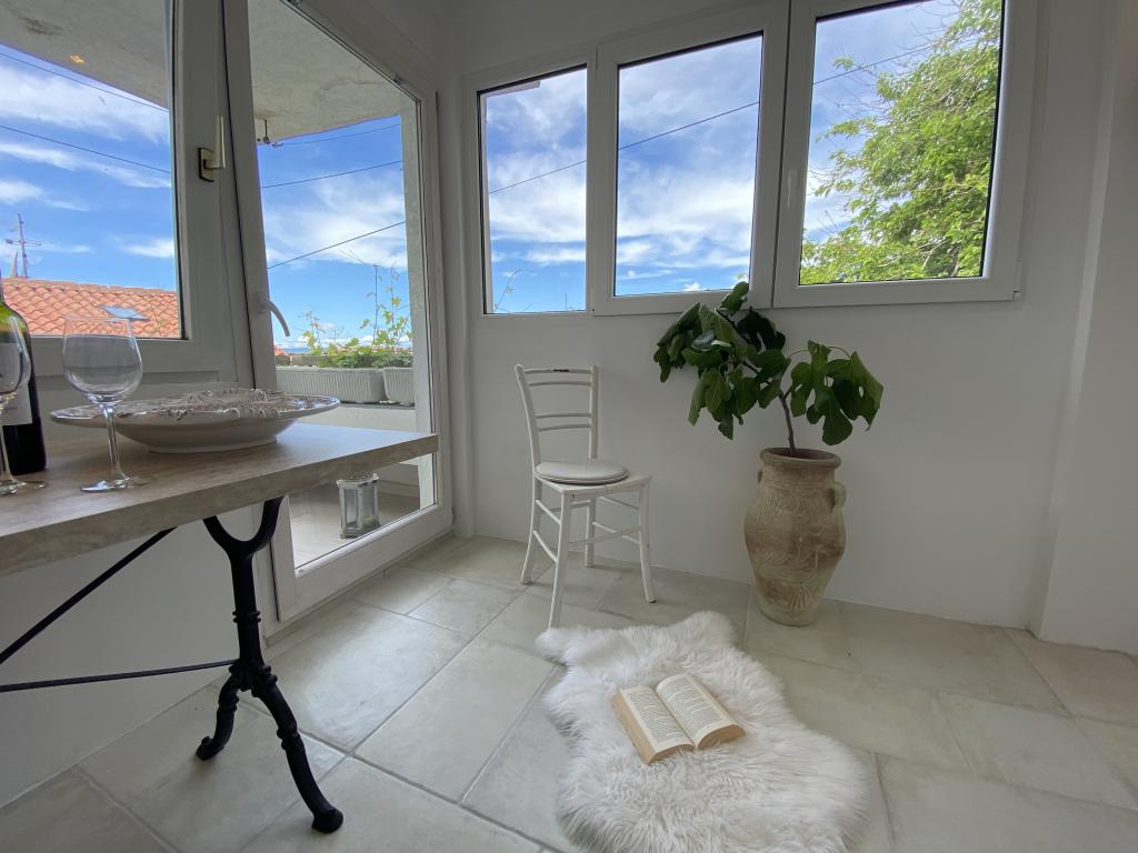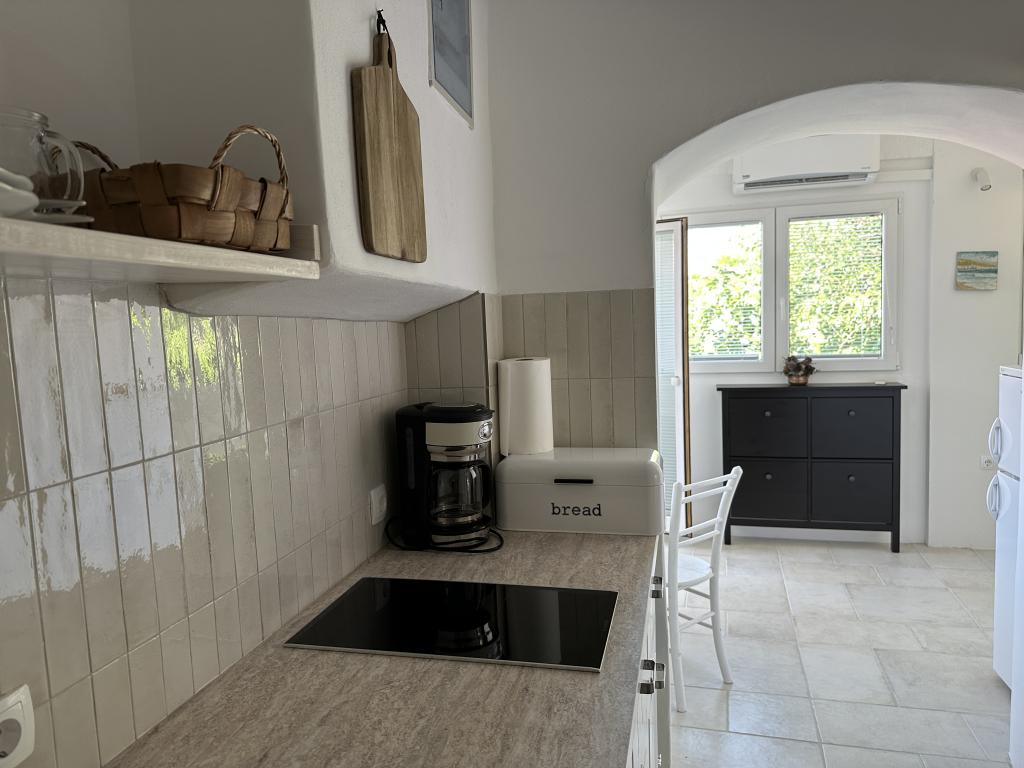 Huset ligger 50 meter fra sand- og stenstranden. Der er ingen menneskemængder på stranden, og havet er krystalklart. Der er to lejligheder i huset. Lejligheden er nyistandsat og fuldt udstyret. Lejligheden har to soveværelser med dobbeltseng, et fuldt udstyret køkken, et badeværelse og en balkon med udsigt over havet. Der er en parkeringsplads 100 m fra huset.
