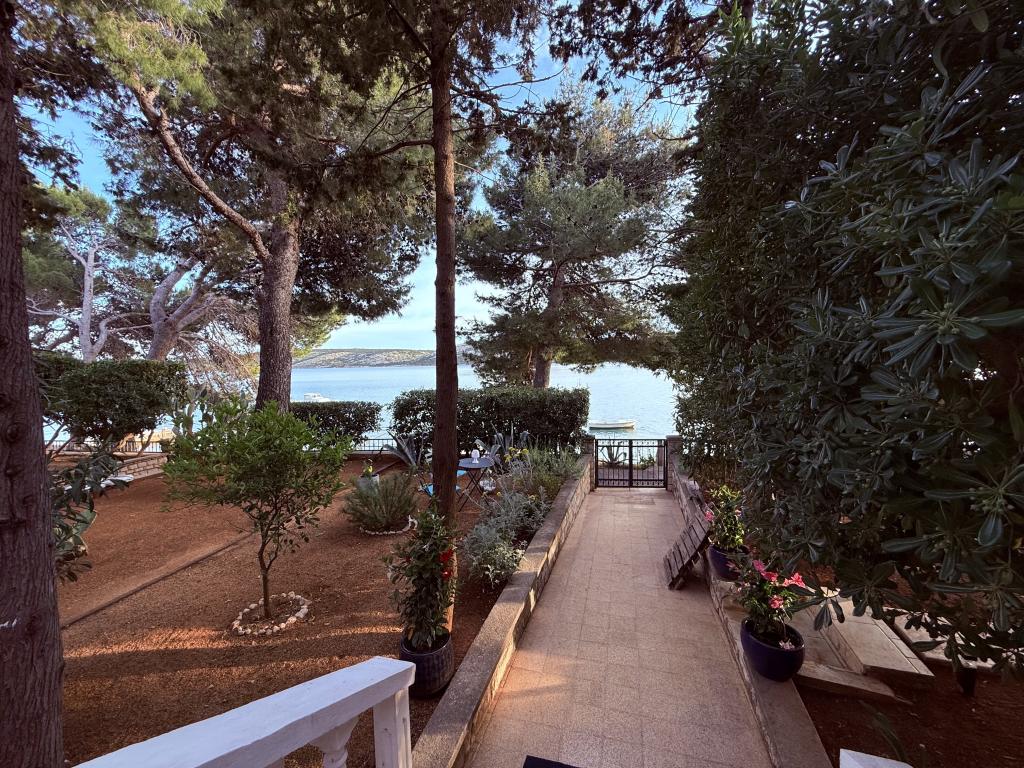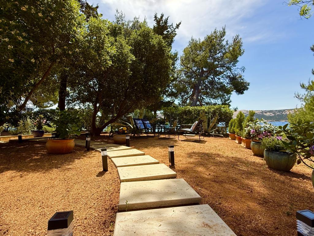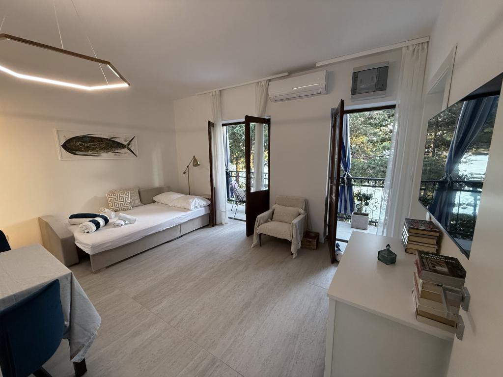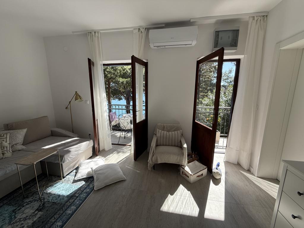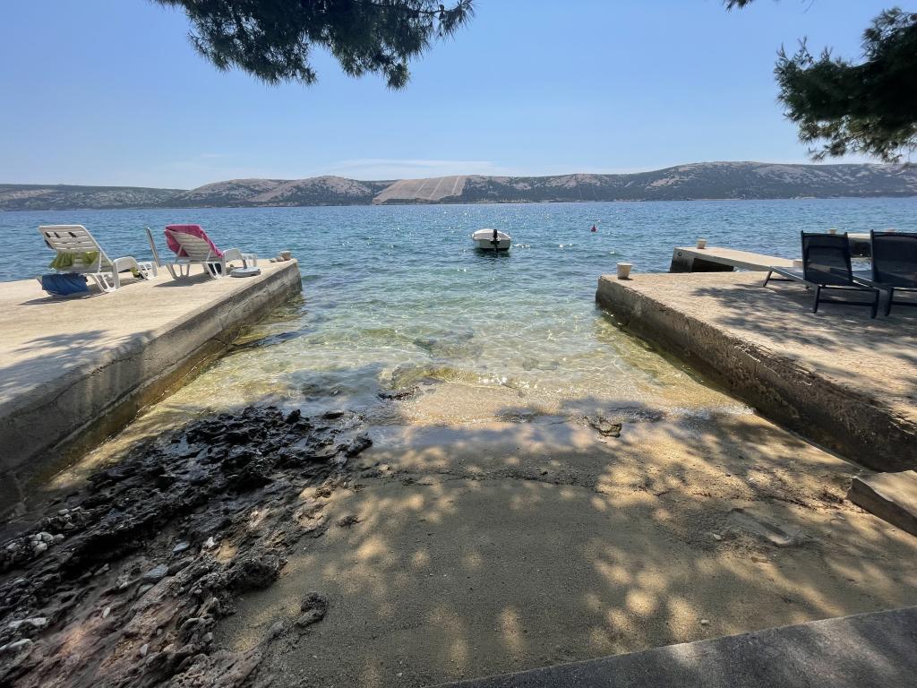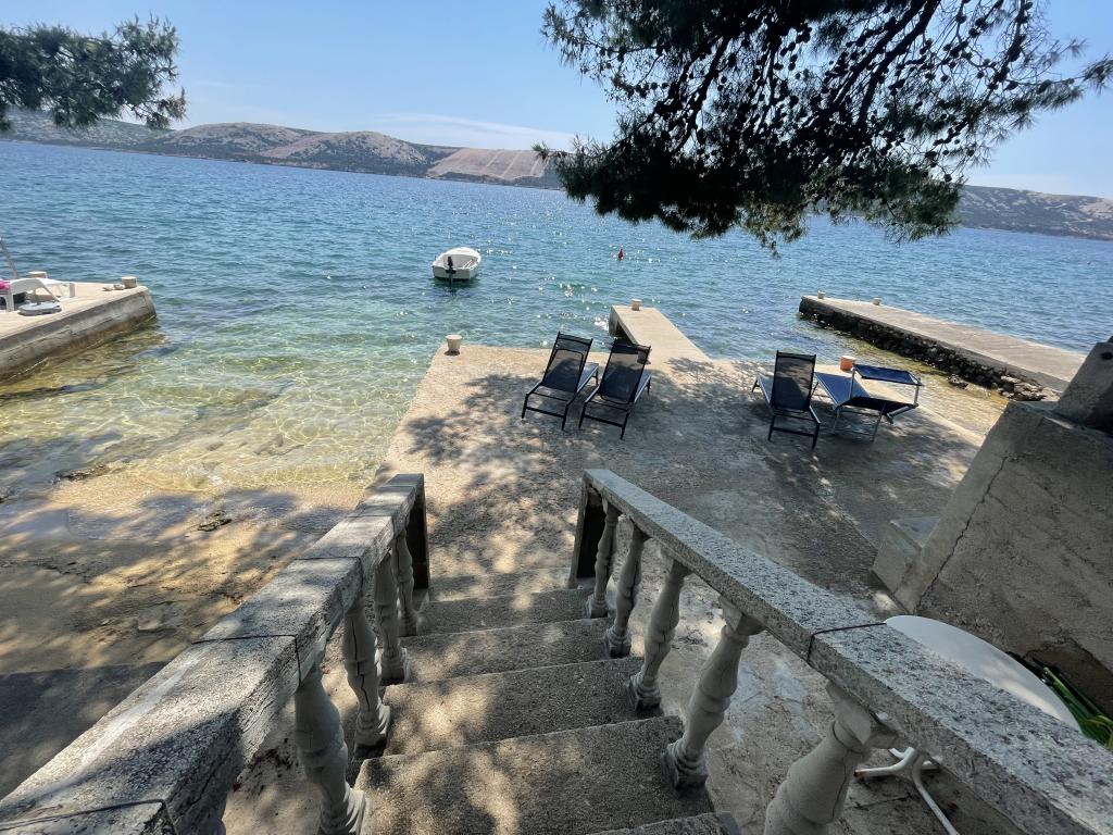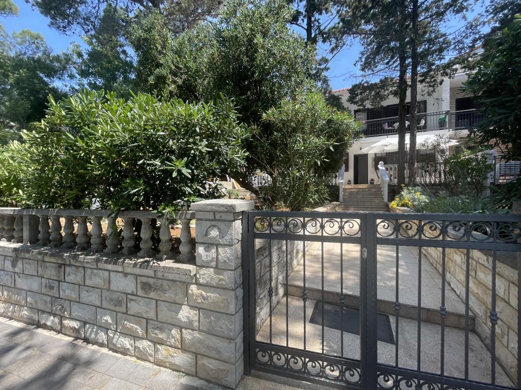 Alle 4 lejligheder benytter en privat strand foran huset med liggestole og bruser samt skygge fra fyrretræer. 1. Lejlighed A4+2 i stueetagen i et romantisk hus, første række til havet (10 m). Den har to soveværelser og en sovesofa i stuen. Lejligheden har adgang til sin egen store terrasse med en smuk havudsigt. Ideel til en familie med børn og også til en gruppe på op til 5 venner. Det er muligt at leje lejlighed A4+1 på første sal i samme hus og bruge hele huset. 2. Lejlighed A4+1 på 1. sal har 2 soveværelser og en ekstra seng i stuen. Den har en balkon med en fantastisk udsigt og en privat terrasse på 20m2. 3. Studiolejligheden ligger i et andet mindre hus i haven bag det første hus, 30 meter fra havet. 4. Lejlighed A2+2 ligger i et andet mindre hus i haven bag det første hus, 30 meter fra havet. Fred og privatliv, især i juni og september, er fordelene ved disse lejligheder, som mange har kaldt som himlen på jorden. Kæledyr er ikke tilladt (små hunde op til 7 kg efter anmodning).