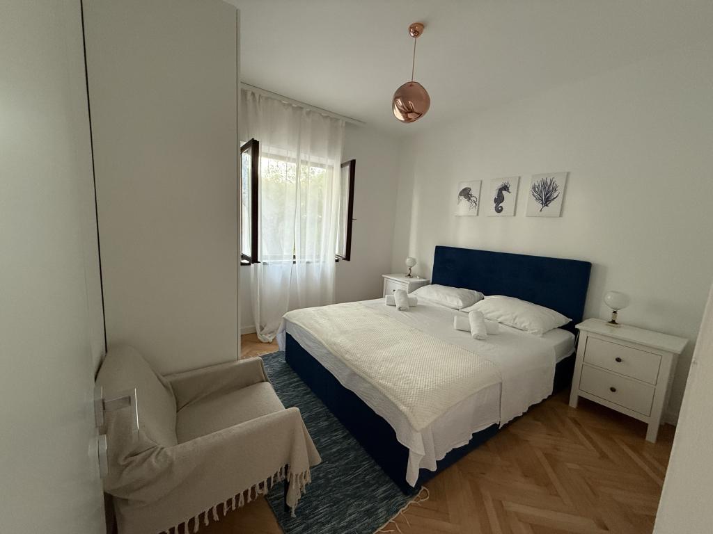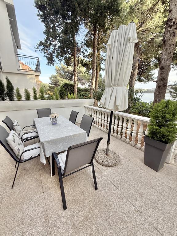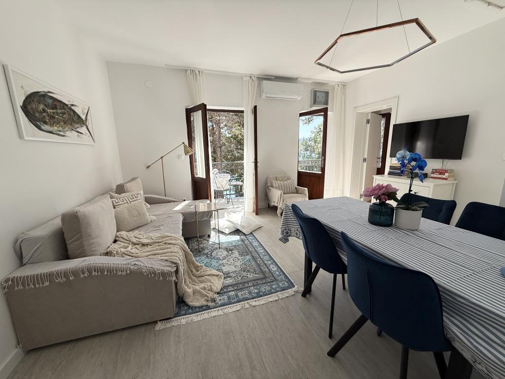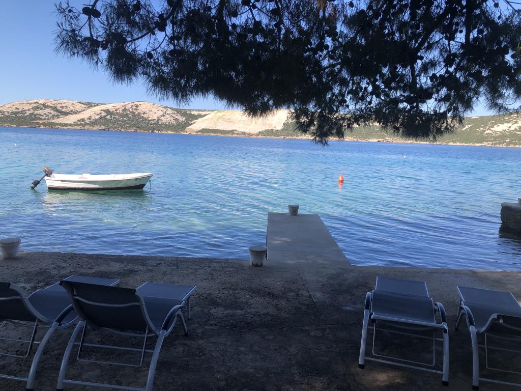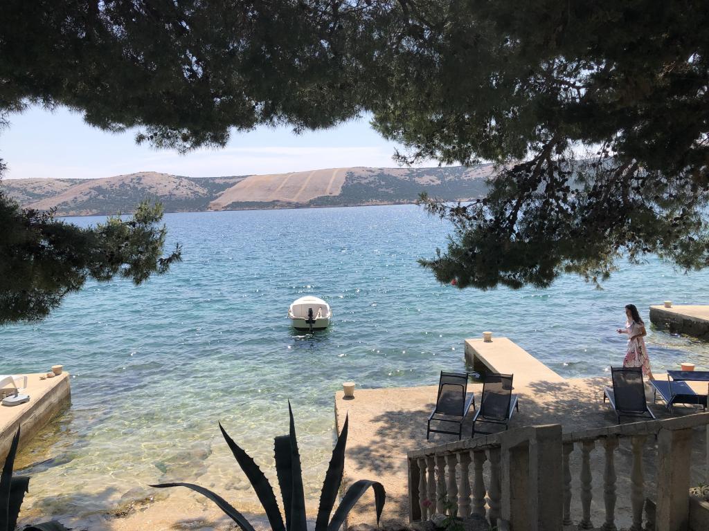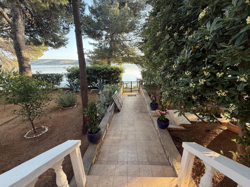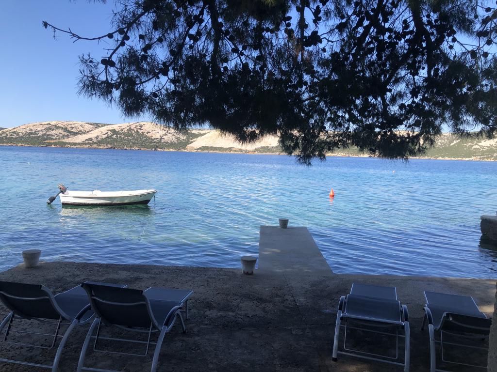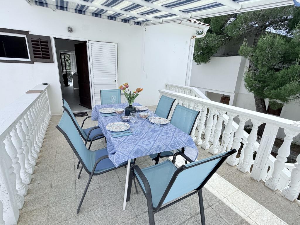 Alle 4 lejligheder benytter en privat strand foran huset med liggestole og bruser samt skygge fra fyrretræer. 1. Lejlighed A4+2 i stueetagen i et romantisk hus, første række til havet (10 m). Den har to soveværelser og en sovesofa i stuen. Lejligheden har adgang til sin egen store terrasse med en smuk havudsigt. Ideel til en familie med børn og også til en gruppe på op til 5 venner. Det er muligt at leje lejlighed A4+1 på første sal i samme hus og bruge hele huset. 2. Lejlighed A4+1 på 1. sal har 2 soveværelser og en ekstra seng i stuen. Den har en balkon med en fantastisk udsigt og en privat terrasse på 20m2. 3. Studiolejligheden ligger i et andet mindre hus i haven bag det første hus, 30 meter fra havet. 4. Lejlighed A2+2 ligger i et andet mindre hus i haven bag det første hus, 30 meter fra havet. Fred og privatliv, især i juni og september, er fordelene ved disse lejligheder, som mange har kaldt som himlen på jorden. Kæledyr er ikke tilladt (små hunde op til 7 kg efter anmodning).