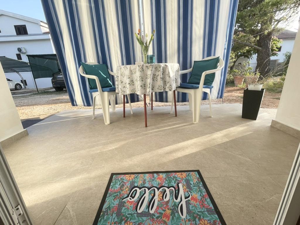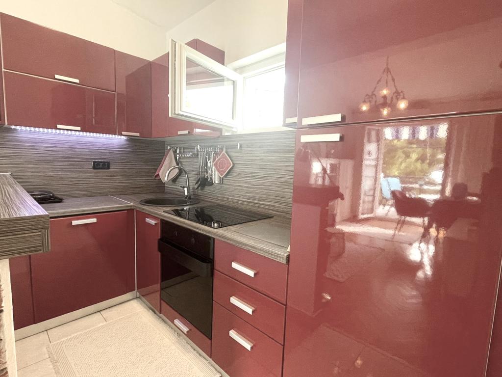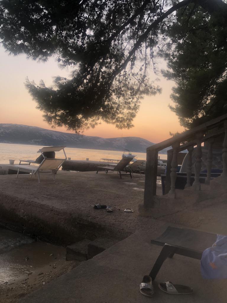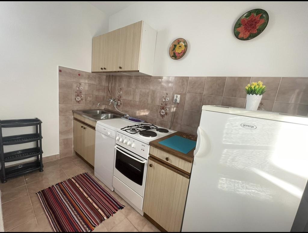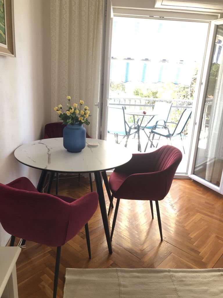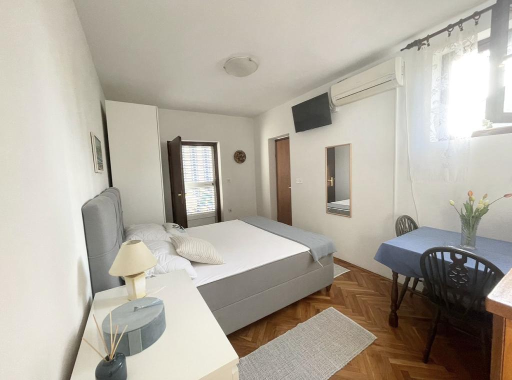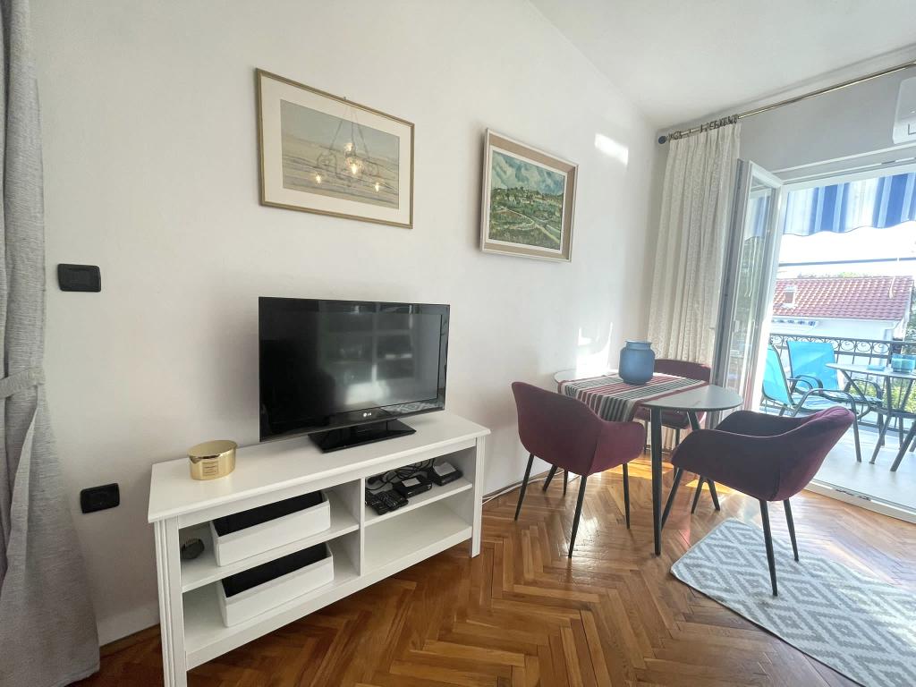 Alle 4 lejligheder benytter en privat strand foran huset med liggestole og bruser samt skygge fra fyrretræer. 1. Lejlighed A4+2 i stueetagen i et romantisk hus, første række til havet (10 m). Den har to soveværelser og en sovesofa i stuen. Lejligheden har adgang til sin egen store terrasse med en smuk havudsigt. Ideel til en familie med børn og også til en gruppe på op til 5 venner. Det er muligt at leje lejlighed A4+1 på første sal i samme hus og bruge hele huset. 2. Lejlighed A4+1 på 1. sal har 2 soveværelser og en ekstra seng i stuen. Den har en balkon med en fantastisk udsigt og en privat terrasse på 20m2. 3. Studiolejligheden ligger i et andet mindre hus i haven bag det første hus, 30 meter fra havet. 4. Lejlighed A2+2 ligger i et andet mindre hus i haven bag det første hus, 30 meter fra havet. Fred og privatliv, især i juni og september, er fordelene ved disse lejligheder, som mange har kaldt som himlen på jorden. Kæledyr er ikke tilladt (små hunde op til 7 kg efter anmodning).