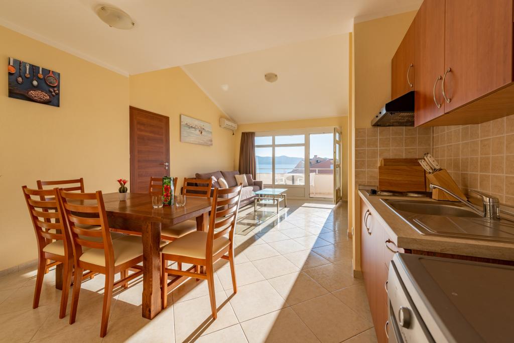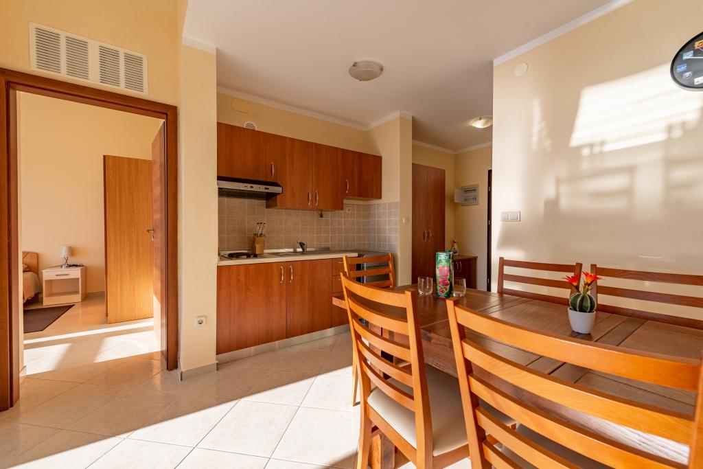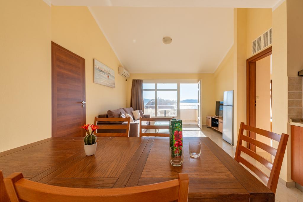 Lejligheden er veludstyret og har to altaner med smuk havudsigt. Klimaanlægget giver dig mulighed for at justere rumtemperaturen afhængigt af vejret. Beliggenheden er ideel for familier med børn, næsten direkte på stranden, men stadig stille. Der er en børnestrand med sandbund i nærheden. Personalet er venligt og hjælpsomt.
