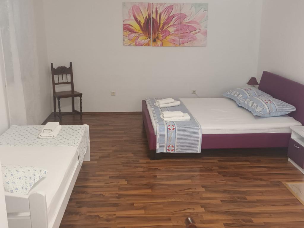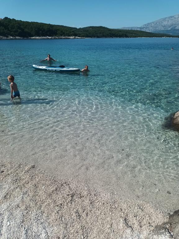 Feriehuset ligger 200 meter fra tre forskellige strande. En rolig strand kaldet Jezero, omgivet af fyrreskove og med udsigt over Biokovo, anbefales til familier med små børn, fordi den har en lavvandet og sandet del. En sandstrand kaldet Baywatch ligger også i nærheden af huset, cirka 150 m væk, for alle dem, der elsker strandsjov. I byens centrum er der en strand, i nærheden af hvilken der er restauranter og caféer. Feriehuset er fuldt udstyret med alle nødvendige faciliteter for en behagelig ferie. I den indhegnede og private have er der swimmingpool, grill og siddemøbler. På øverste etage er der en rummelig terrasse med udsigt over havet, øerne og Biokovo-bjerget. Ved siden af dette ligger et andet hus med to separate lejligheder. Den har havudsigt og en terrasse, der bruges af lejlighederne. Hver lejlighed er en separat enhed. De har også en fælles grill og et siddeområde i haven.