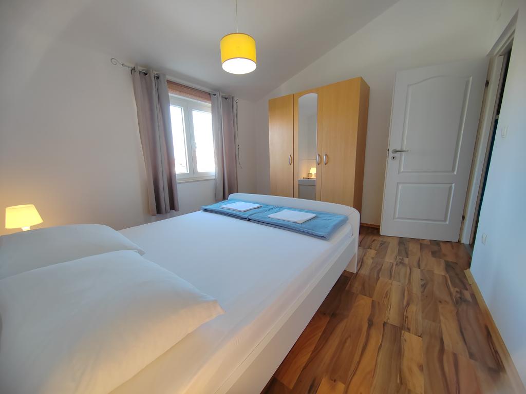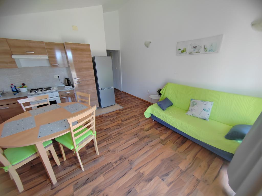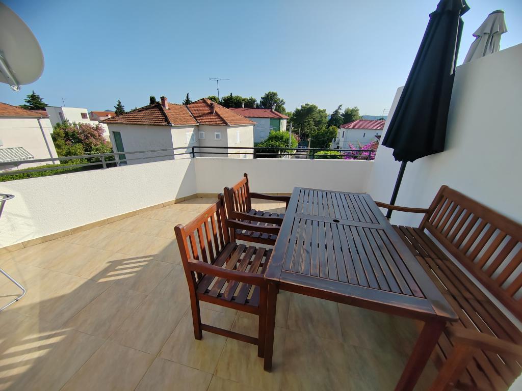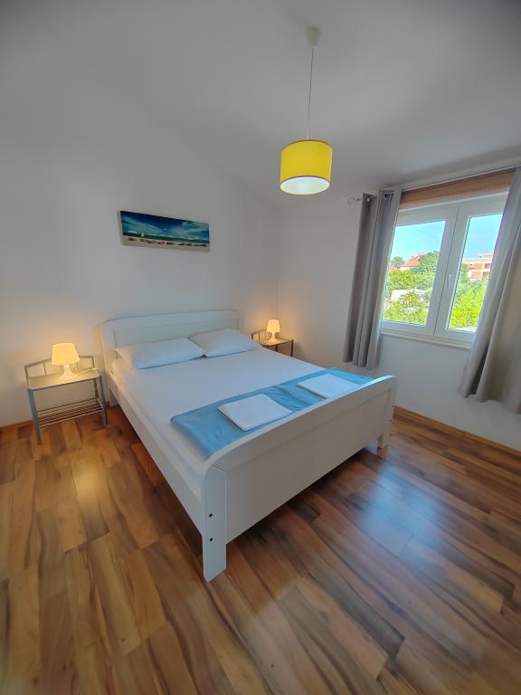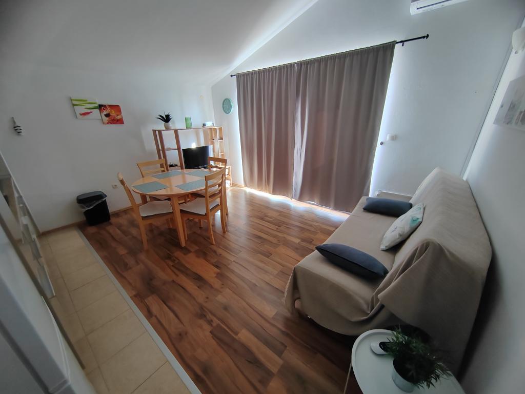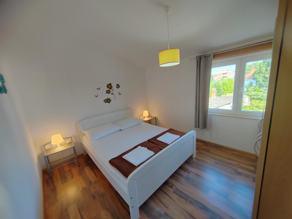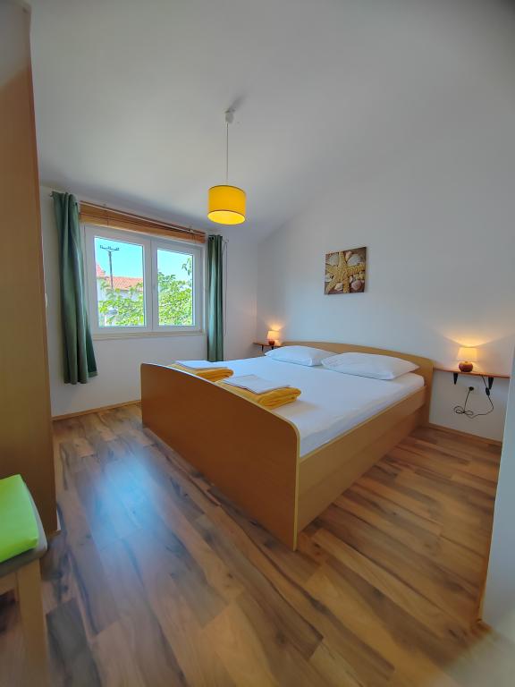 Nær centrum og stranden (150 m). To lejligheder ligger i et familiehus (på første sal), som ligger 150 m fra stranden og byens centrum. Hver lejlighed har to soveværelser, et badeværelse, en vaskemaskine, aircondition, et køkken med spiseplads og en sofa, en stor terrasse (20m2). Alt er inkluderet i prisen. Der er en grill i haven. Parkering er placeret foran huset i skyggen. Lejligheden er 70 m2 stor.