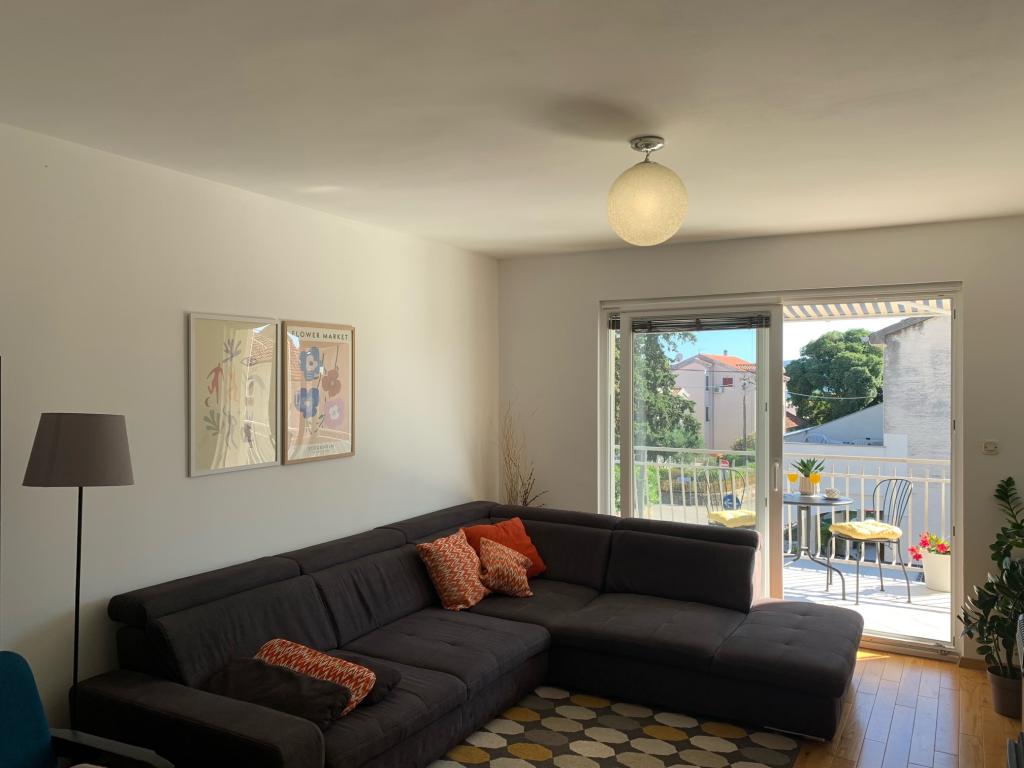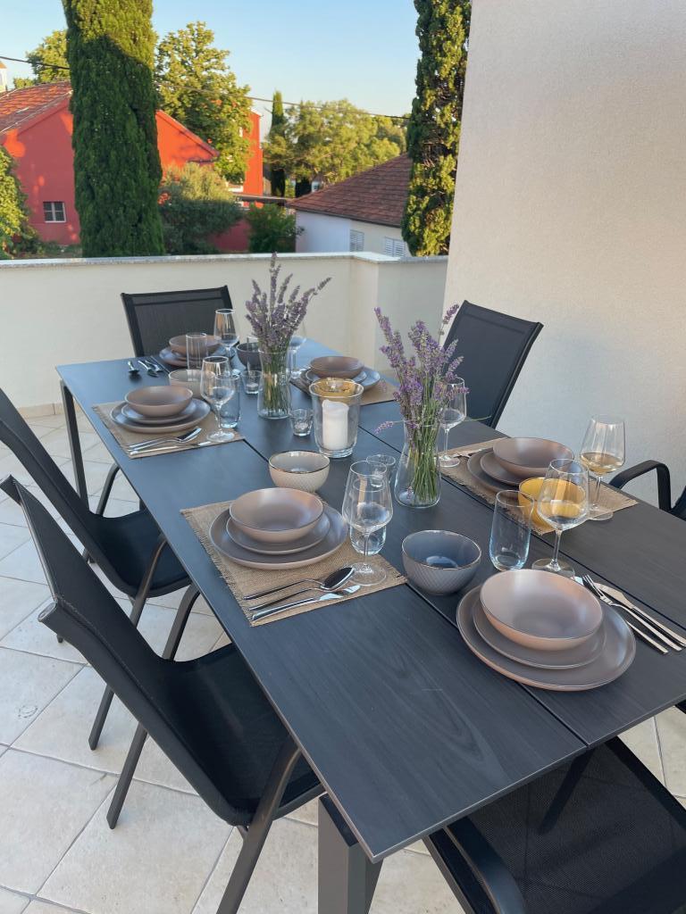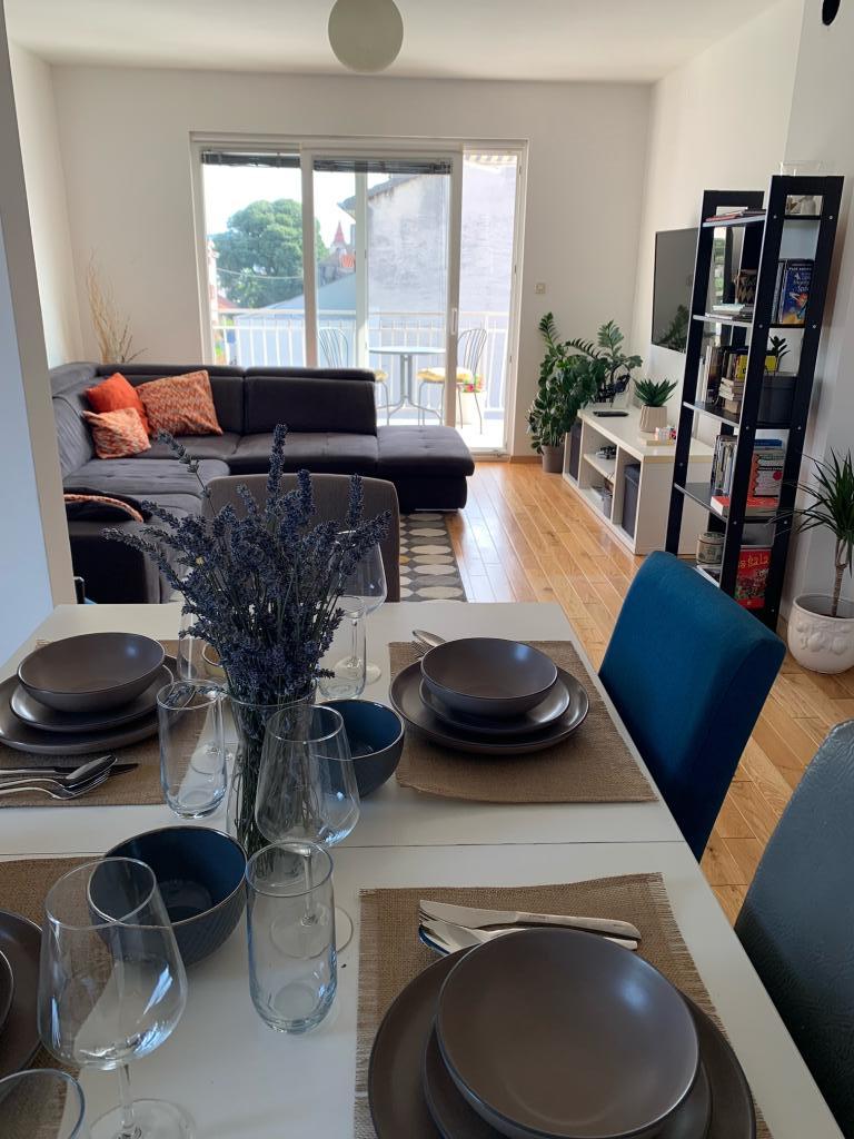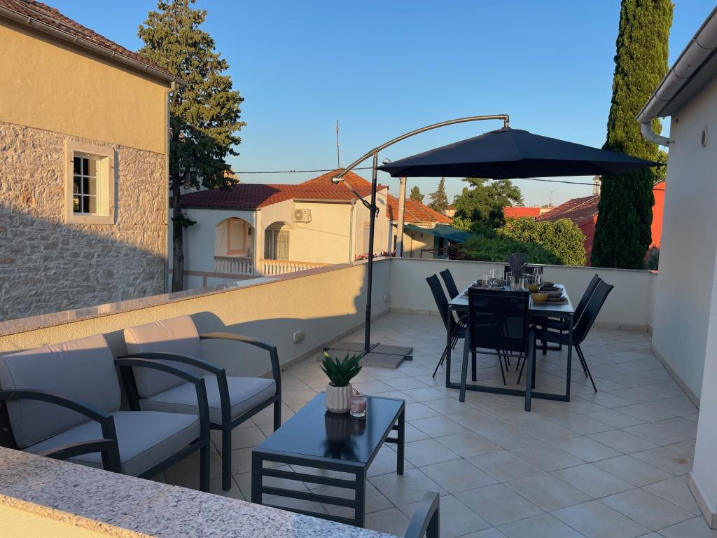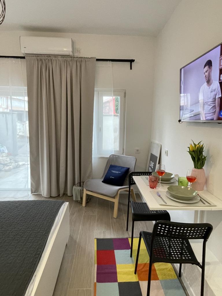 En fuldt udstyret studielejlighed med terrasse ligger i stueetagen af et familiehus i centrum af Sveti Filip i Jakov. Lejligheden med tre soveværelser, fuldt udstyret, med en stor terrasse med havemøbler er placeret på første sal af huset. Lejlighederne ligger 5 minutters gang fra den nærmeste strand (du kan vælge småsten, sand eller beton), restauranter, butikker, posthus, sportsfaciliteter, cafe barer... Parkering er forudsat foran huset og er inkluderet i prisen. En grill er også tilgængelig for gæster...