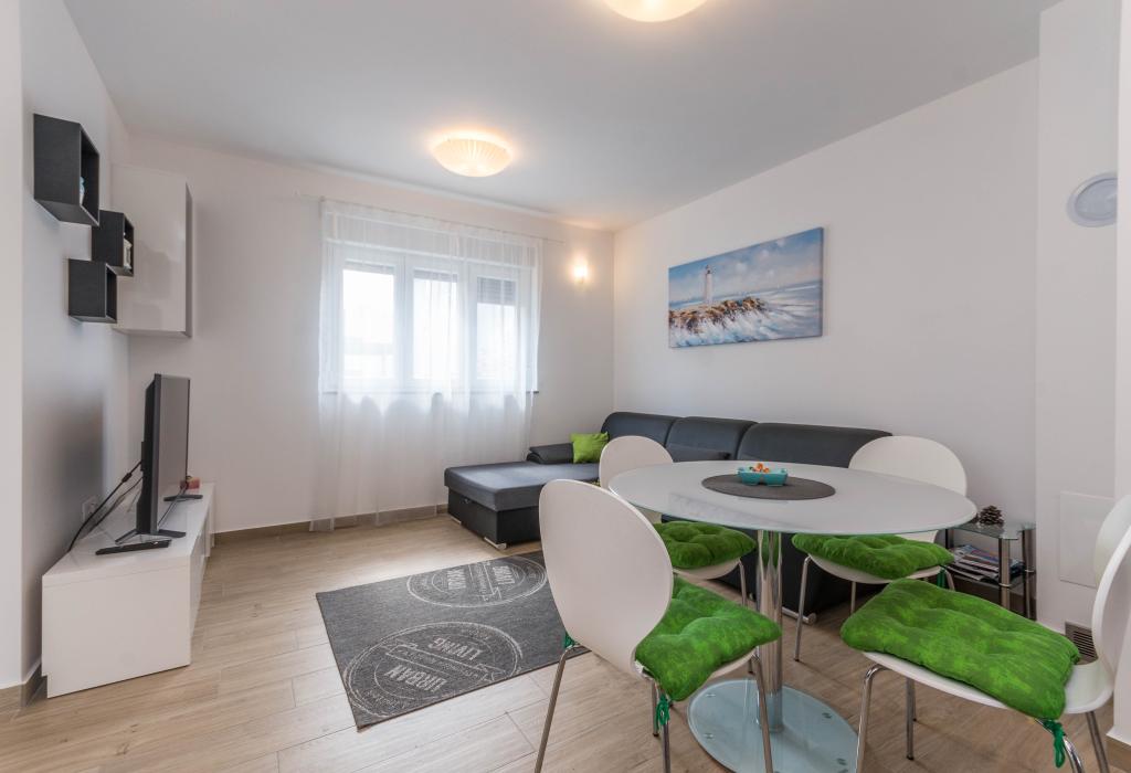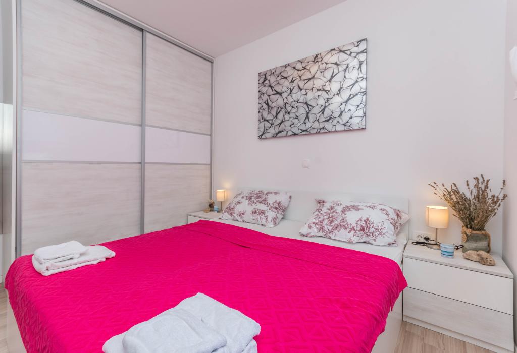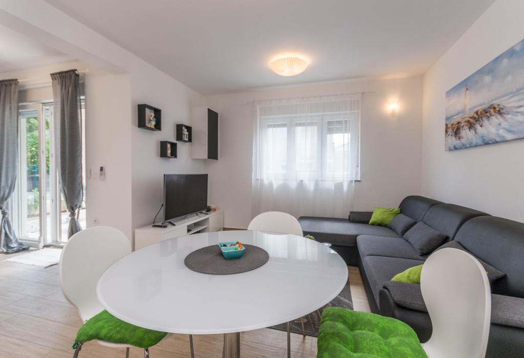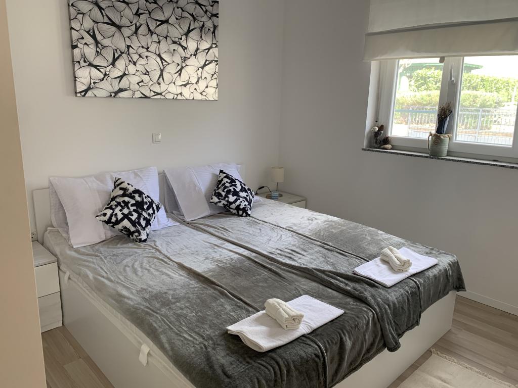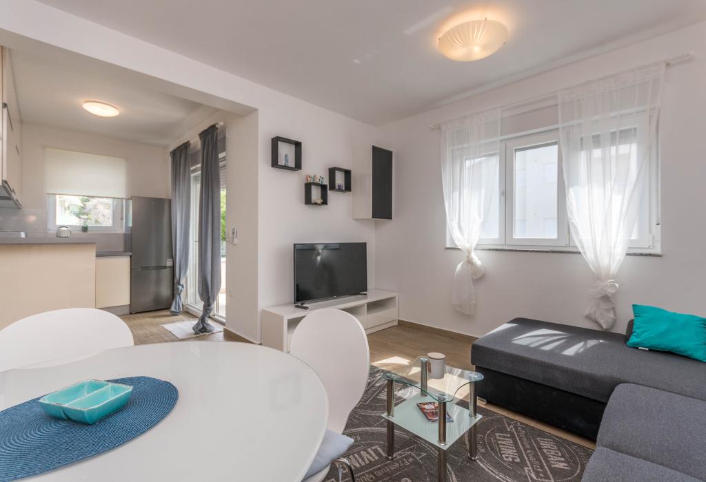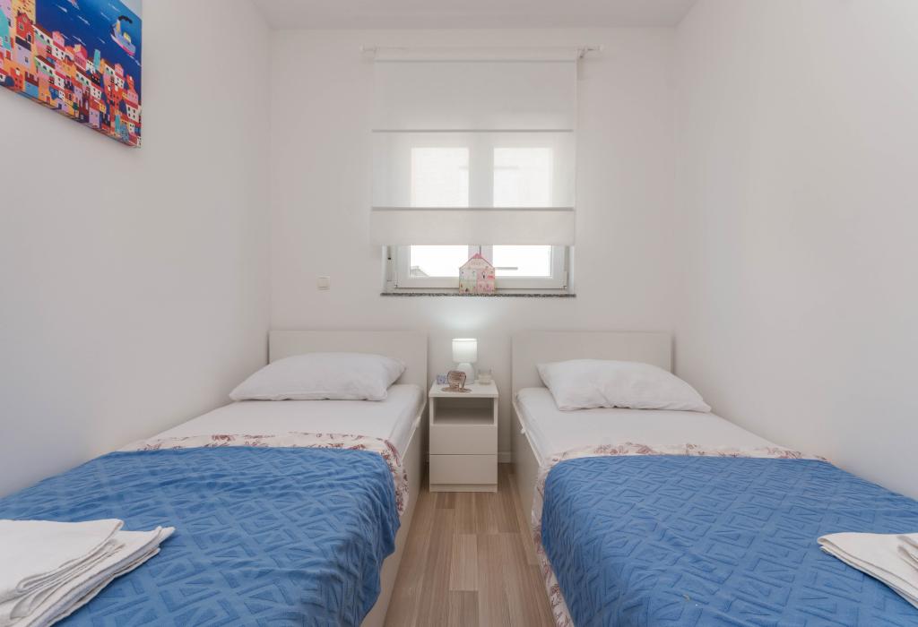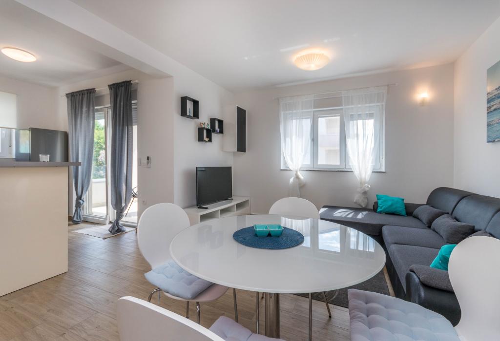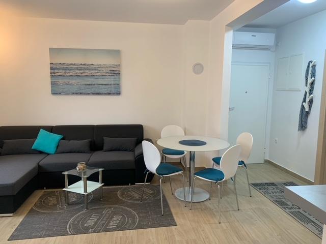 Bygningen er opført som et hus med 6 lejligheder, der bevidst blev bygget som fritliggende enheder (lejligheder), med separat indgang, inde i en fælles trappe. Lejlighed Turquoise 1 er velegnet til familier med børn, fordi den på 58 m2 byder på 2 soveværelser, et komfortabelt køkken med åben stue. Køkkenet indeholder opvaskemaskine, mikroovn, kaffemaskine, stort køleskab med fryser, el-komfur med ovn og keramisk kogeplade. I stuen er der 52" TV, gratis WIFI. Ved siden af stuen er der stor terrasse og gårdhave med grill. Badeværelset byder på vaskemaskine, hårtørrer, håndklæder og basale hygiejneprodukter. Lejligheden ligger 50m fra strand med små sten og kysten, 100 m fra centrum og øvrige faciliteter.Lejlighed 2 ligger på 1. sal i bygningen og har ingen brugsret til gården.Inde i badeværelset er der ingen vaskemaskine.