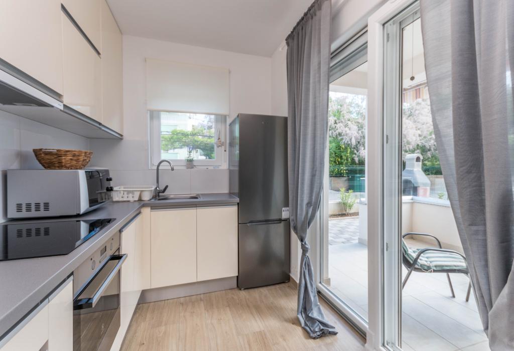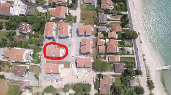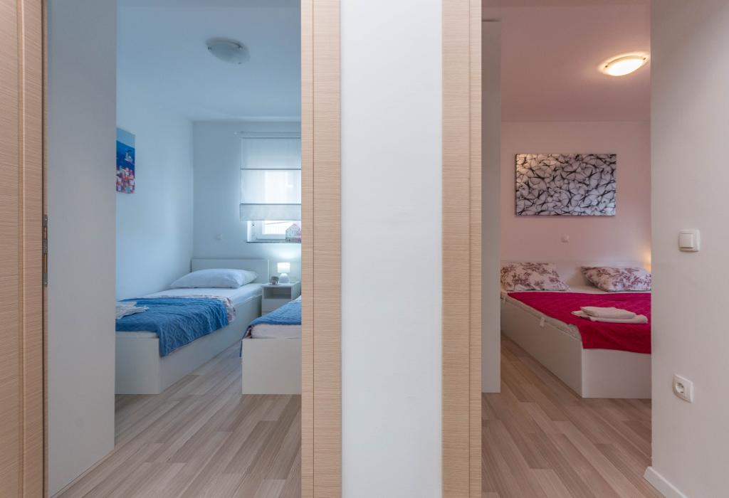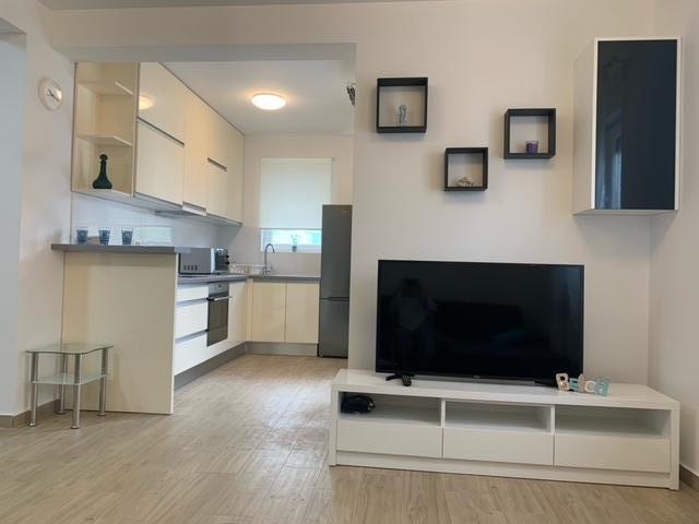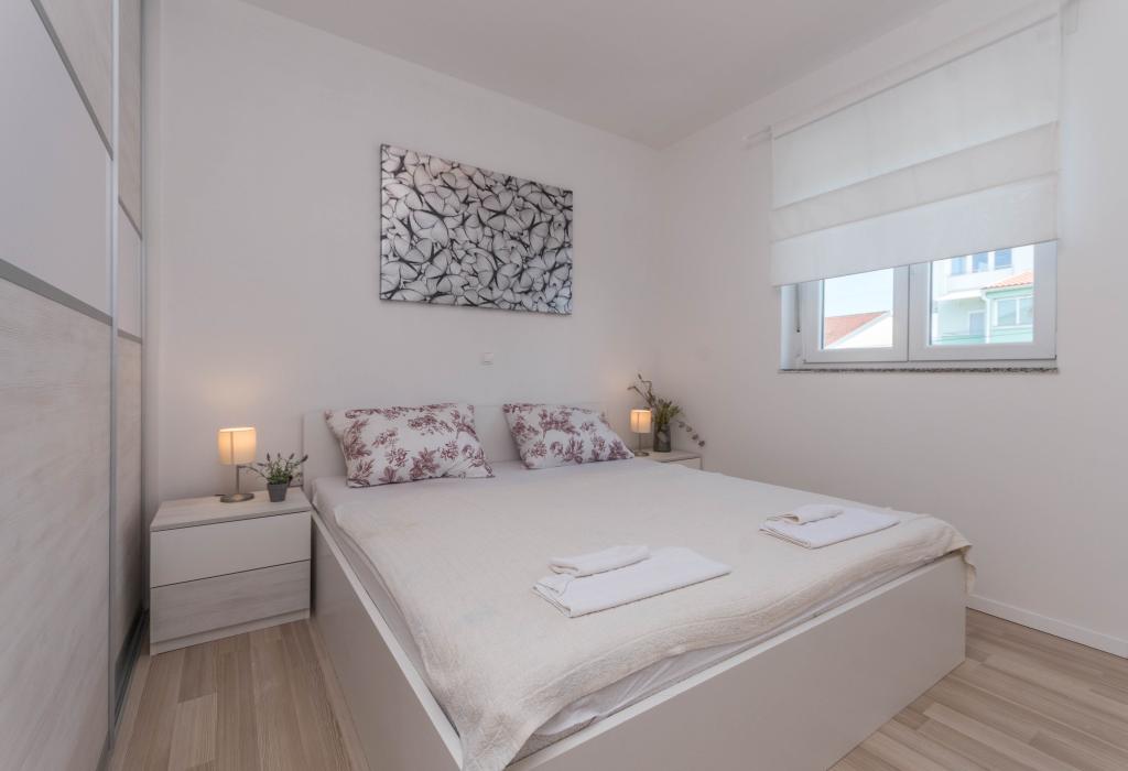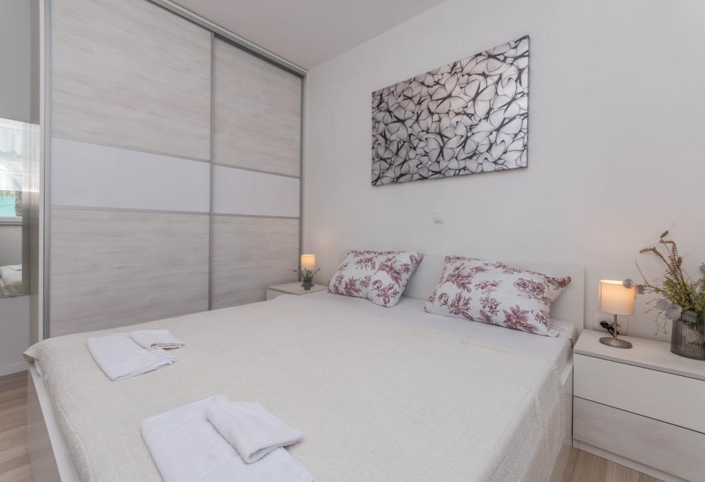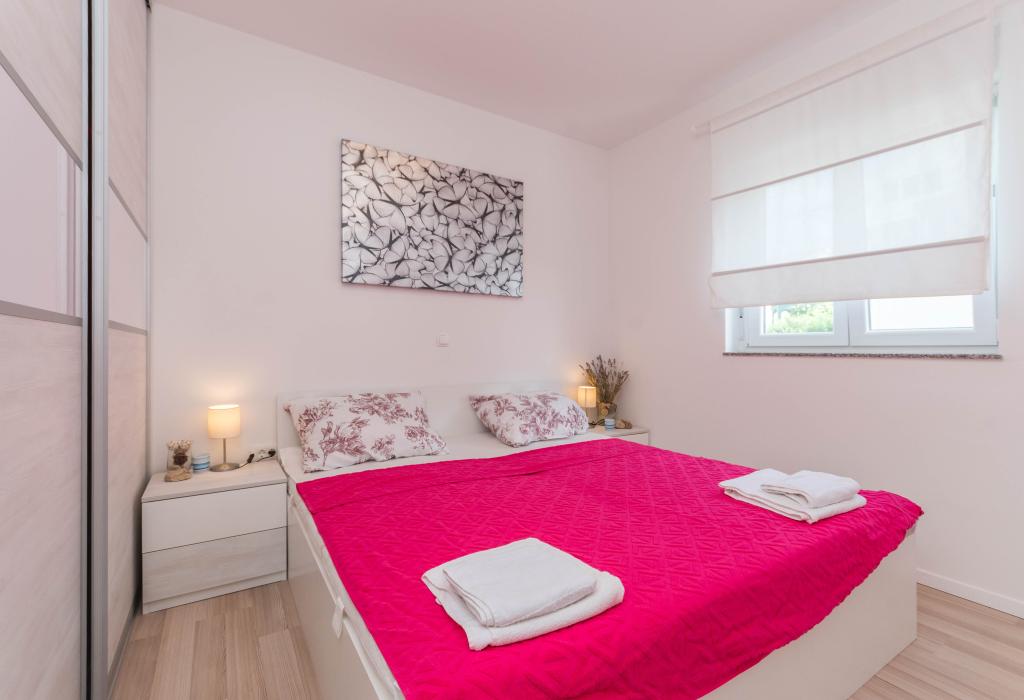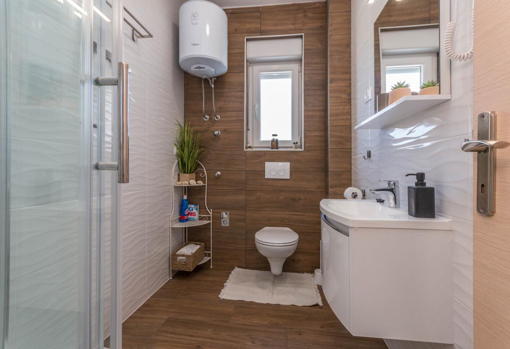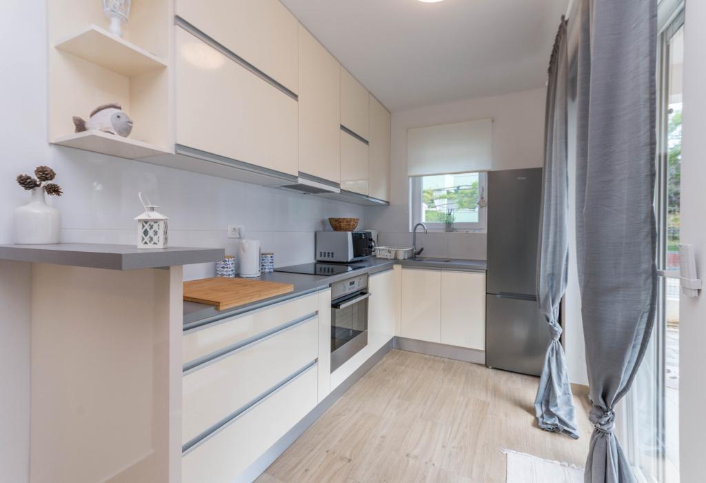 Bygningen er opført som et hus med 6 lejligheder, der bevidst blev bygget som fritliggende enheder (lejligheder), med separat indgang, inde i en fælles trappe. Lejlighed Turquoise 1 er velegnet til familier med børn, fordi den på 58 m2 byder på 2 soveværelser, et komfortabelt køkken med åben stue. Køkkenet indeholder opvaskemaskine, mikroovn, kaffemaskine, stort køleskab med fryser, el-komfur med ovn og keramisk kogeplade. I stuen er der 52" TV, gratis WIFI. Ved siden af stuen er der stor terrasse og gårdhave med grill. Badeværelset byder på vaskemaskine, hårtørrer, håndklæder og basale hygiejneprodukter. Lejligheden ligger 50m fra strand med små sten og kysten, 100 m fra centrum og øvrige faciliteter.Lejlighed 2 ligger på 1. sal i bygningen og har ingen brugsret til gården.Inde i badeværelset er der ingen vaskemaskine.