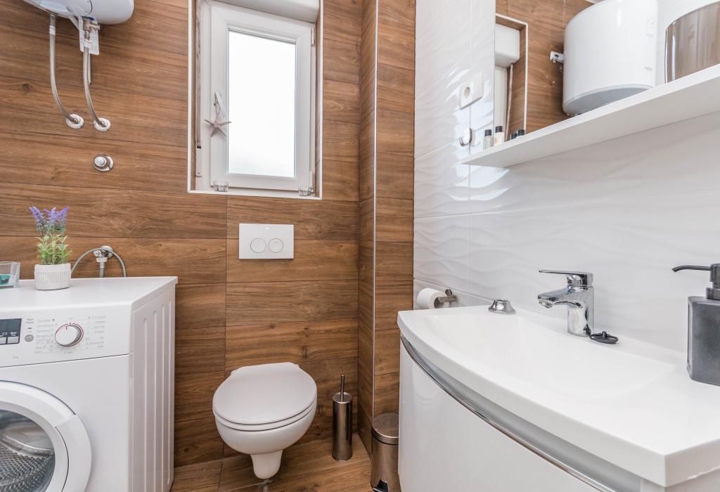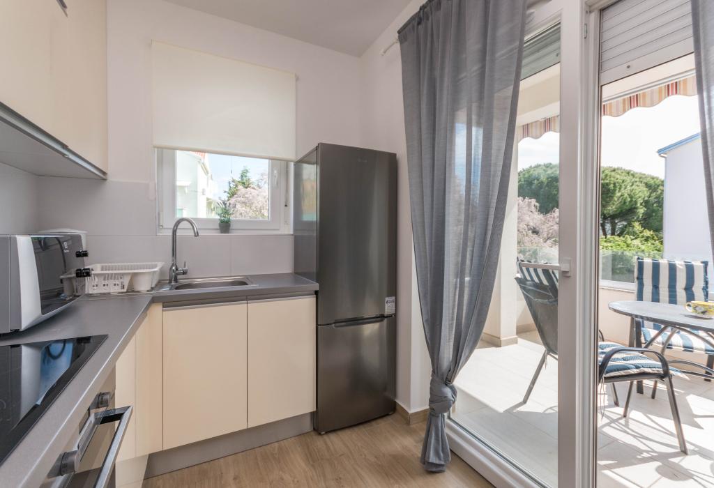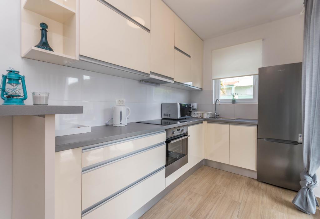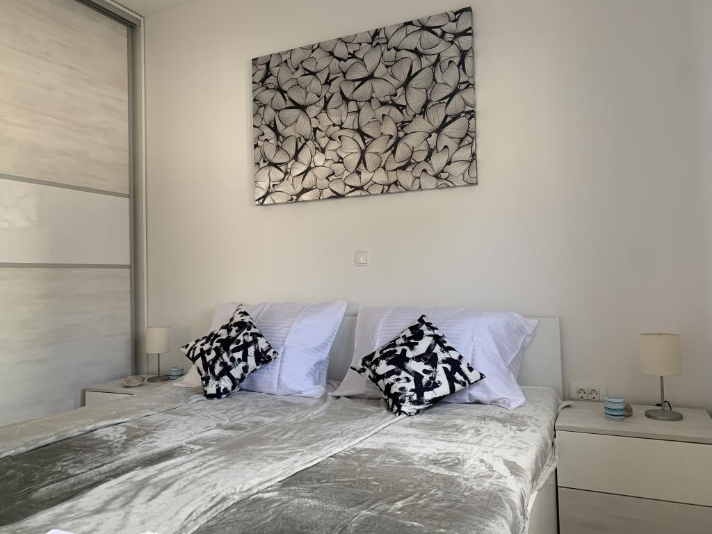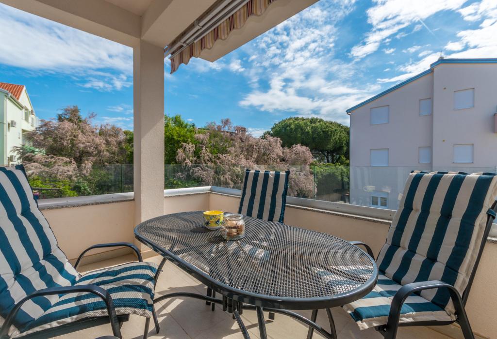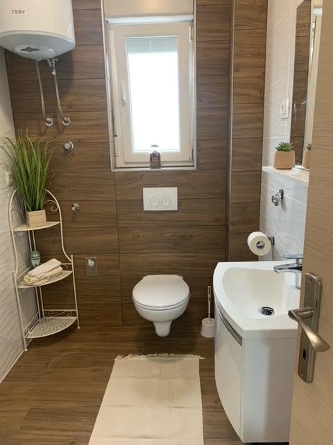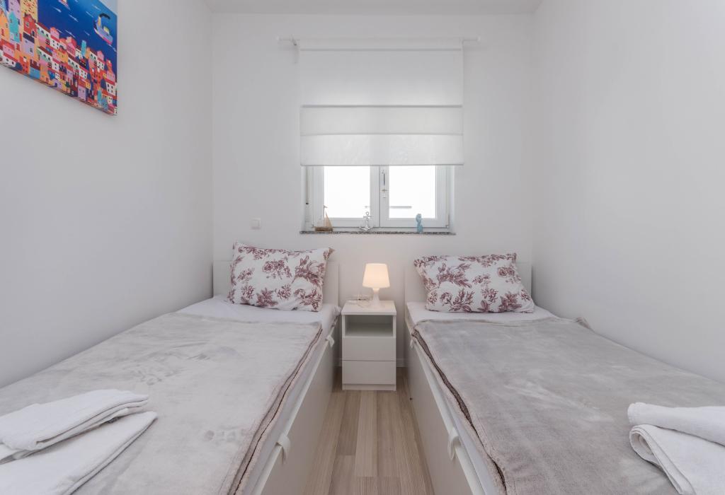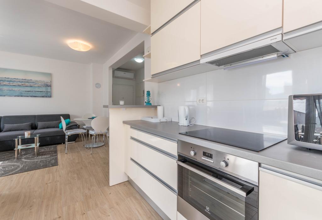 Bygningen er opført som et hus med 6 lejligheder, der bevidst blev bygget som fritliggende enheder (lejligheder), med separat indgang, inde i en fælles trappe. Lejlighed Turquoise 1 er velegnet til familier med børn, fordi den på 58 m2 byder på 2 soveværelser, et komfortabelt køkken med åben stue. Køkkenet indeholder opvaskemaskine, mikroovn, kaffemaskine, stort køleskab med fryser, el-komfur med ovn og keramisk kogeplade. I stuen er der 52" TV, gratis WIFI. Ved siden af stuen er der stor terrasse og gårdhave med grill. Badeværelset byder på vaskemaskine, hårtørrer, håndklæder og basale hygiejneprodukter. Lejligheden ligger 50m fra strand med små sten og kysten, 100 m fra centrum og øvrige faciliteter.Lejlighed 2 ligger på 1. sal i bygningen og har ingen brugsret til gården.Inde i badeværelset er der ingen vaskemaskine.