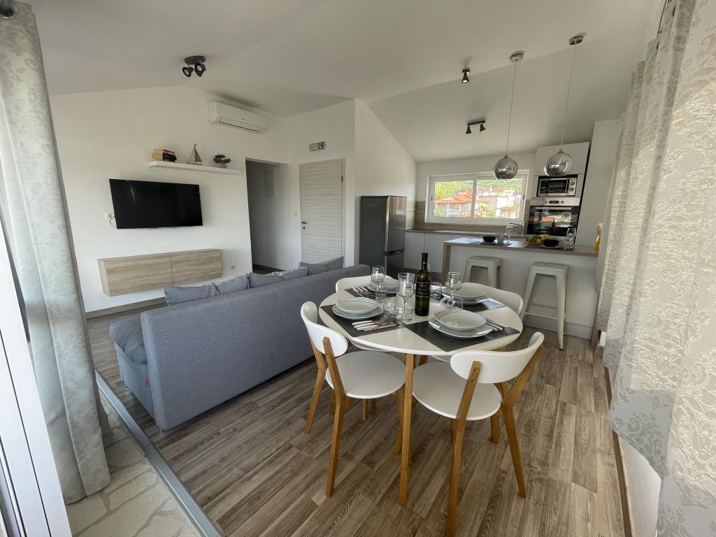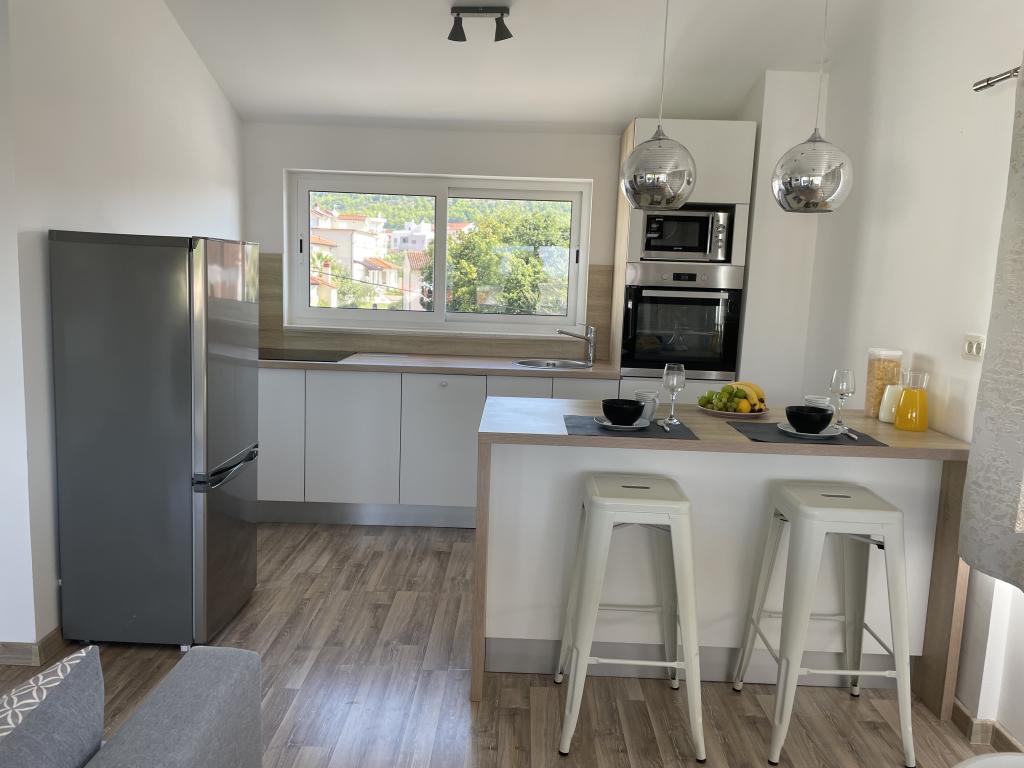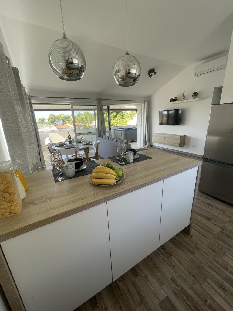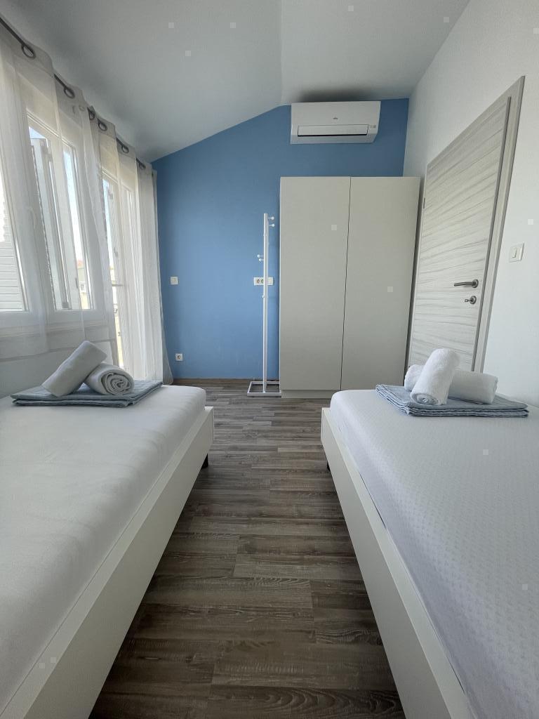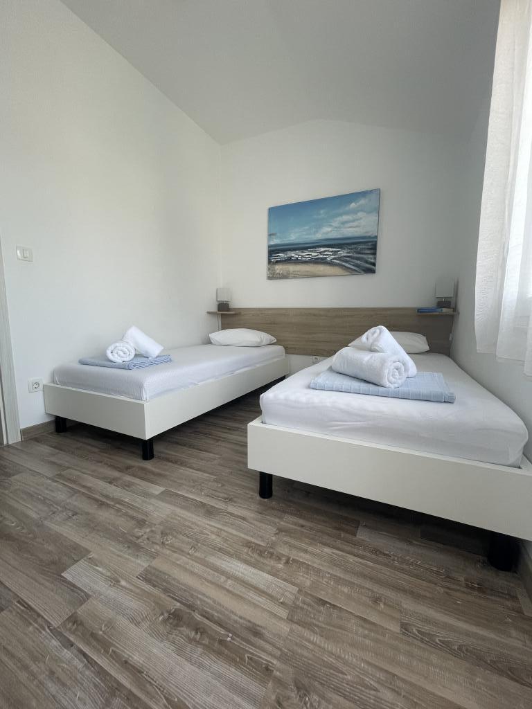 Fuldt og moderne udstyrede lejligheder i et roligt område, kun 300 m fra stranden med mange faciliteter. Lejlighederne ligger på anden sal i et familiehus, i den indhegnede have kan du nyde et overdækket område til socialt samvær med et sommerkøkken og grill. Privat parkering er placeret foran gården. 50 m fra huset er der et busstoppested, og 200 m fra huset ligger den første butik. Bymidten ligger 800 m væk, du kan nå den via vejen eller via promenaden, der strækker sig langs havet. Vi elsker dyr, men vi er ikke kæledyrsvenlige.