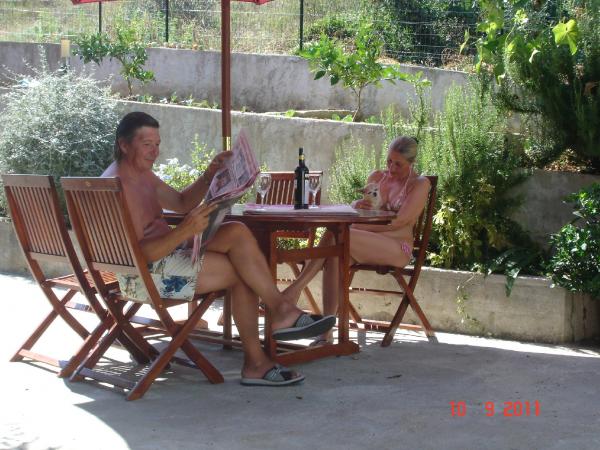 Med sin kone drikker kaffe, og genopretter minder om to uger siden da vi tilbragte den sjette sæson med familien Maravic. Jeg kan kun sige alt det bedste. Meget gæstfrie locals. Tak for den meget gode grillet fisk, samt blæksprutte ris og blæksprutte forberedt af Rada. Vi fangede også et par fisk selv ved hjælp af Dražens vært, hvem er også en fremragende samtalepartner. Lejlighederne er meget velholdte, rene og kun få skridt fra havet. Familie Maravic endnu en gang TAKK for hyggelige dage i dit miljø. Vi kommer.