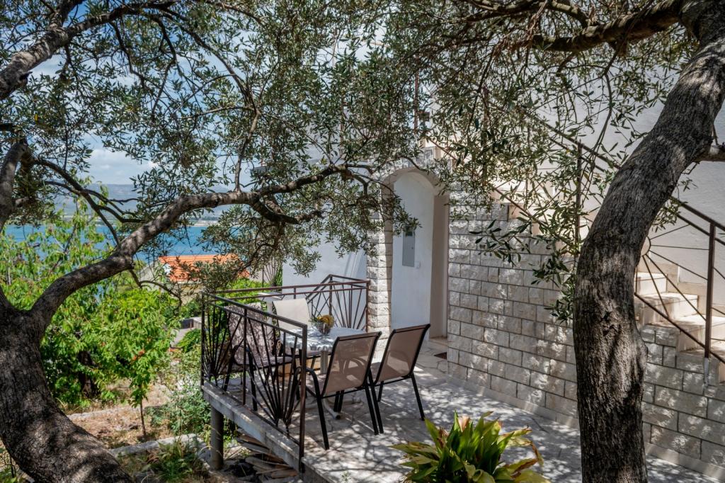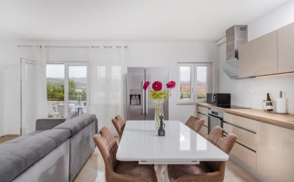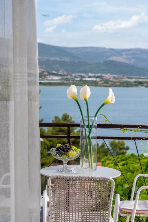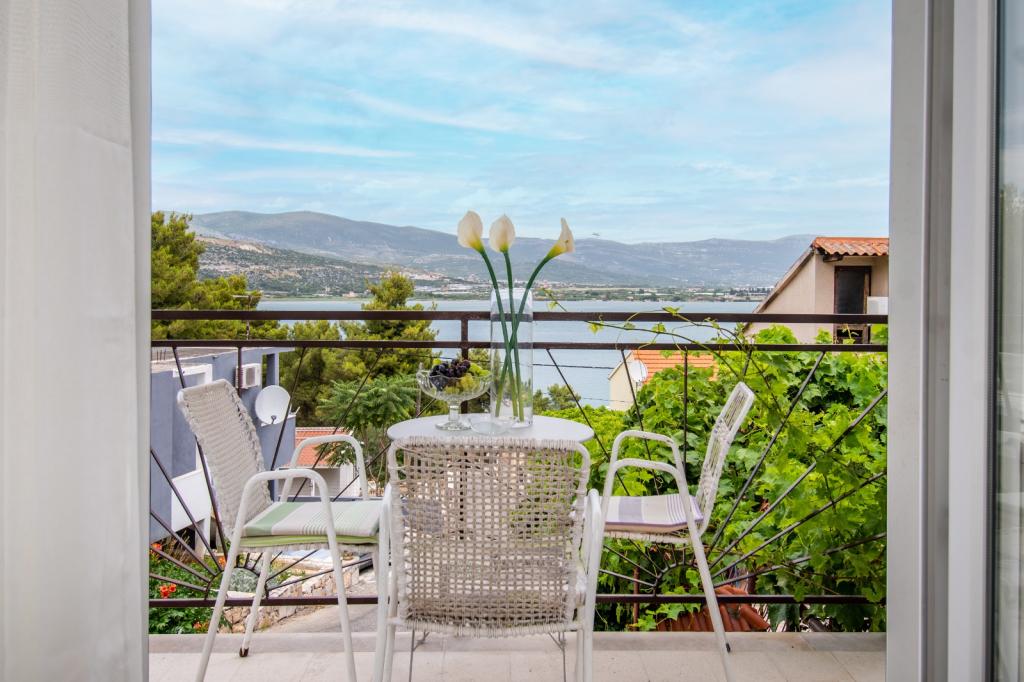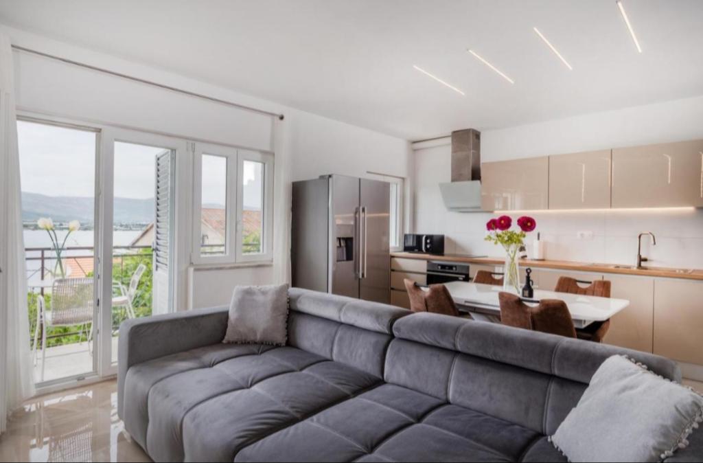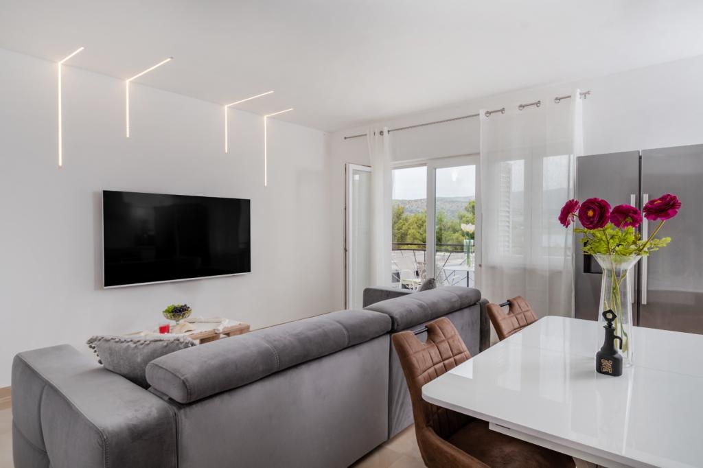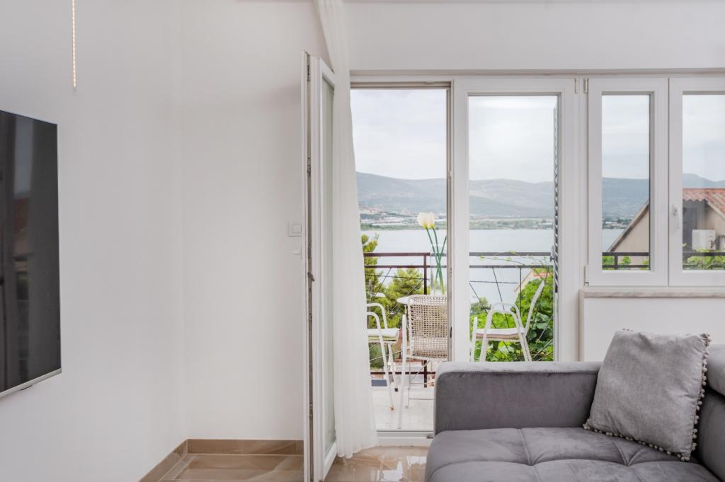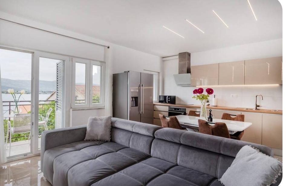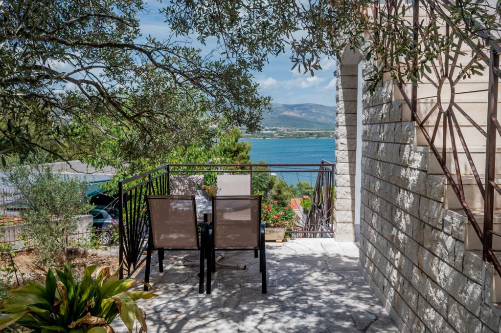 Meget luksuriøs lejlighed 1 minut fra havet. Hele lejligheden er udstyret med den nyeste højsansteknologi, hvor hvert værelse har sit eget klimaanlæg, stort videovæg-tv, og hvert værelse har et separat en-suite toilet, så hver gæst har sit eget privatliv. Køkkenet er udstyret med nye højsans hvidevarer med opvaskemaskine, mikroovn, kaffemaskine, køleskab med ismaskine. Lejligheden har en smuk have og en terrasse med udsigt over havet og ligger 5 minutters kørsel fra Split lufthavn. Der er en skøn sandstrand 10 m fra lejligheden. Det har en fremragende beliggenhed, kun 2 minutter fra centrum af Trogir og 20 minutters kørsel fra centrum af Split. Ikke langt fra lejligheden ligger en taxabåd, der tager gæsterne til centrum af Split og til søs.