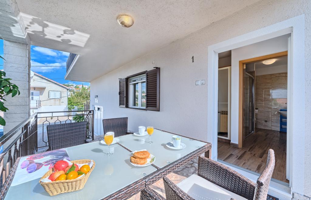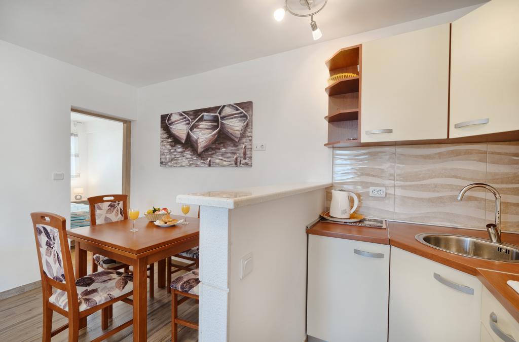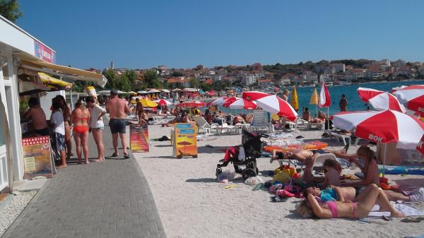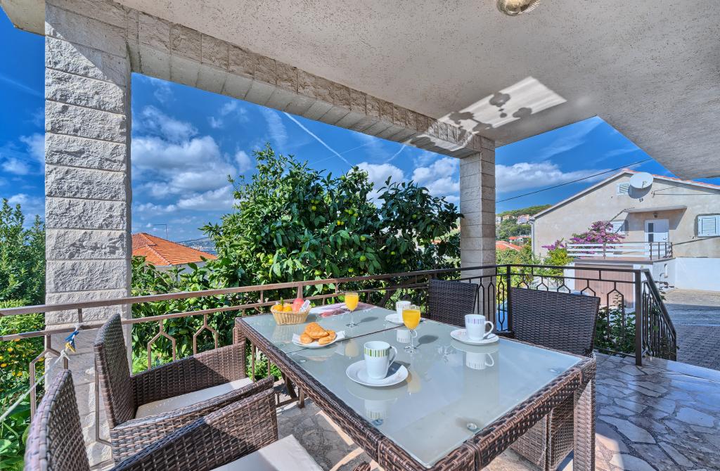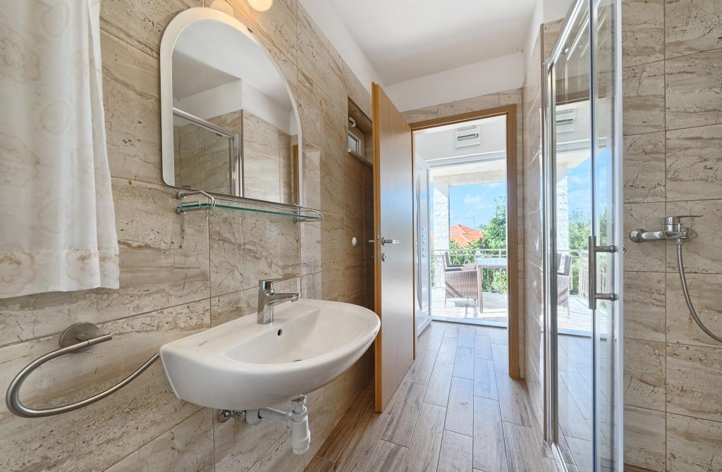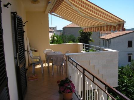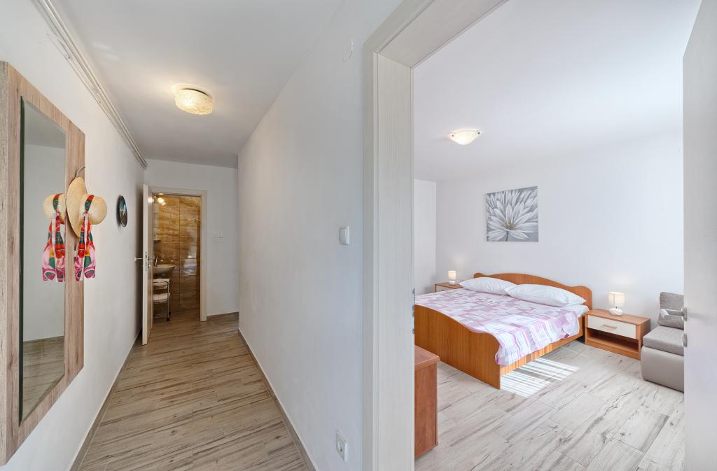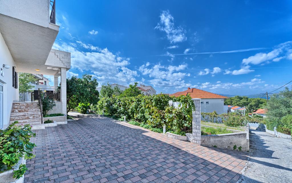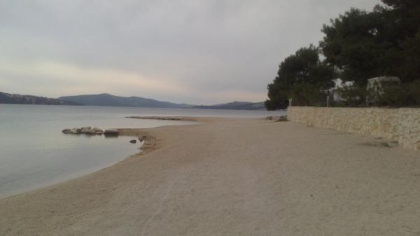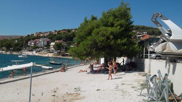 Lejligheder Bareta ligger på øen Ciovo, Trogir kommune. De er beliggende i en fantastisk beliggenhed for dem, der ønsker at nyde solen og havet, såvel som for dem, der ønsker at blive bekendt med de historiske og naturlige skønheder i Mellem-Dalmatien. UNESCOs gamle bydel i Trogir ligger kun 1000 m væk, mens Split (Diocletians palads, færger til øer), Omiš, Cetina (rafting, kløft, klatring), Krka-vandfald og Šibenik ligger inden for 50 km. Split lufthavn ligger kun 5 km væk. Lejlighederne ligger i stueetagen i et familiehus omgivet af have og grønt. Hver lejlighed har sin egen indgang og en stor terrasse med spisebord, parkering og grill og udendørs bruser er mulige. Lejlighederne består af en stue tilsluttet køkkenet, et soveværelse (seng 2 1, 2 2), muligvis to voksne med to børn, et badeværelse med toilet. Lejlighederne er fuldt udstyret med alt hvad du behøver for et behageligt ophold / opvask, sengetøj osv.) Tr