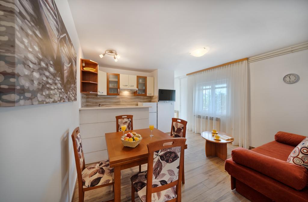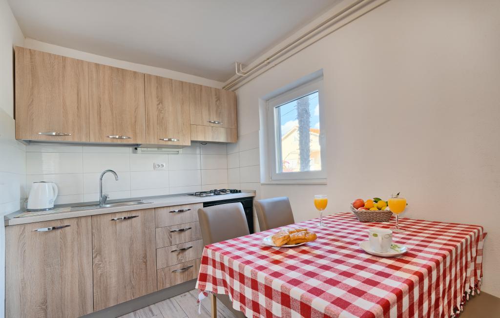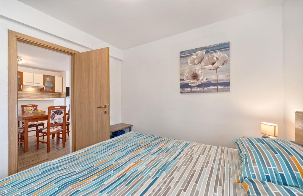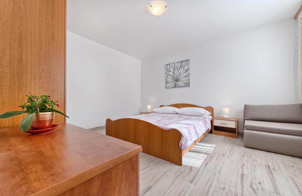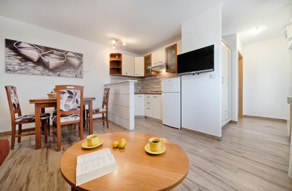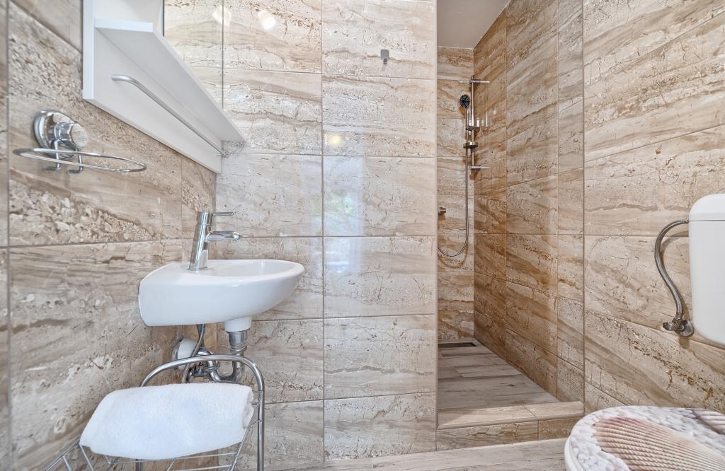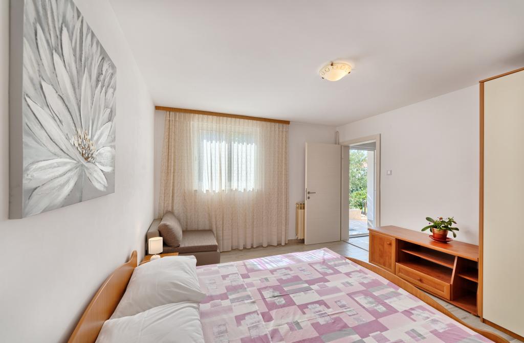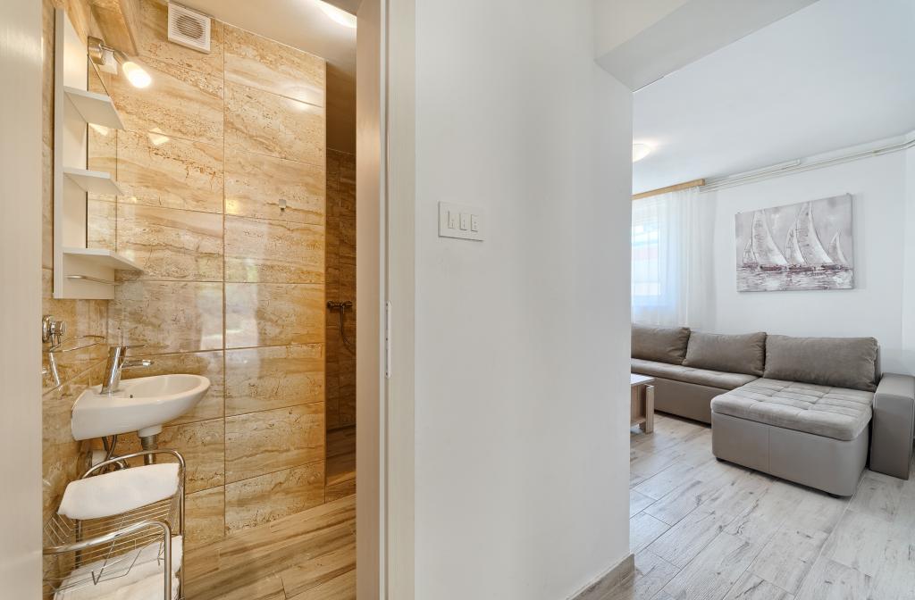 Lejligheder Bareta ligger på øen Ciovo, Trogir kommune. De er beliggende i en fantastisk beliggenhed for dem, der ønsker at nyde solen og havet, såvel som for dem, der ønsker at blive bekendt med de historiske og naturlige skønheder i Mellem-Dalmatien. UNESCOs gamle bydel i Trogir ligger kun 1000 m væk, mens Split (Diocletians palads, færger til øer), Omiš, Cetina (rafting, kløft, klatring), Krka-vandfald og Šibenik ligger inden for 50 km. Split lufthavn ligger kun 5 km væk. Lejlighederne ligger i stueetagen i et familiehus omgivet af have og grønt. Hver lejlighed har sin egen indgang og en stor terrasse med spisebord, parkering og grill og udendørs bruser er mulige. Lejlighederne består af en stue tilsluttet køkkenet, et soveværelse (seng 2 1, 2 2), muligvis to voksne med to børn, et badeværelse med toilet. Lejlighederne er fuldt udstyret med alt hvad du behøver for et behageligt ophold / opvask, sengetøj osv.) Tr
