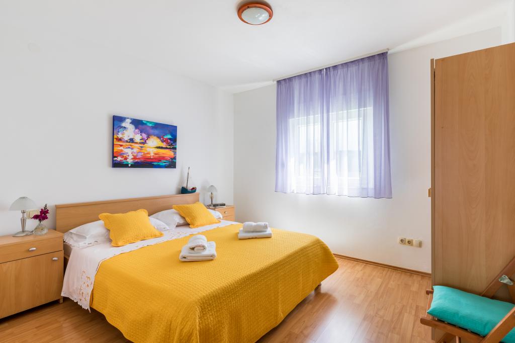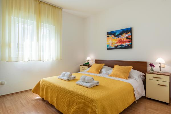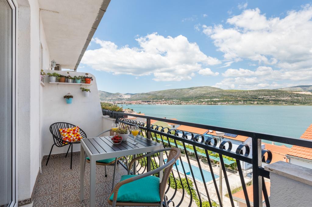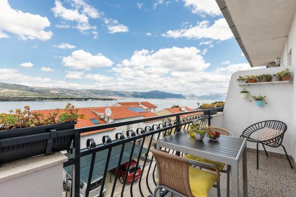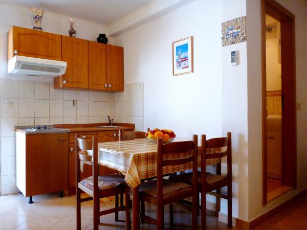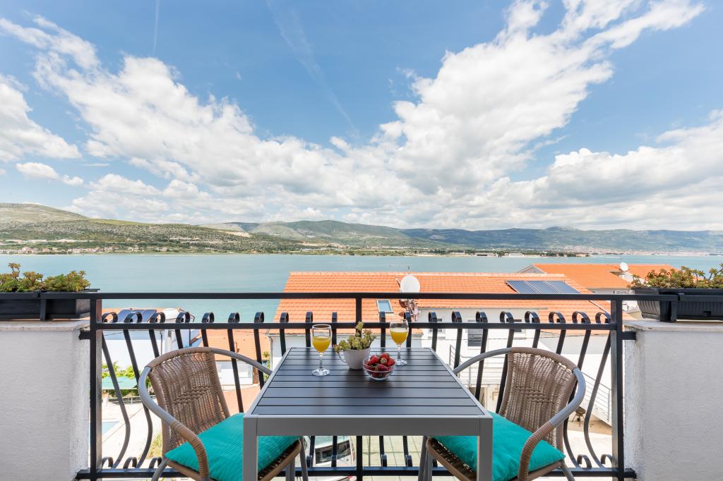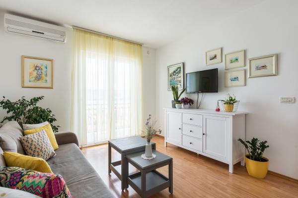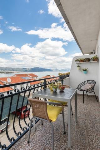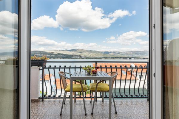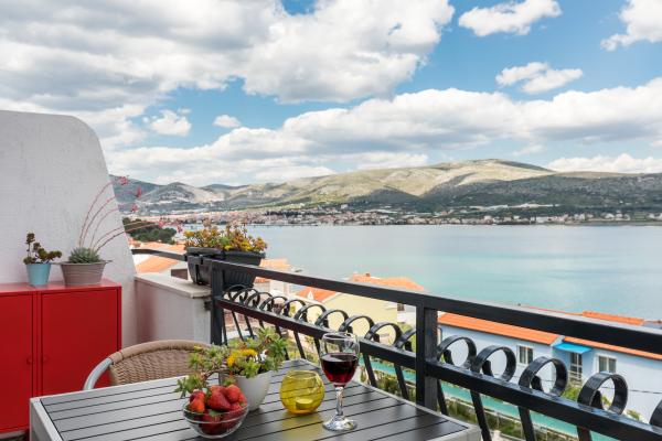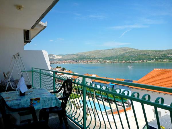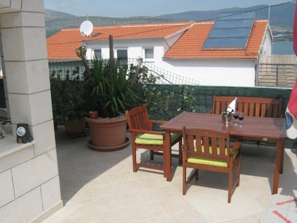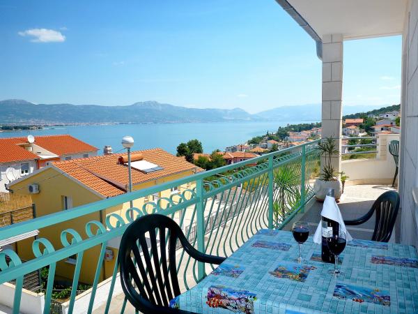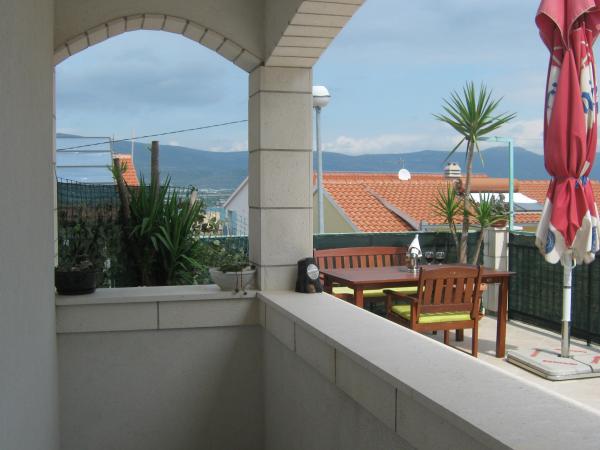 Ros! Arrangement og reservation af indkvartering var hurtig. Ejere venlige, vi blev mødt i køleskabet af en forfriskning drink efter turen, som var velkommen efter trafikproppen. Lejligheden er yderst ren, pæn og pænt møbleret. Udsigten fra balkonen glædede os. Roligt og fredeligt miljø, parkering til rådighed. Vi tog en let gåtur for at besøge Trogir. Priserne på øen er virkelig fine, fx 2 store kaffe betalte vi 12 kn. Strandene er tæt på. Og ja, i sidste ende fik vi et lille tegn på opmærksomhed, som er vidunderligt. Vi var virkelig begejstrede. Et reelt eksempel på, hvordan turismen skal se ud.