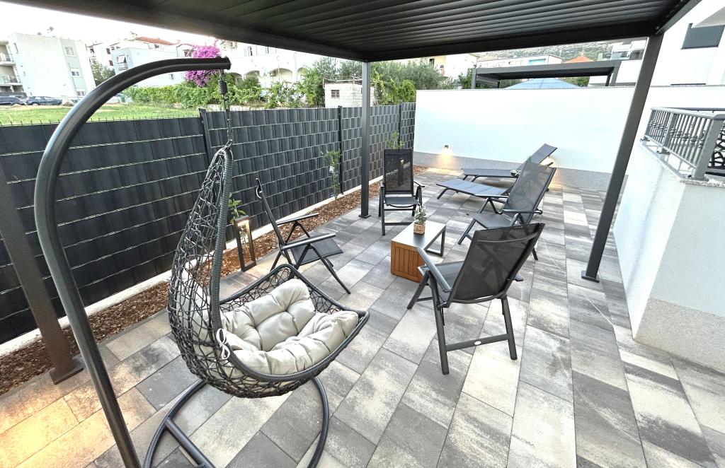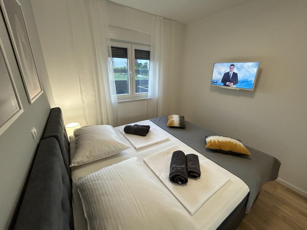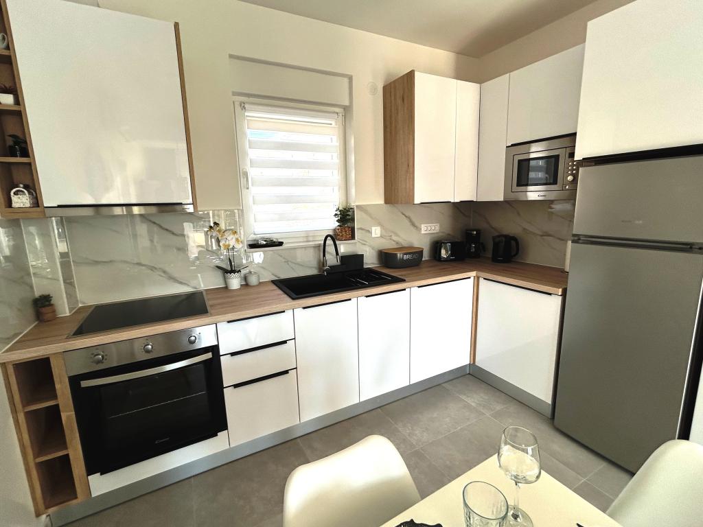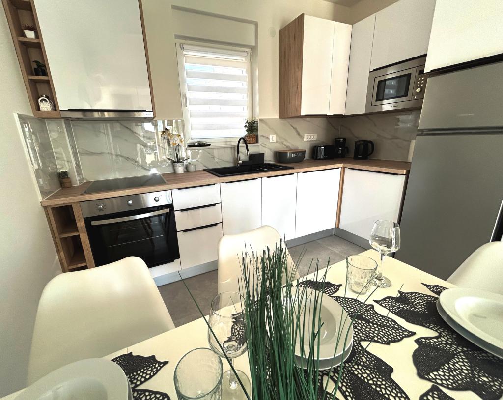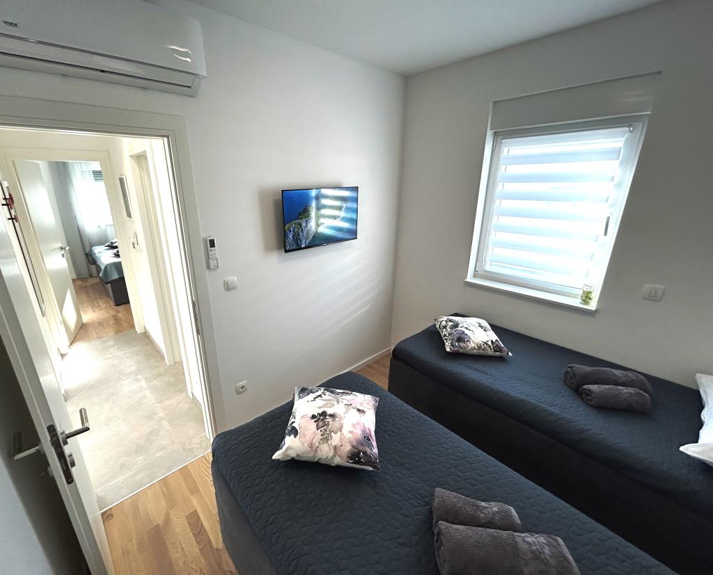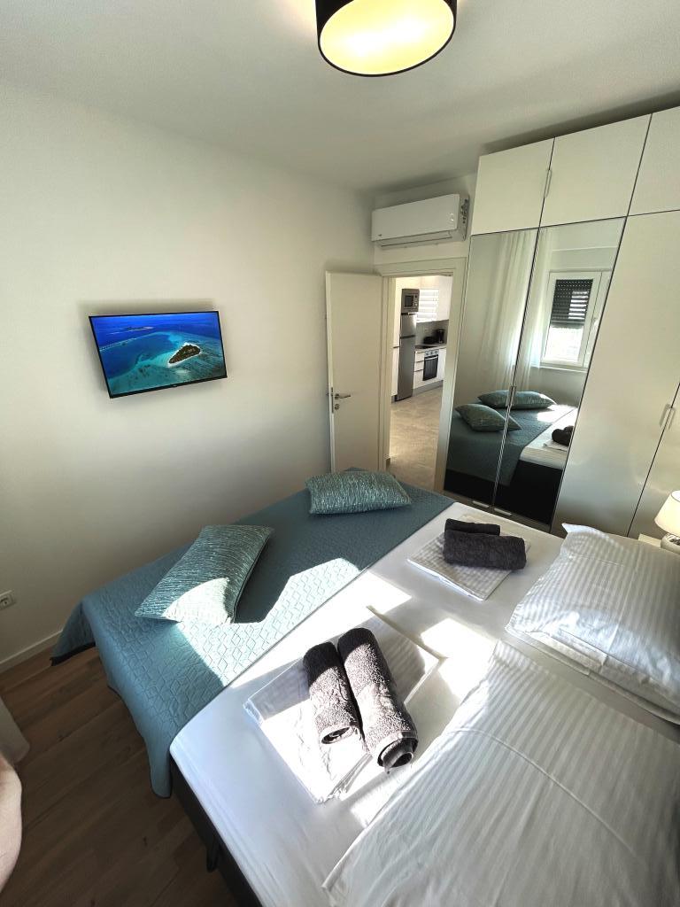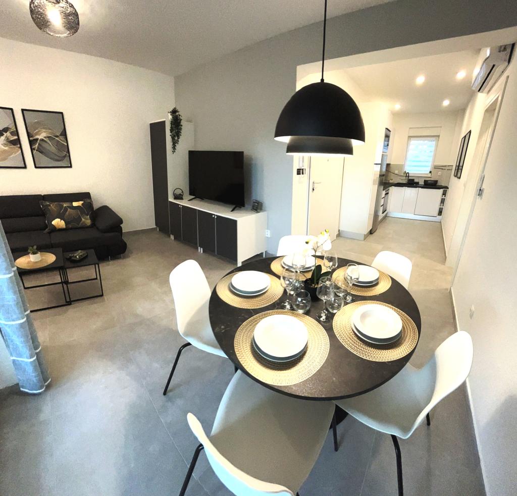Town Trogir Apartments ligger på fastlandet i Trogir med en førsteklasses beliggenhed, kun 400 m fra den gamle bymidte og 1000 m fra den nye bystrand. Stranden kan nås via en promenade langs havet. Alle de vigtigste faciliteter er inden for gåafstand, 5 til 10 minutters gang. Town Trogir Apartments er nye og ligger i en lille boligbygning med 6 lejligheder. Lejlighederne har et areal på cirka 60 m2. Lejlighederne er placeret i stueetagen, 1. sal og 2. sal. Lejlighederne er moderne indrettede og fuldt udstyrede. Lejlighederne har 2 soveværelser, en stue med spisestue, et fuldt udstyret køkken, et badeværelse og store terrasser med havemøbler i stueetagen. Stuen og soveværelserne har separate køleenheder. Der er gratis parkering foran bygningen. Sengelinned og håndklæder er inkluderet. WiFi er gratis. Turistskat er inkluderet i prisen.
