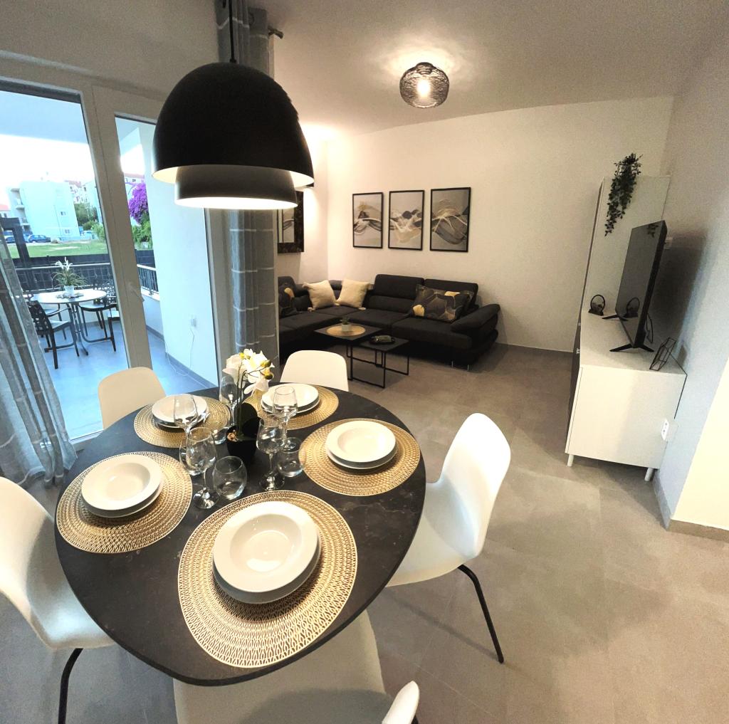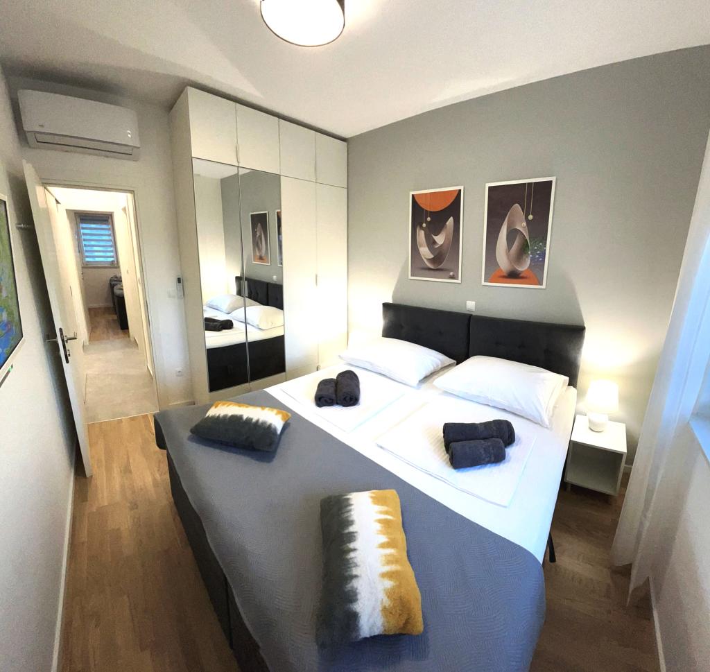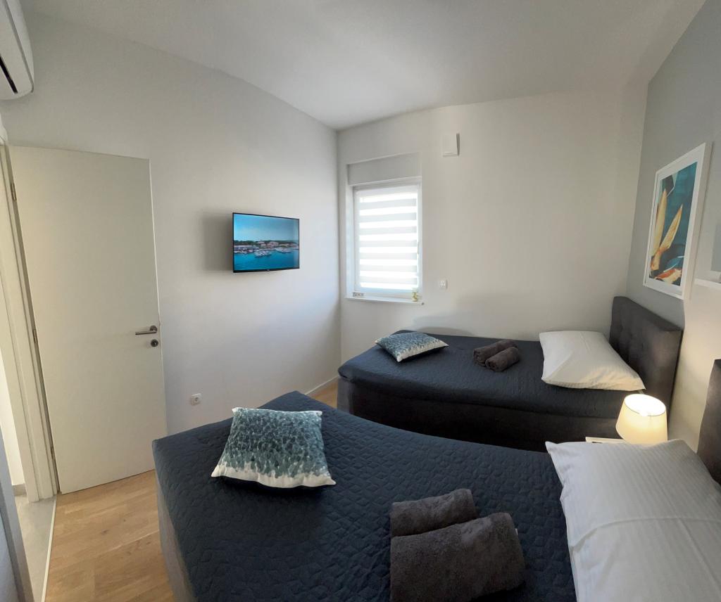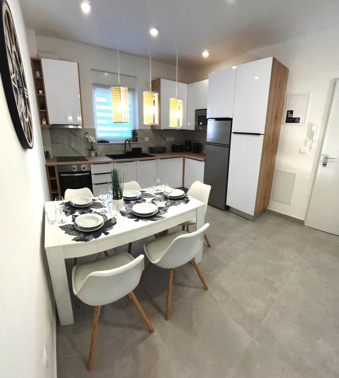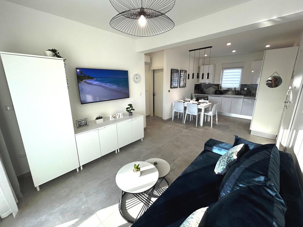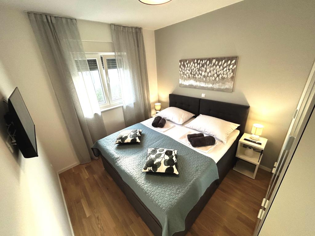 Town Trogir Apartments ligger på fastlandet i Trogir med en førsteklasses beliggenhed, kun 400 m fra den gamle bymidte og 1000 m fra den nye bystrand. Stranden kan nås via en promenade langs havet. Alle de vigtigste faciliteter er inden for gåafstand, 5 til 10 minutters gang. Town Trogir Apartments er nye og ligger i en lille boligbygning med 6 lejligheder. Lejlighederne har et areal på cirka 60 m2. Lejlighederne er placeret i stueetagen, 1. sal og 2. sal. Lejlighederne er moderne indrettede og fuldt udstyrede. Lejlighederne har 2 soveværelser, en stue med spisestue, et fuldt udstyret køkken, et badeværelse og store terrasser med havemøbler i stueetagen. Stuen og soveværelserne har separate køleenheder. Der er gratis parkering foran bygningen. Sengelinned og håndklæder er inkluderet. WiFi er gratis. Turistskat er inkluderet i prisen.