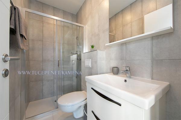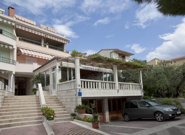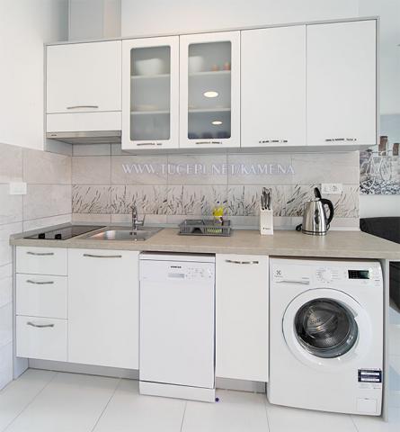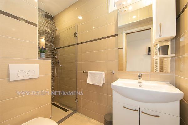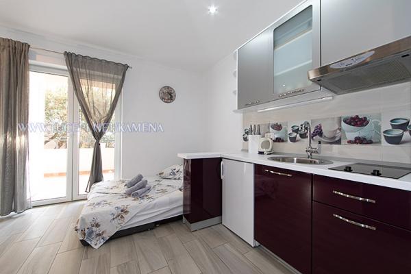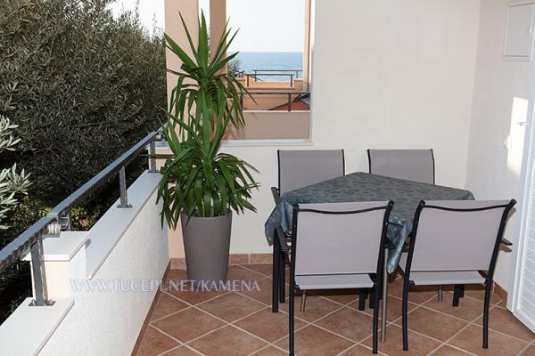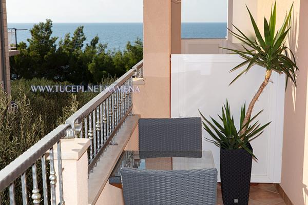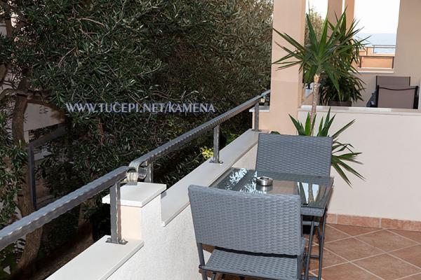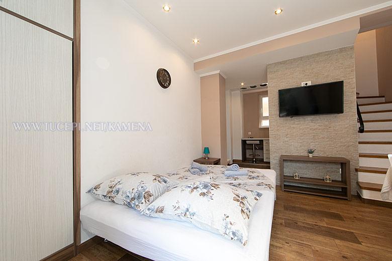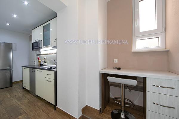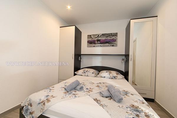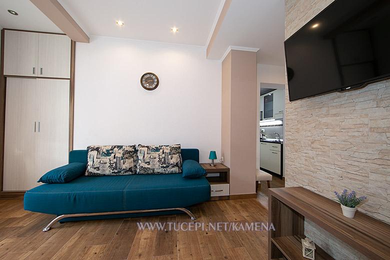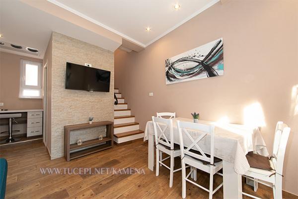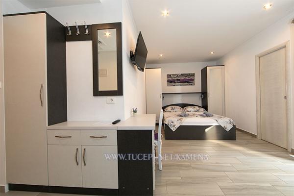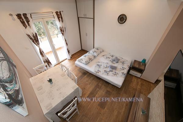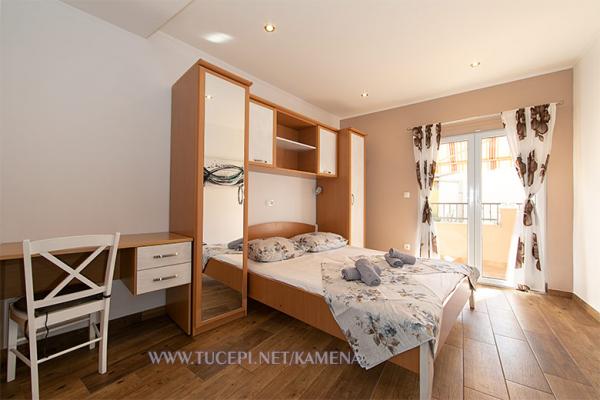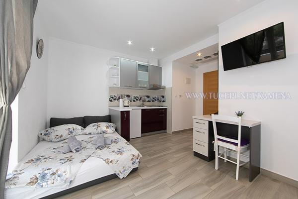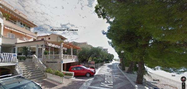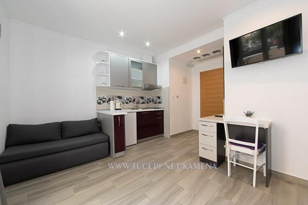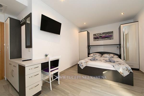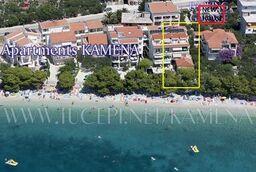 Lejligheder Kamena er beliggende i en rolig del af Tučepi, beliggende på første række til havet. Vi tilbyder moderne udstyrede lejligheder og studielejligheder til 2, 3, 4, 5 og 6 personer med parkeringsplads til hver lejlighed. Alle vores lejligheder har aircondition, TV, satellit, Wi-Fi og alt nødvendigt køkken- og badeværelsesudstyr. Vores bygning huser også vores familierestaurant Kamena, hvor du kan prøve det traditionelle dalmatiske køkken med et fremragende udvalg af kroatiske vine. I umiddelbar nærhed er der også en strandcafé til eftermiddagskaffe eller en cocktail ved havet. Byens centrum med talrige caféer, restauranter, posthus og apotek ligger 300 m væk.