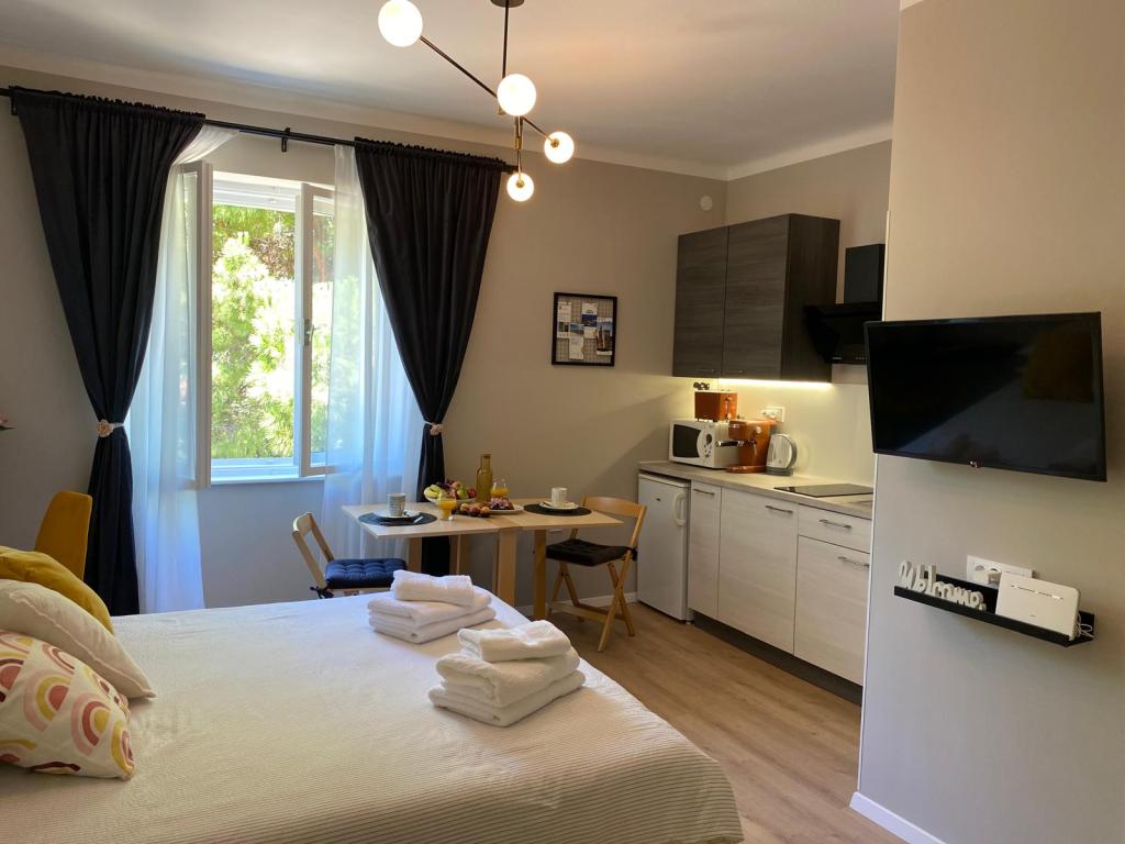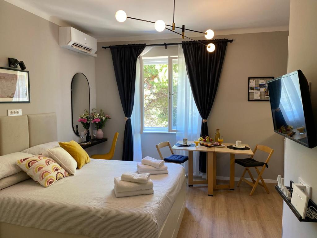 Studiolejligheden "Victor 27" er en charmerende indkvartering i en rolig beliggenhed i byens centrum tæt på alle interessante faciliteter. Takket være den optimale beliggenhed ved starten af havnefronten kan du gå lange ture, cykle eller nyde en tur med panoramatoget langs Umags kyst. Grønne fyrretræer kan ses fra vinduet, og i baggrunden kan man se havet og den gamle byhavn. Studiolejligheden ligger på anden sal uden elevator. Der er ingen balkon. Parkering er gratis i bygningen. Efter forudgående anmodning er det muligt at tilføje en tredje seng til børn, og der er også mulighed for at bruge en cykel (dette bestemmes ved booking).
