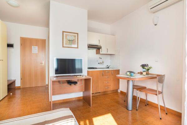 Lejligheder Villa Vienna er beliggende i Zambratija, en stille fiskerby, kun 300 m fra den nærmeste sandstrand og 3 km fra Umag centrum. Huset ligger i slutningen af en stille gade med næsten ingen biltrafik og er omgivet af skove, vinmarker og olivenlunde. I nabolaget kan du købe lokale sæsonbetonede frugter og grøntsager samt hjemmelavet olivenolie. I nærheden af huset er der nogle af de mange sportsfaciliteter (beachvolleyball, tennisbaner, ridning, cykelstier, paragliding, dykning osv.). En dagsudflugter med båd fra Umag til den berømte italienske by Venedig er også de yderste yndlingsfaciliteter blandt gæsterne. De klimatiserede og pænt indrettede lejligheder lover en fremragende ferie i en behagelig atmosfære! Indkvartering enheder A4 2, Studio 1 (a) og A3 er beliggende i stueetagen, mens Studio, Studio 1 (b) og A4 1 er placeret på første sal. WiFi og parkering i gården er gratis!