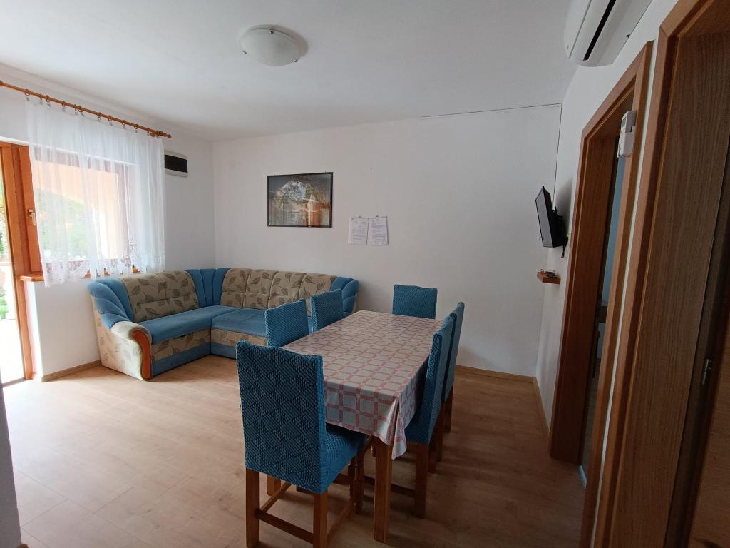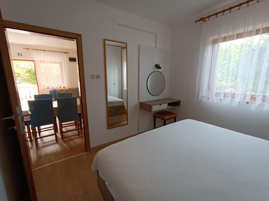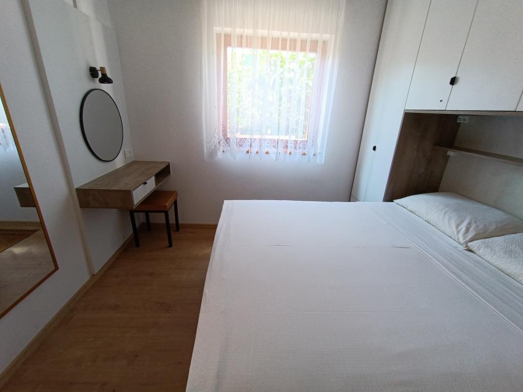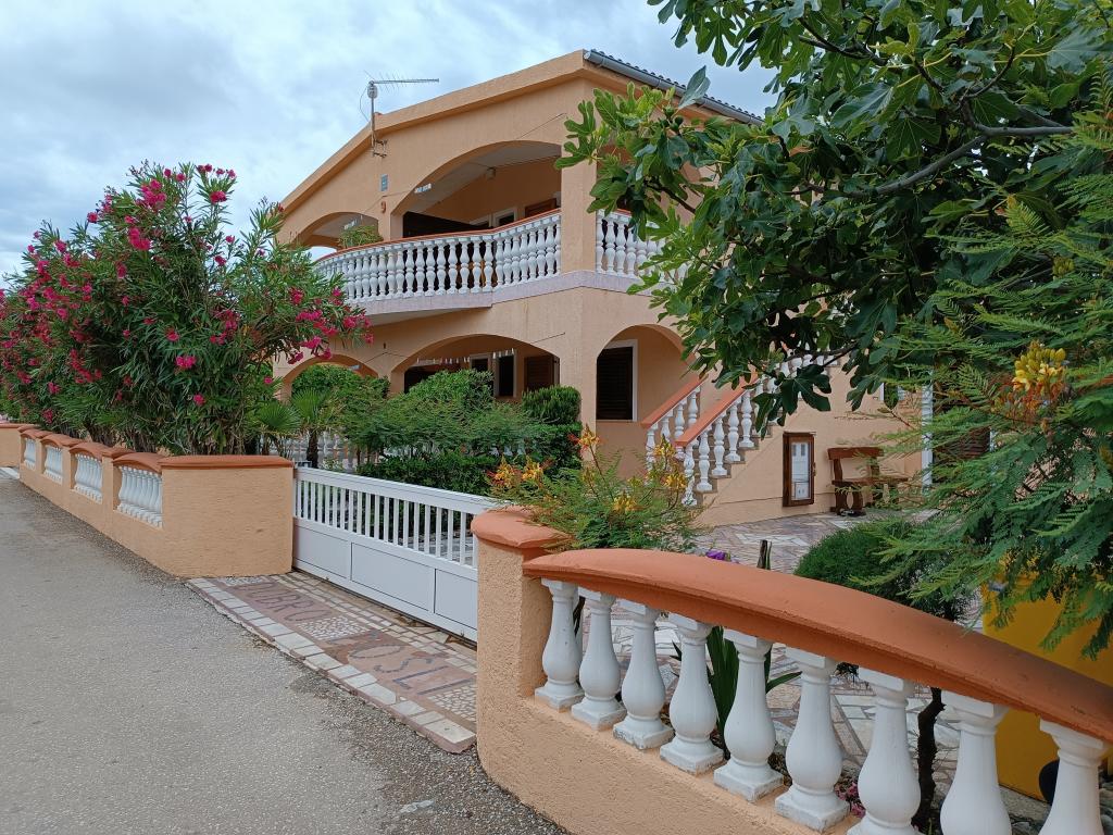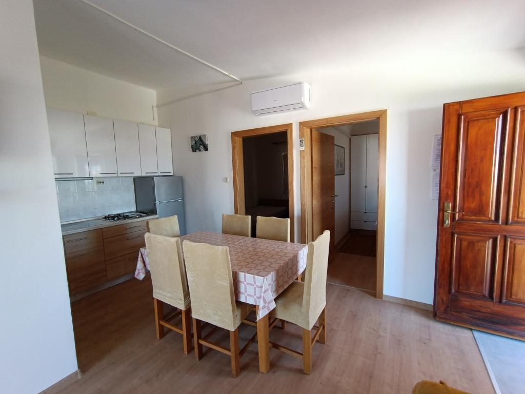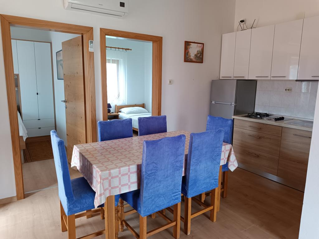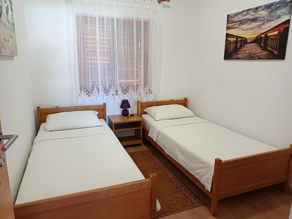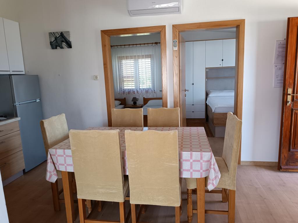 Vi udlejer tre identiske større lejligheder med aircondition til 4 personer, og en mindre lejlighed til to personer. En større er i stueetagen til venstre og to på første sal. Den mindre er i stueetagen til højre. Større lejligheder har to soveværelser og en stue, mens mindre lejligheder har et soveværelse og en stue. Hver lejlighed har en separat indgang og en terrasse på 12 kvadratmeter. I lejlighederne får du alt sengetøj og service til madlavning og servering af mad og drikke. Gæster bedes medbringe egne midler til opvask og aftørring samt håndklæder til badeværelset og alt til personlig hygiejne. Den nærmeste strand (Žitna uvala) ligger 100 m væk Udenfor på stranden er der grus, og i vandet er der sand. Den er velegnet til børn. Der er en lang promenade og cykelsti langs stranden. Der er flere restauranter og en isbar på stranden. Inden for en radius af 150-250 meter er der en frugtbutik, et bageri, flere dagligvarebutikker og butikker med strandudstyr. Vores gade er ikke befærdet. Det bruges kun af sine lejere og gæster. Den er asfalteret og har offentlig belysning.
