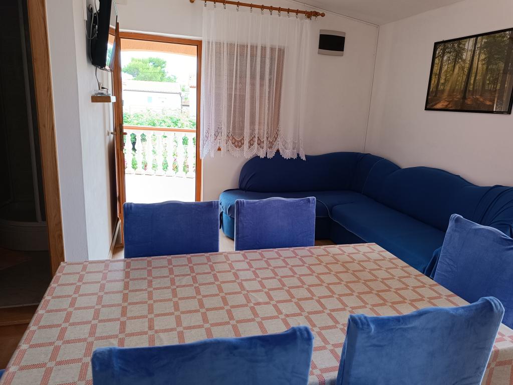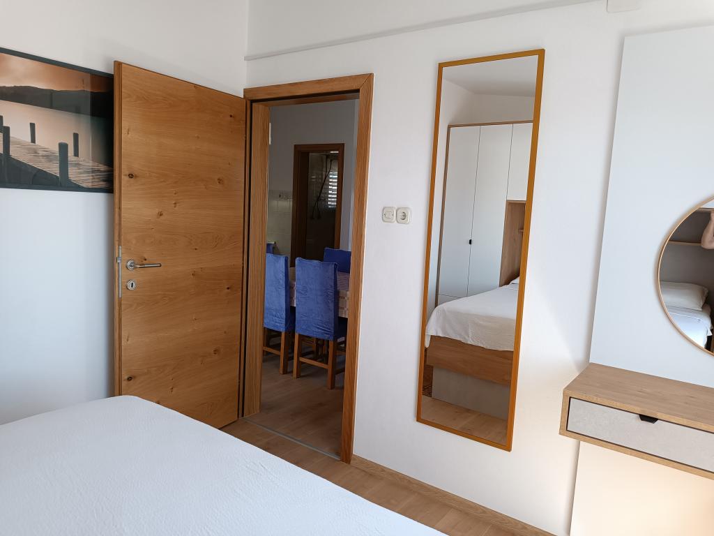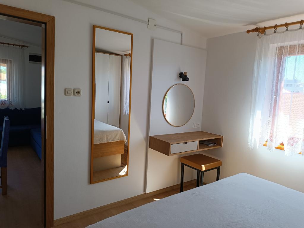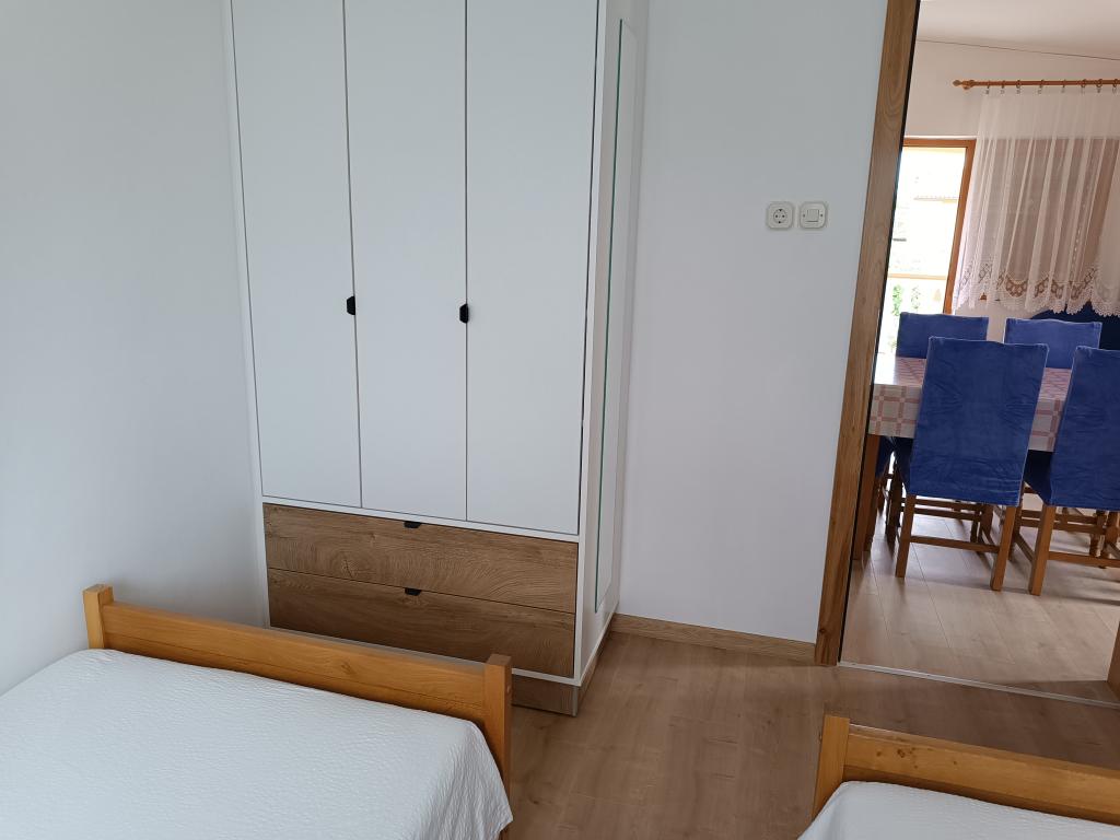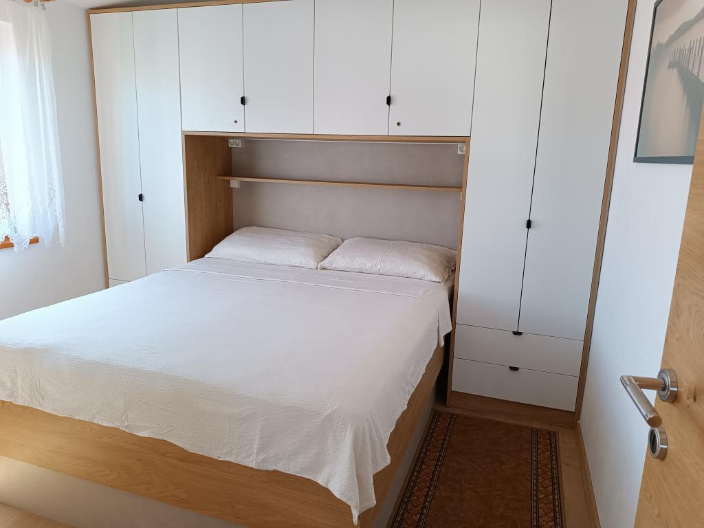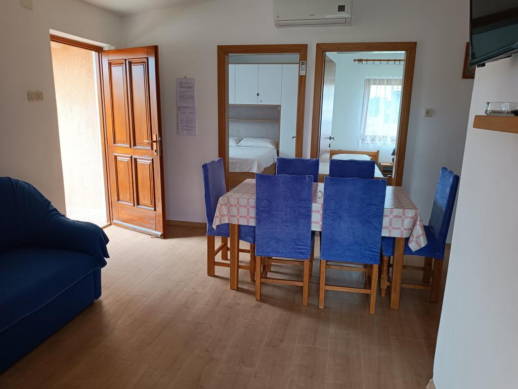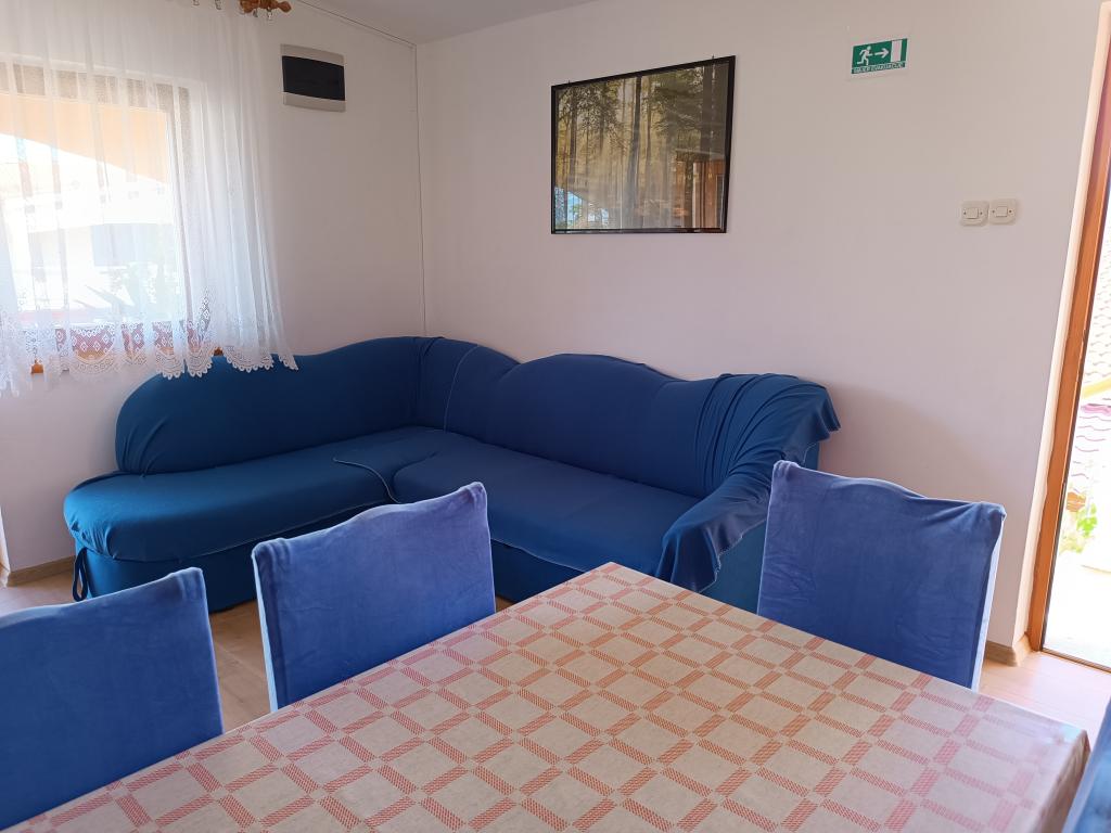 Vi udlejer tre identiske større lejligheder med aircondition til 4 personer, og en mindre lejlighed til to personer. En større er i stueetagen til venstre og to på første sal. Den mindre er i stueetagen til højre. Større lejligheder har to soveværelser og en stue, mens mindre lejligheder har et soveværelse og en stue. Hver lejlighed har en separat indgang og en terrasse på 12 kvadratmeter. I lejlighederne får du alt sengetøj og service til madlavning og servering af mad og drikke. Gæster bedes medbringe egne midler til opvask og aftørring samt håndklæder til badeværelset og alt til personlig hygiejne. Den nærmeste strand (Žitna uvala) ligger 100 m væk Udenfor på stranden er der grus, og i vandet er der sand. Den er velegnet til børn. Der er en lang promenade og cykelsti langs stranden. Der er flere restauranter og en isbar på stranden. Inden for en radius af 150-250 meter er der en frugtbutik, et bageri, flere dagligvarebutikker og butikker med strandudstyr. Vores gade er ikke befærdet. Det bruges kun af sine lejere og gæster. Den er asfalteret og har offentlig belysning.
