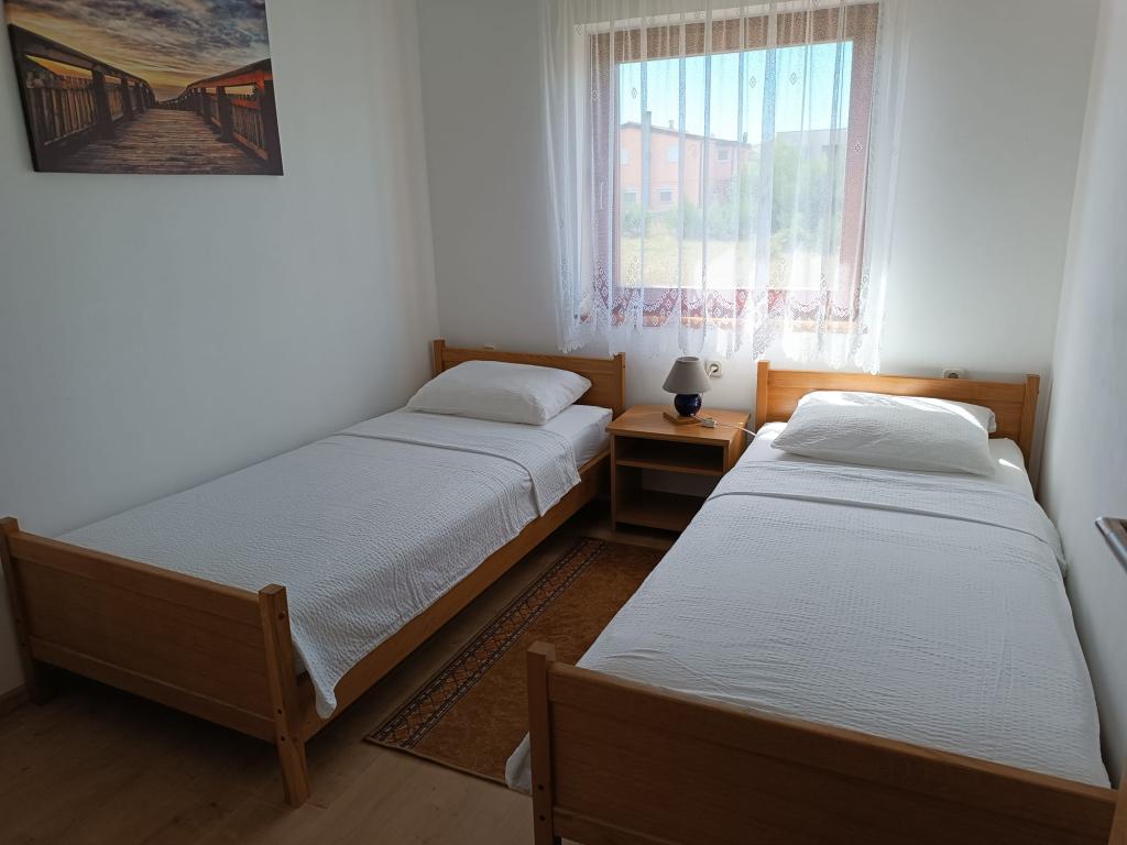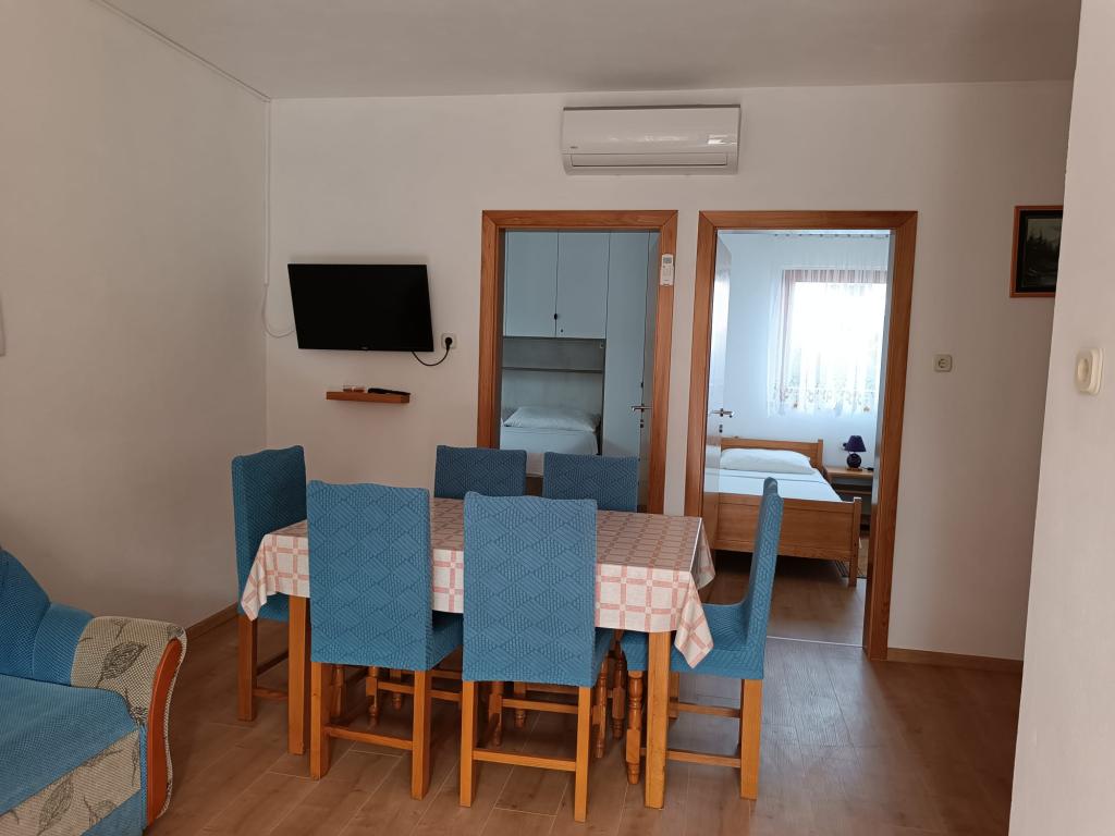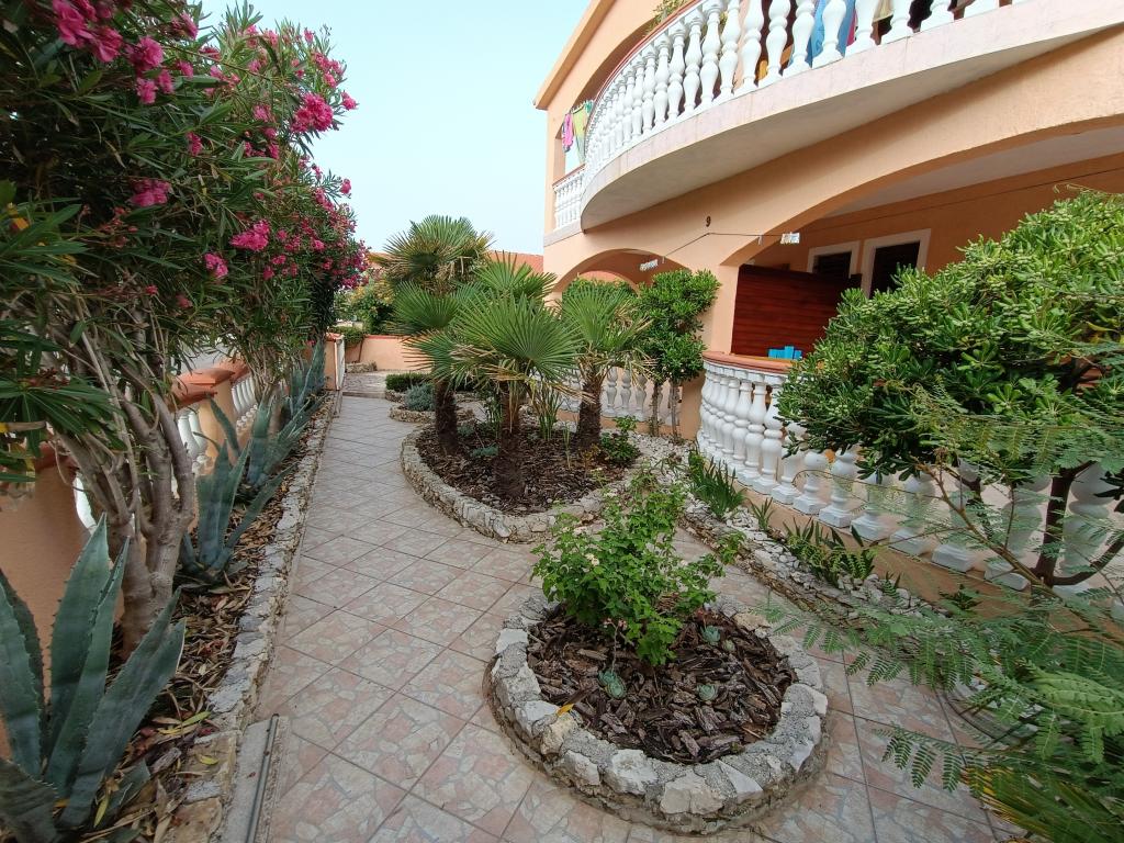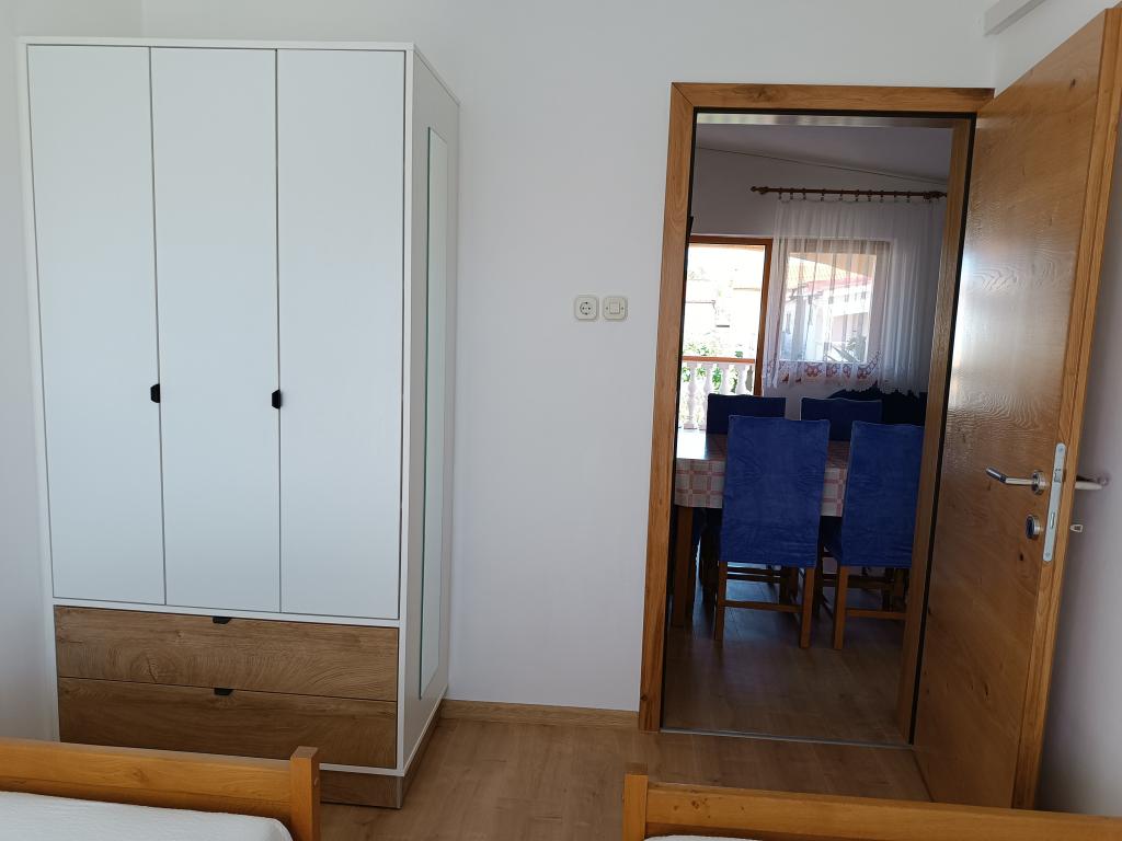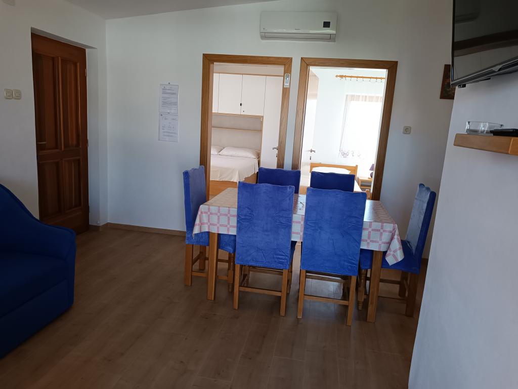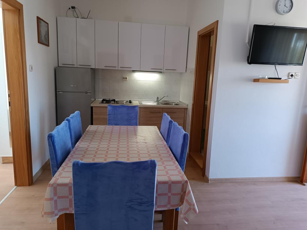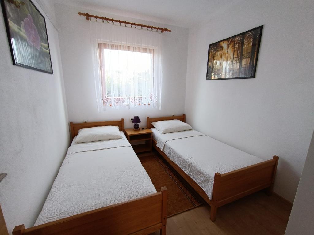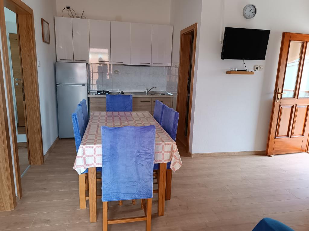 Vi udlejer tre identiske større lejligheder med aircondition til 4 personer, og en mindre lejlighed til to personer. En større er i stueetagen til venstre og to på første sal. Den mindre er i stueetagen til højre. Større lejligheder har to soveværelser og en stue, mens mindre lejligheder har et soveværelse og en stue. Hver lejlighed har en separat indgang og en terrasse på 12 kvadratmeter. I lejlighederne får du alt sengetøj og service til madlavning og servering af mad og drikke. Gæster bedes medbringe egne midler til opvask og aftørring samt håndklæder til badeværelset og alt til personlig hygiejne. Den nærmeste strand (Žitna uvala) ligger 100 m væk Udenfor på stranden er der grus, og i vandet er der sand. Den er velegnet til børn. Der er en lang promenade og cykelsti langs stranden. Der er flere restauranter og en isbar på stranden. Inden for en radius af 150-250 meter er der en frugtbutik, et bageri, flere dagligvarebutikker og butikker med strandudstyr. Vores gade er ikke befærdet. Det bruges kun af sine lejere og gæster. Den er asfalteret og har offentlig belysning.