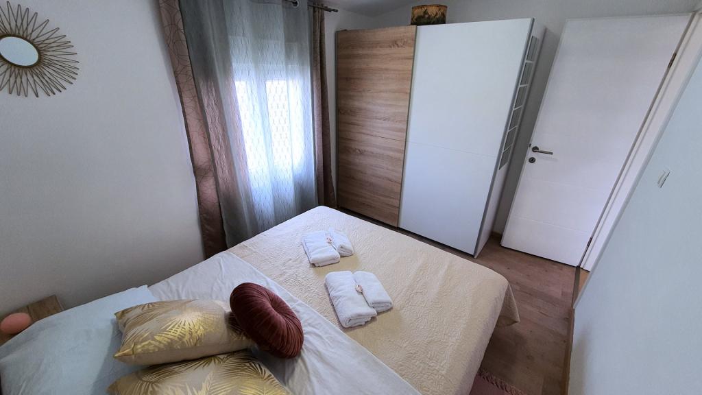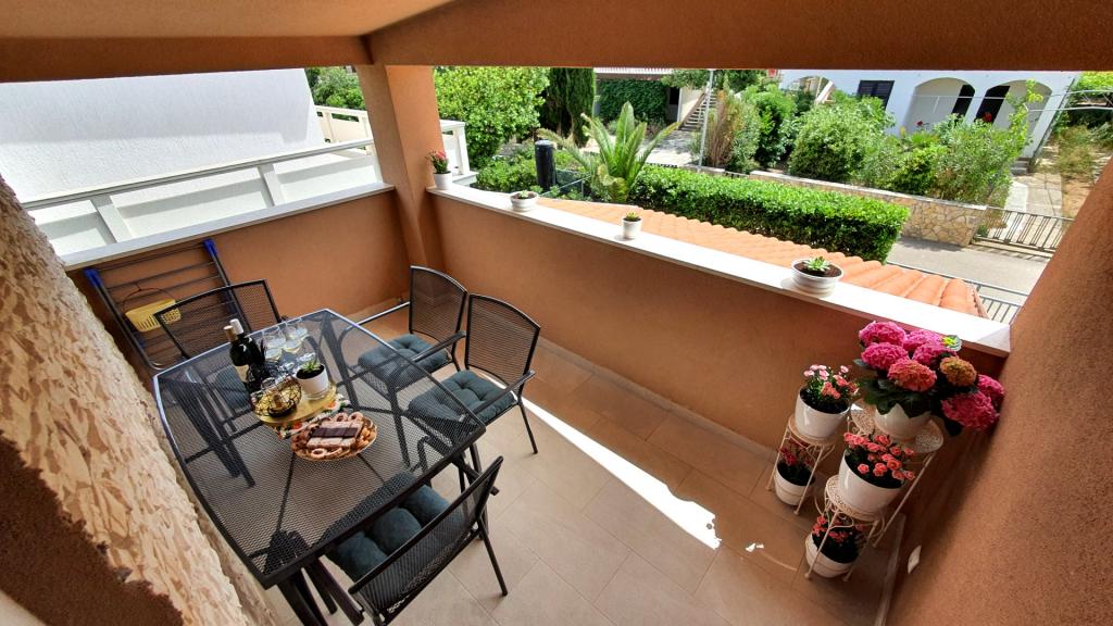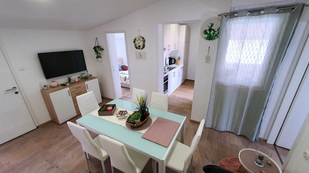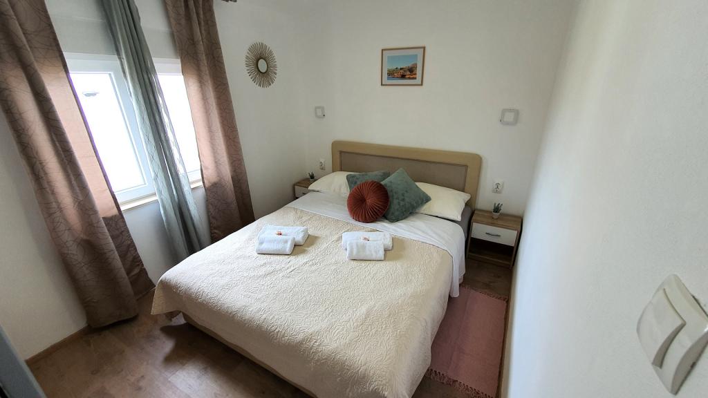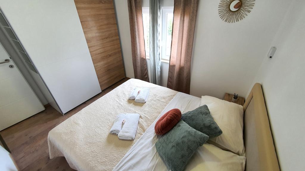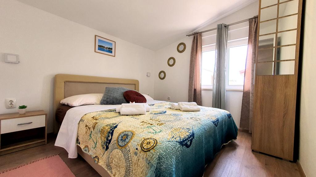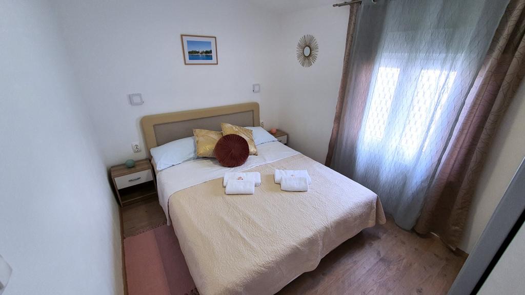 Nyindrettede, moderne lejligheder på øen Vir er udstyret med alt, hvad du behøver for en behagelig og afslappende ferie. Lejlighederne ligger på første sal i familiehuset og har hver sin egen store terrasse samt et fuldt udstyret køkken, badeværelse og soveværelse samt en tilhørende parkeringsplads, der er under 24-timers videoovervågning for din bils sikkerhed. Lejlighederne ligger i en rolig del af øen uden nattetøj og er velegnede til børn at lege, da mange strande har sandbund og er meget lavvandede i de fleste dele, hvilket gør dem til et ideelt valg for forældre med børn. I nærheden er der forskellige strande, promenader samt alle andre faciliteter såsom butikker, bagerier, caféer, restauranter, apoteker, klinikker, kirker, posthuse og busstationer. Alle faciliteter er inden for gåafstand, og det er ikke nødvendigt at bruge en bil under dit ophold. Alle lejligheder har wi-fi, aircondition og en vaskemaskine, som er inkluderet i prisen. For alle andre oplysninger og spørgsmål, er du velkommen til at kontakte os.