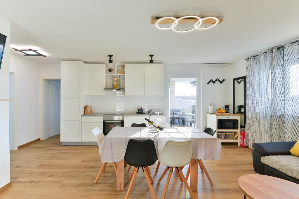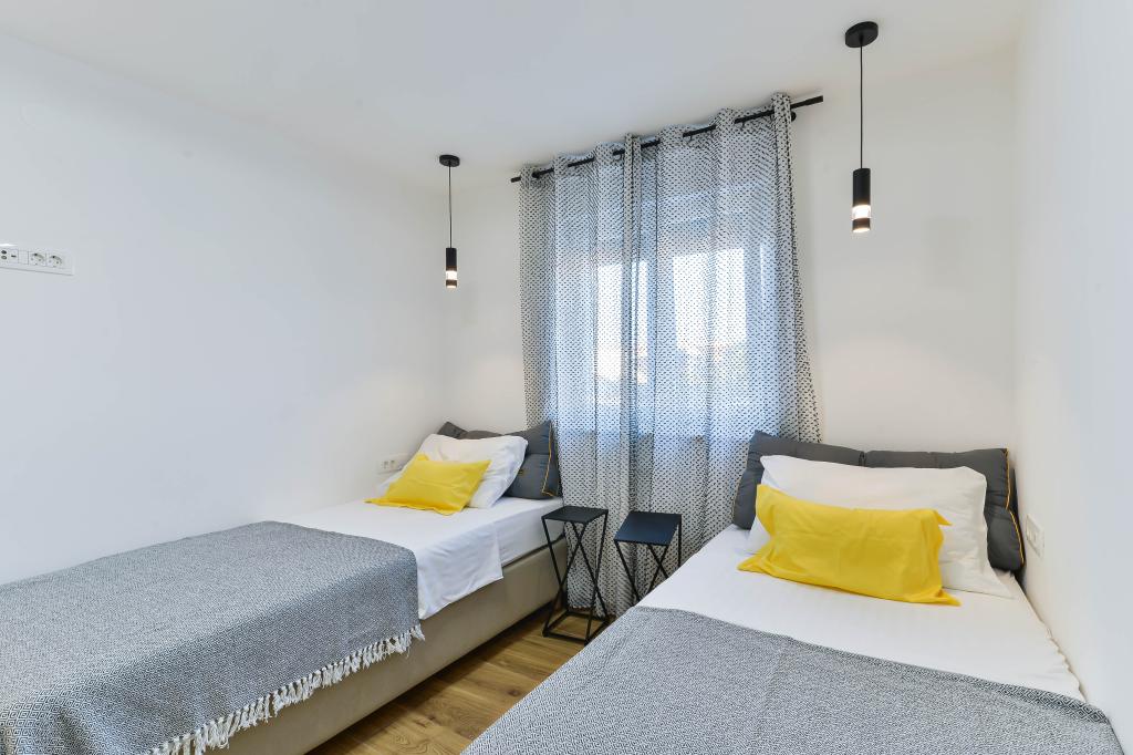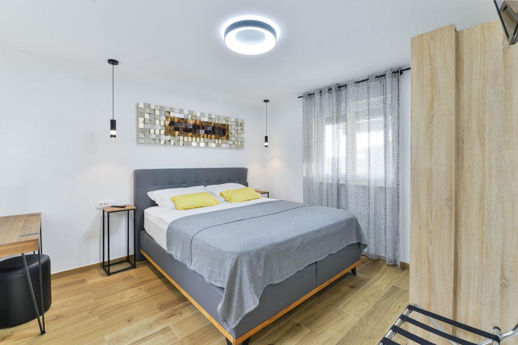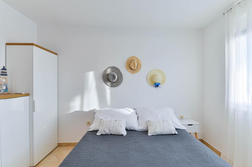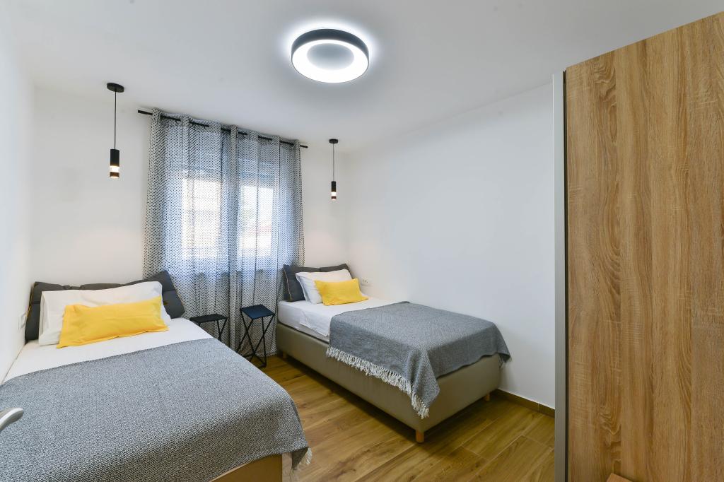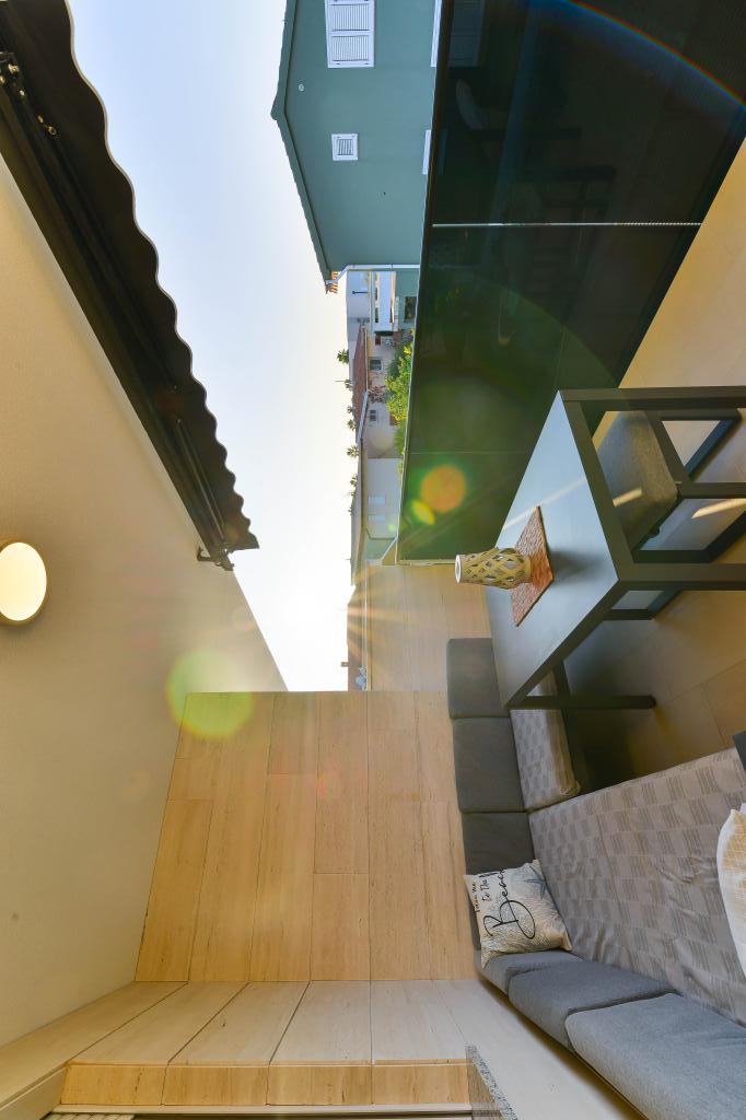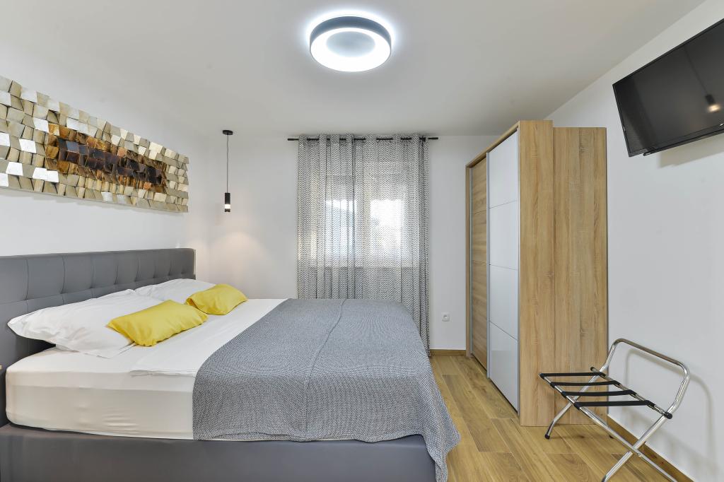 Fuldt udstyrede lejligheder, hvert værelse har sit eget klimaanlæg og tv, beliggende 40 meter fra havet. En bar, restauranter og et supermarked ligger inden for gåafstand. Stranden er af grus og beton, en sandstrand er ti minutters gang væk. Huset har egen parkering, grill og børnegynge i haven. Strandstole, parasoller og cykler er tilgængelige for gæsterne.