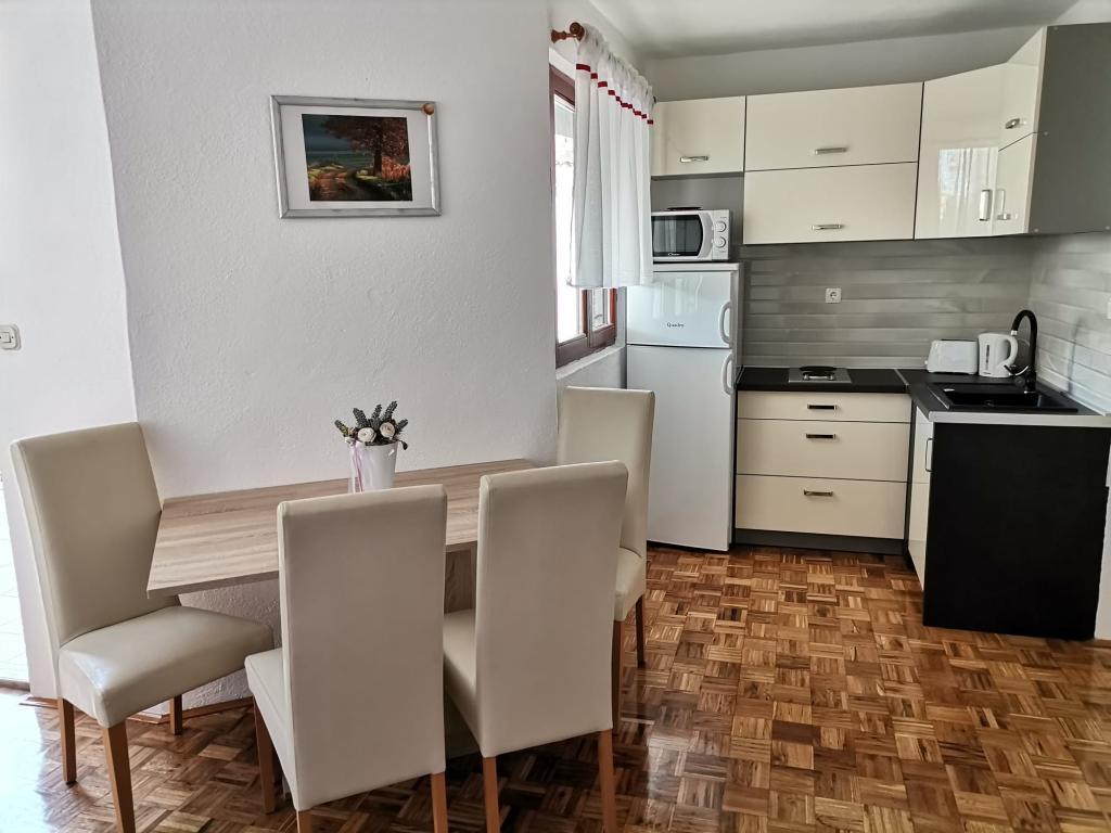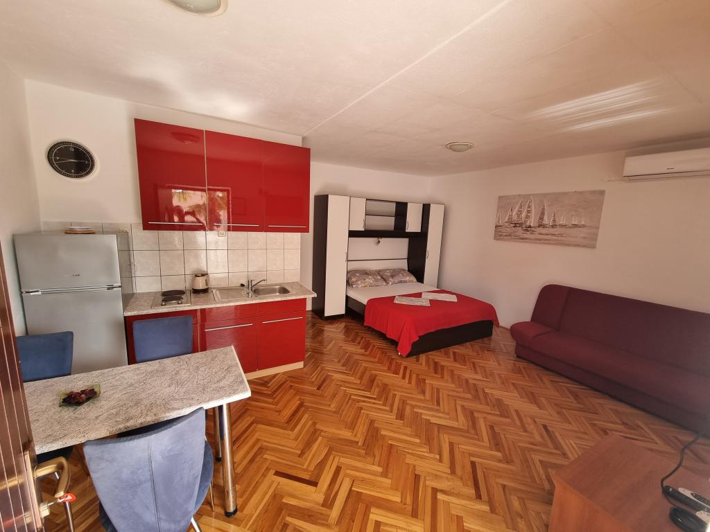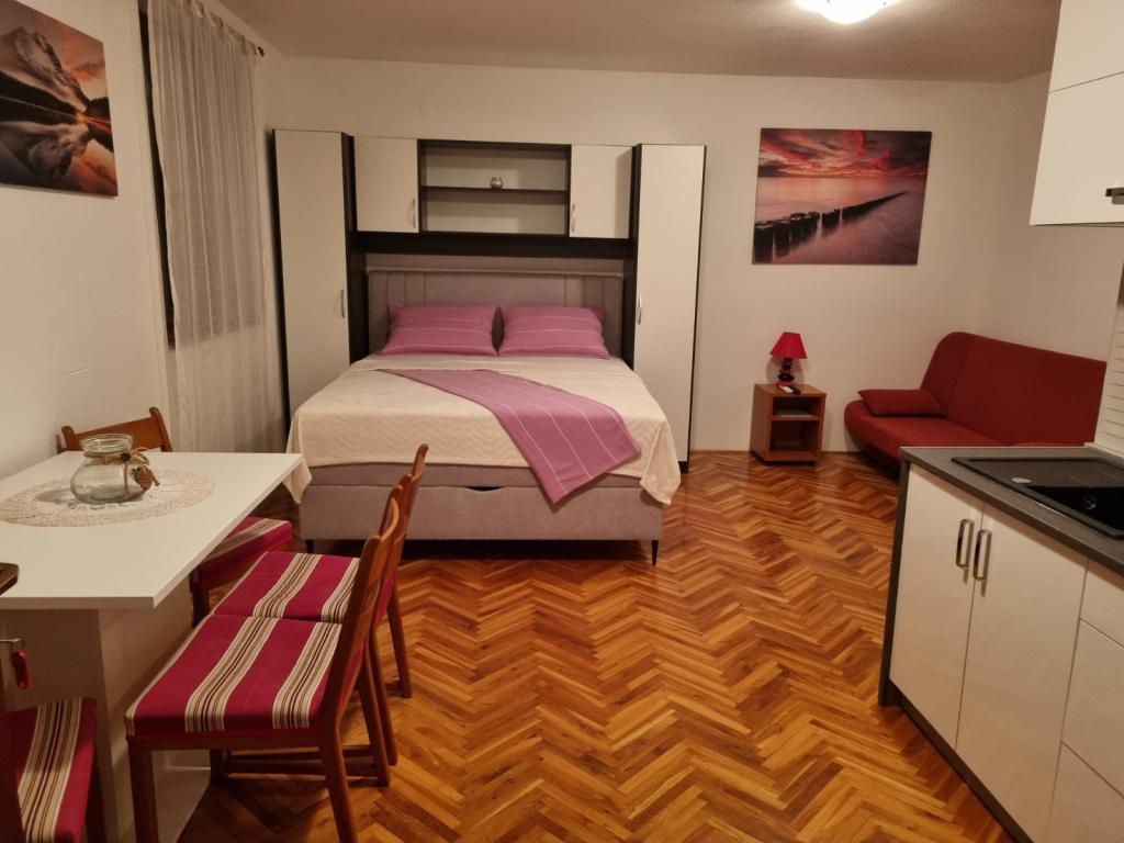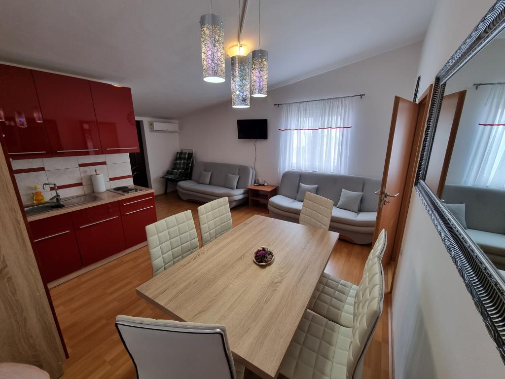 Lejlighederne ligger uden for alfarvej, så der er stille og roligt. Det er 10 minutters gang til stranden, der er et bageri og en Tommy-butik på vej. En meget sød og hjælpsom ejer, som tog imod os med kaffe og lavede lækker juice til børnene. Du kan købe Rakija, vin eller olivenolie hos hende. Lejlighederne selv er meget rene og veludstyrede med en parkeringsplads.