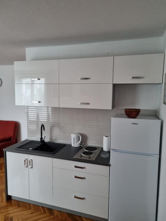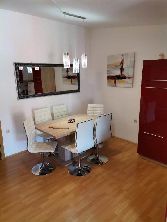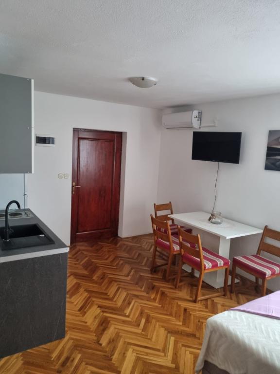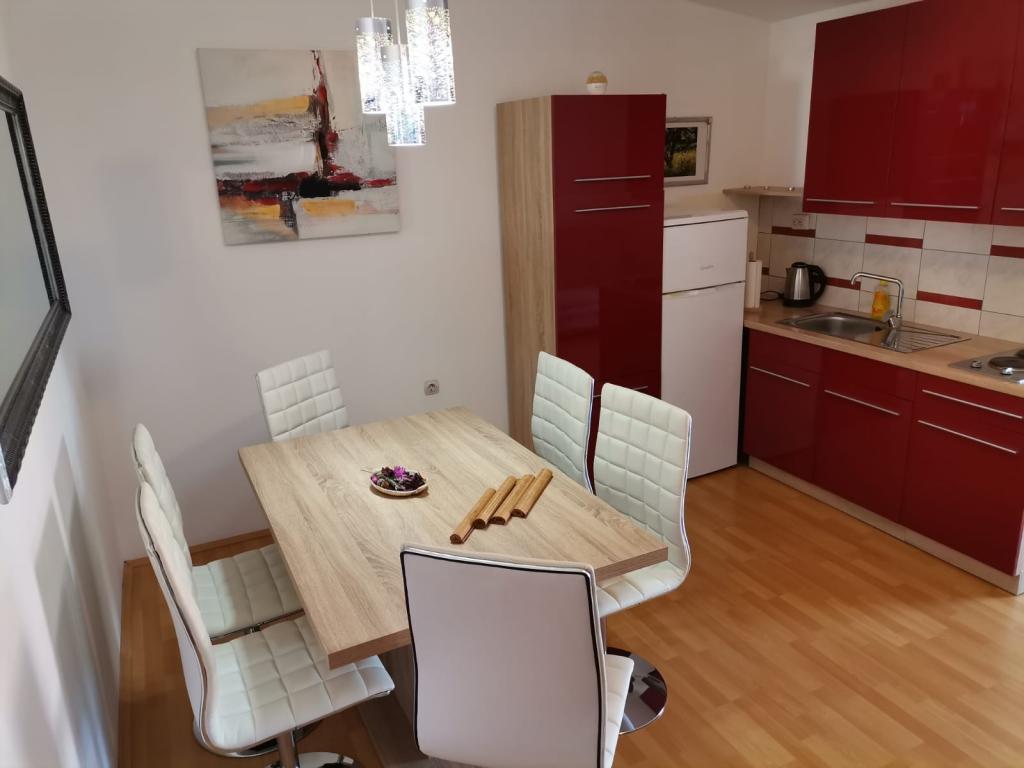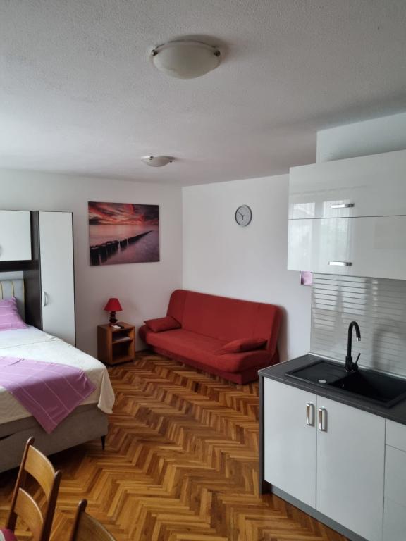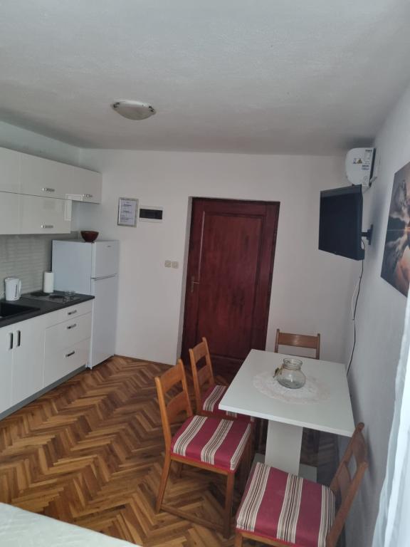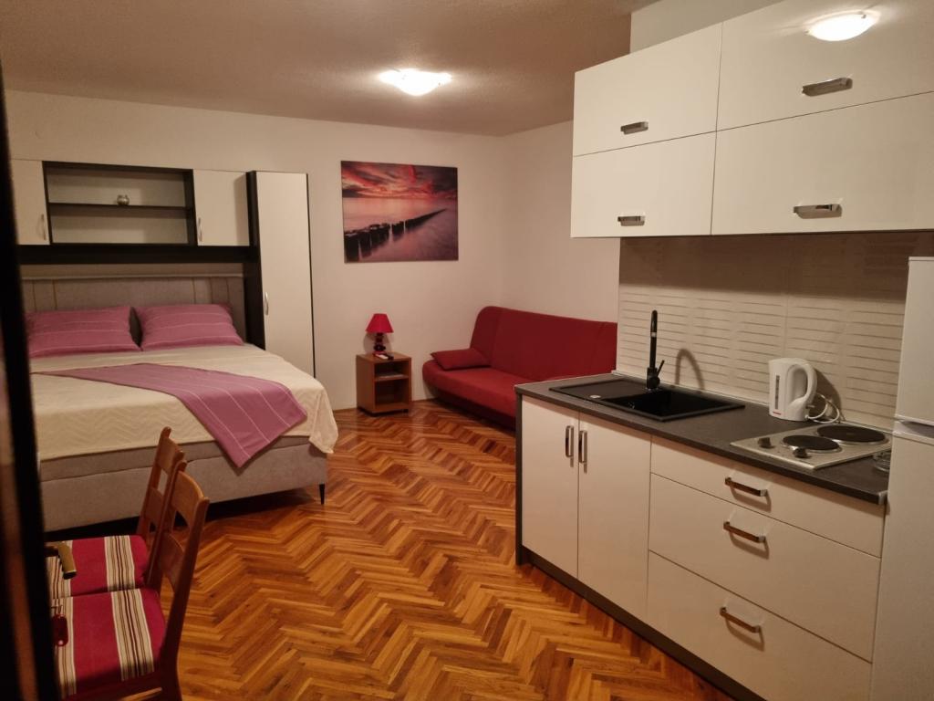 Lejlighederne ligger uden for alfarvej, så der er stille og roligt. Det er 10 minutters gang til stranden, der er et bageri og en Tommy-butik på vej. En meget sød og hjælpsom ejer, som tog imod os med kaffe og lavede lækker juice til børnene. Du kan købe Rakija, vin eller olivenolie hos hende. Lejlighederne selv er meget rene og veludstyrede med en parkeringsplads.