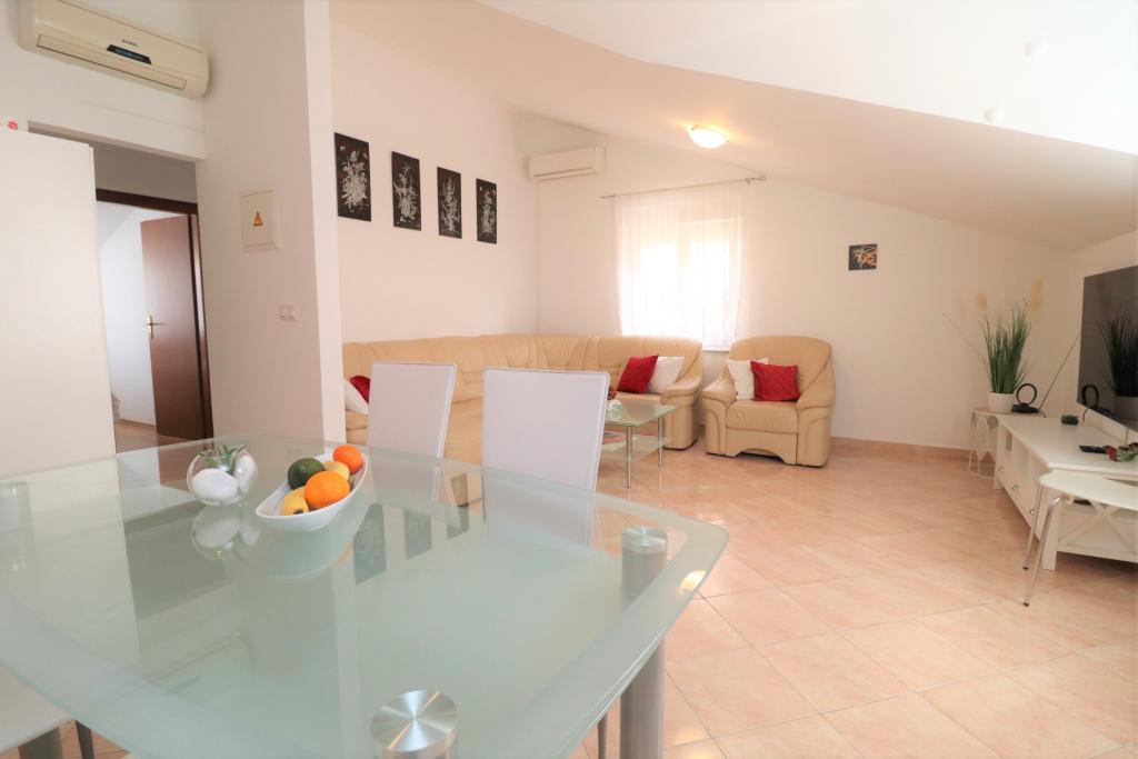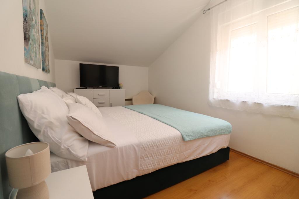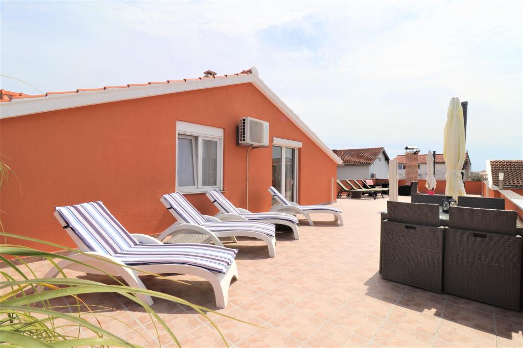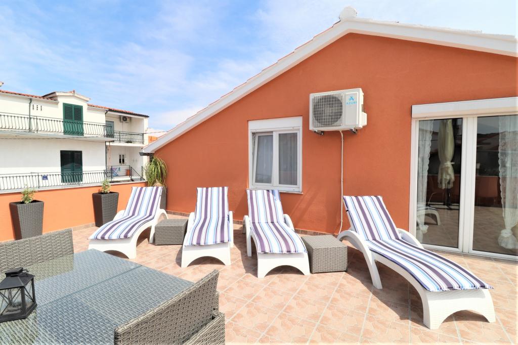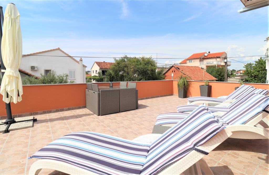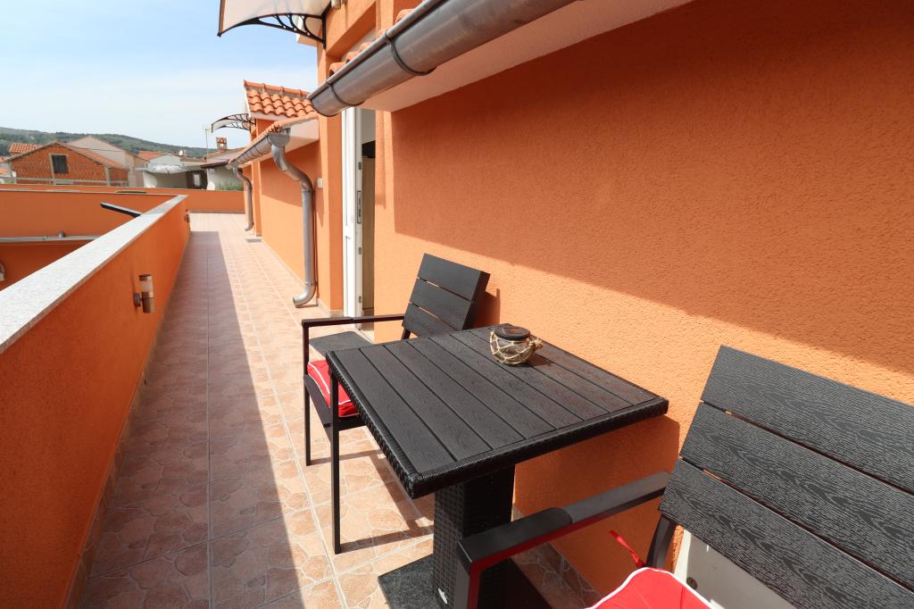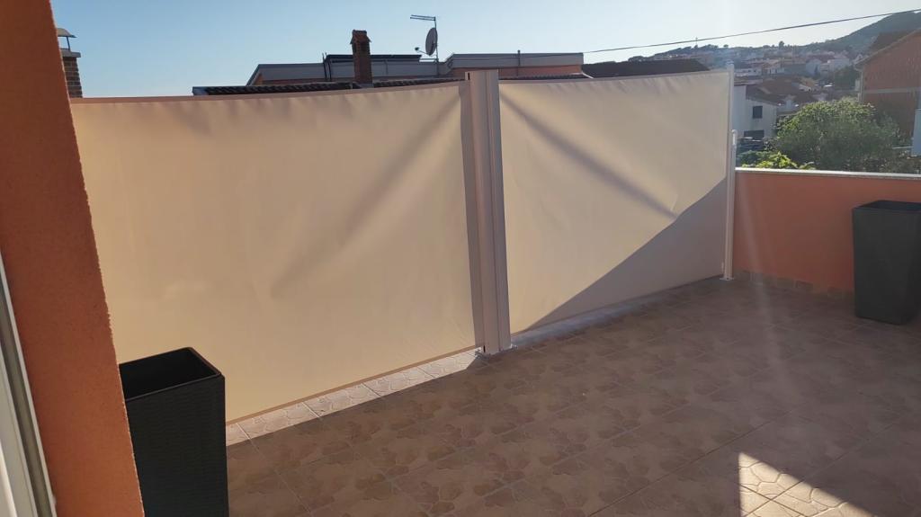 Fuldt udstyrede lejligheder i et roligt område i Vodice med stor terrasse og gårdhave. Lejlighederne er placeret på øverste etage i familiehuset. Terrassen kan adskilles med sidemarkise, hvis det er nødvendigt. Der er jacuzzi og grill i gården. Kæledyr er velkomne. En parkeringsplads til to biler er til rådighed. Strandene ligger omkring 15 minutters gang væk. Opholdsafgift er inkluderet i prisen. Mulighed for transport fra Zadar og Split lufthavne.