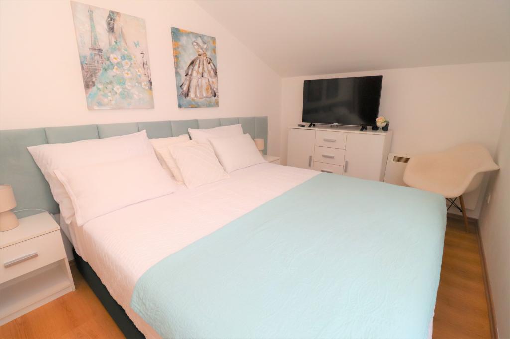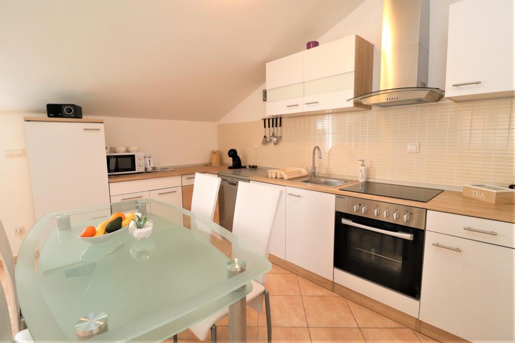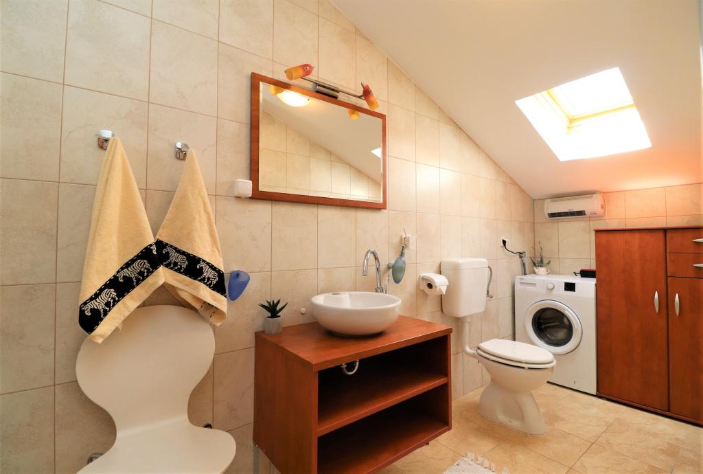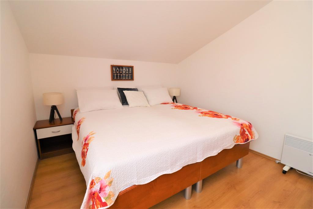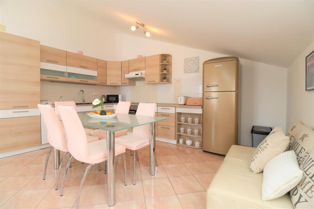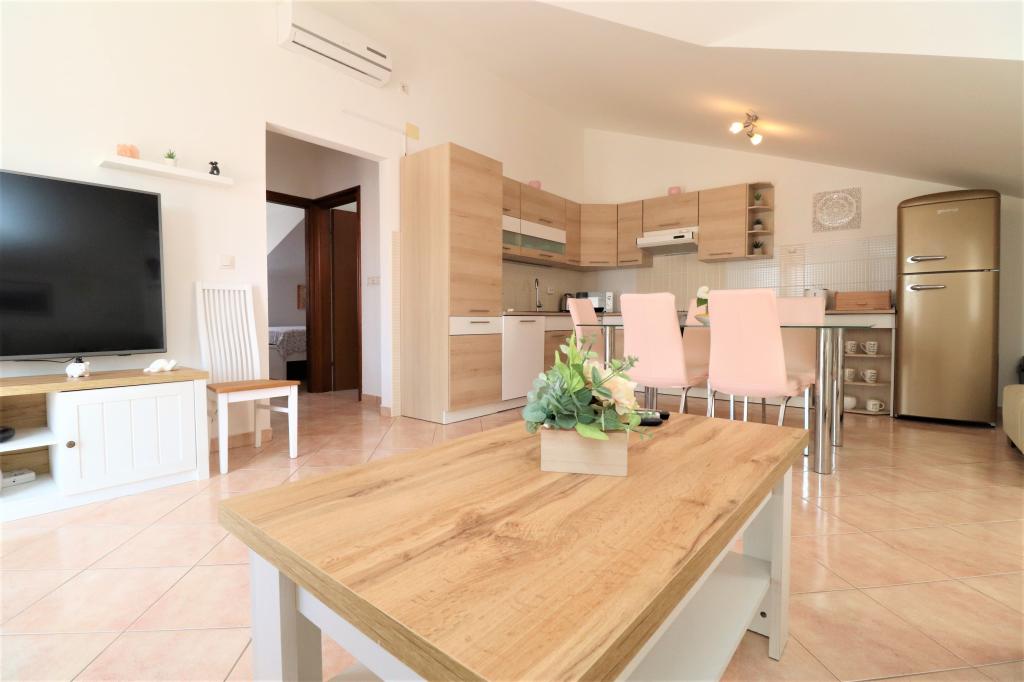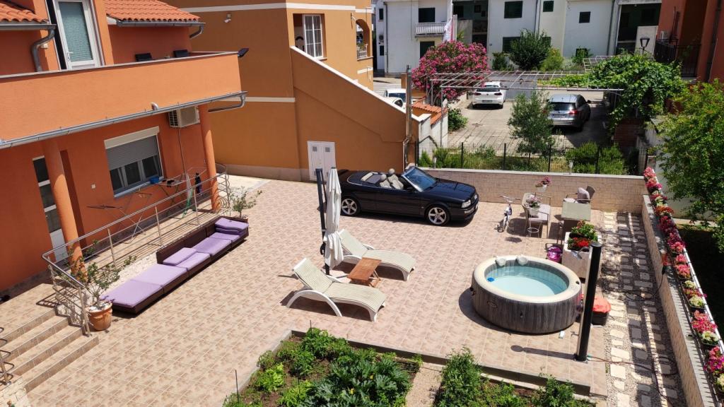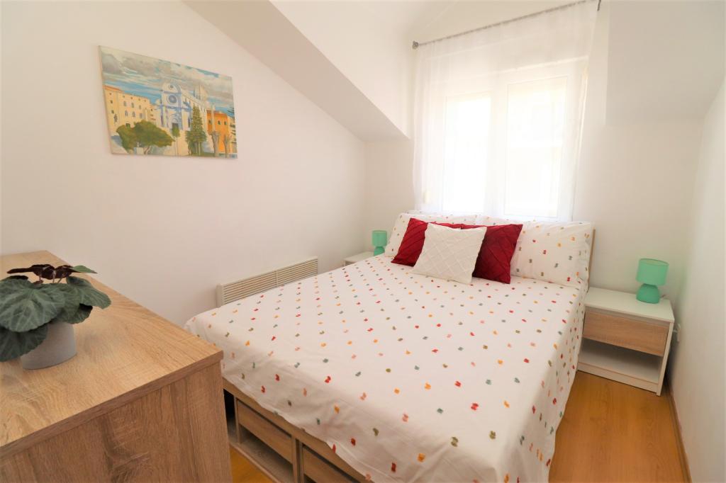 Fuldt udstyrede lejligheder i et roligt område i Vodice med stor terrasse og gårdhave. Lejlighederne er placeret på øverste etage i familiehuset. Terrassen kan adskilles med sidemarkise, hvis det er nødvendigt. Der er jacuzzi og grill i gården. Kæledyr er velkomne. En parkeringsplads til to biler er til rådighed. Strandene ligger omkring 15 minutters gang væk. Opholdsafgift er inkluderet i prisen. Mulighed for transport fra Zadar og Split lufthavne.