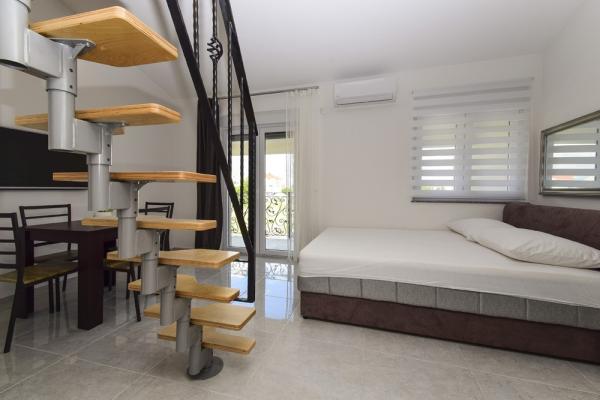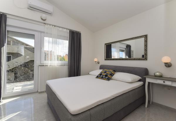 Smukke lejligheder med aircondition i en rolig gade, med stor terrasse. Tæt på stranden i en fyrreskov, med masser at gøre for børn og voksne, samt hoteller og butikker. Byens centrum og en af de mest smukke marina i Adriaterhavet er en nem gang til stranden, 5 minutter.