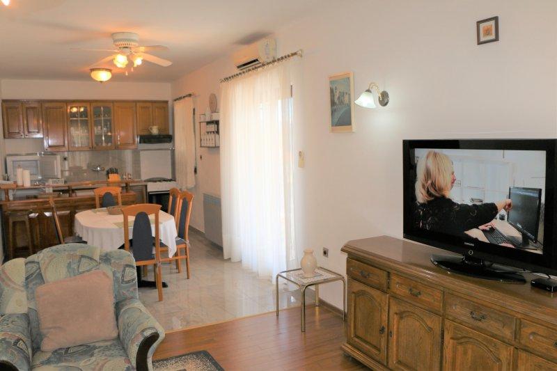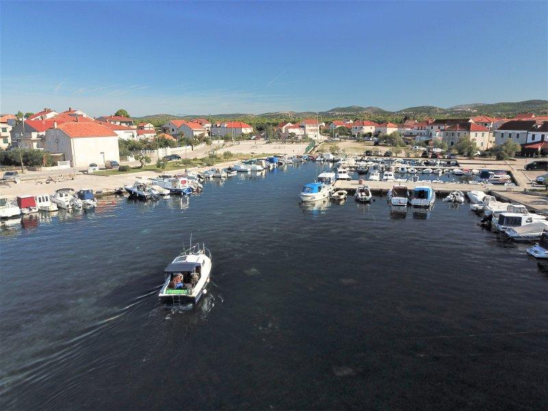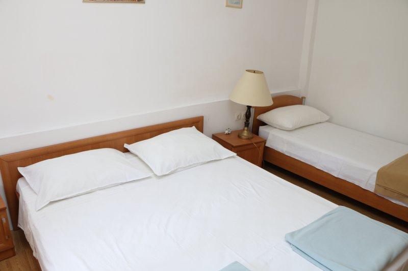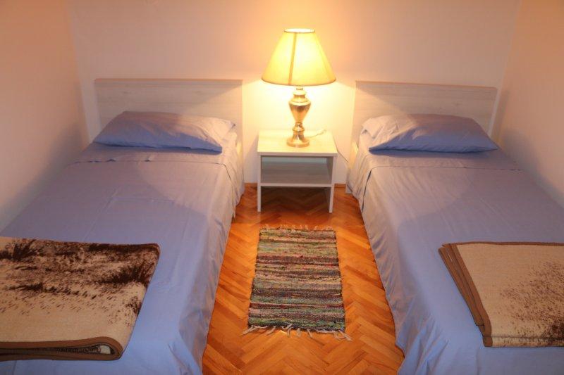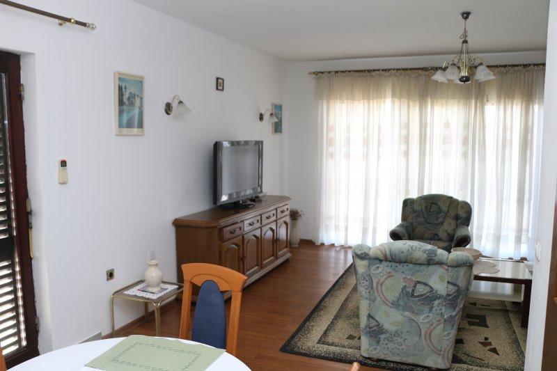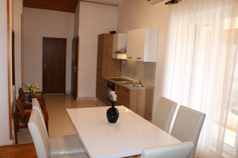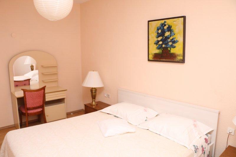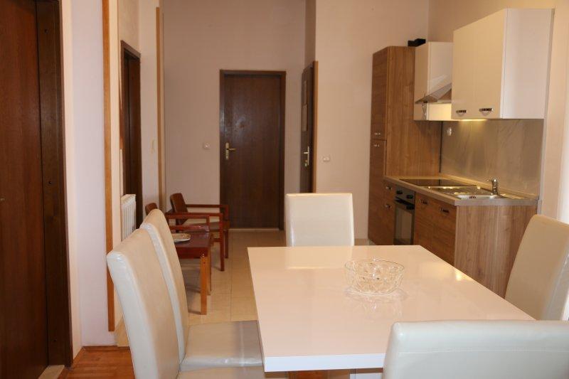 Fuldt udstyrede lejligheder i centrum af Zablac, 50 meter fra havet og 200 meter fra stranden, på den sydlige side af cementstranden inden for den gamle fyrreskov og på vestsiden af sten - (naturlig) strand. En ti-minutters gåtur adskiller lejlighederne fra SOLARIS Hotel Complex og inden for de samme 2 kilometer med fremragende dekorerede strande med en række faciliteter til sport og rekreation samt gastronomiske og underholdende tilbud i løbet af dagen og natten. Fra disse få ord til at konkludere, at hver aldersgruppe kan imødekomme deres behov og nyde ferien i vores lejligheder. Alle lejligheder er fuldt udstyret med alt nødvendigt inventar for et behageligt ophold. Parkeringsplads foran huset.