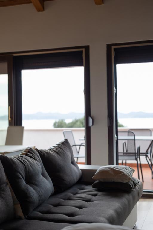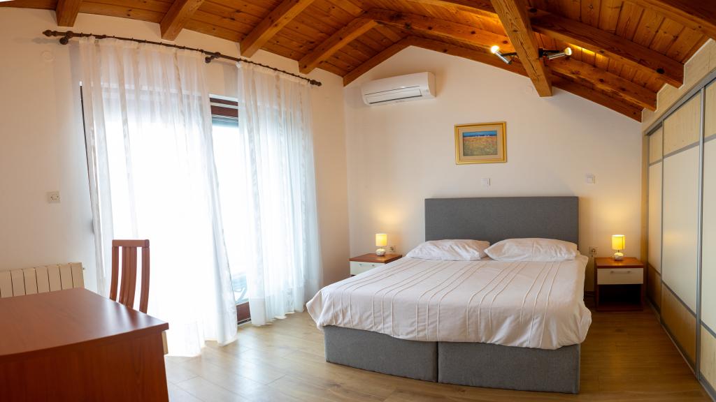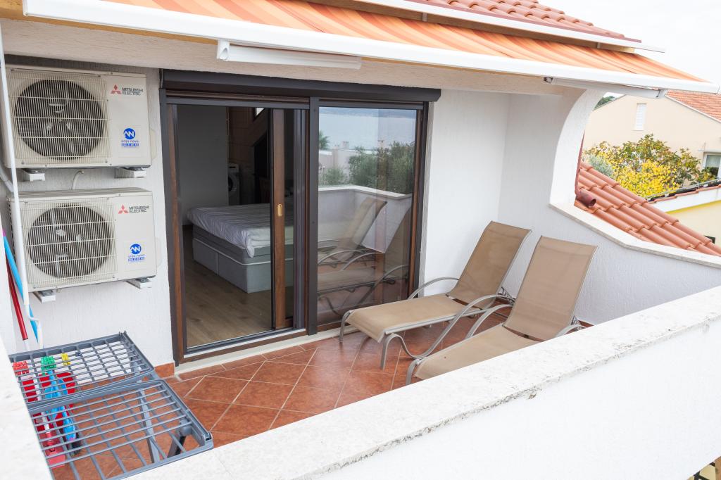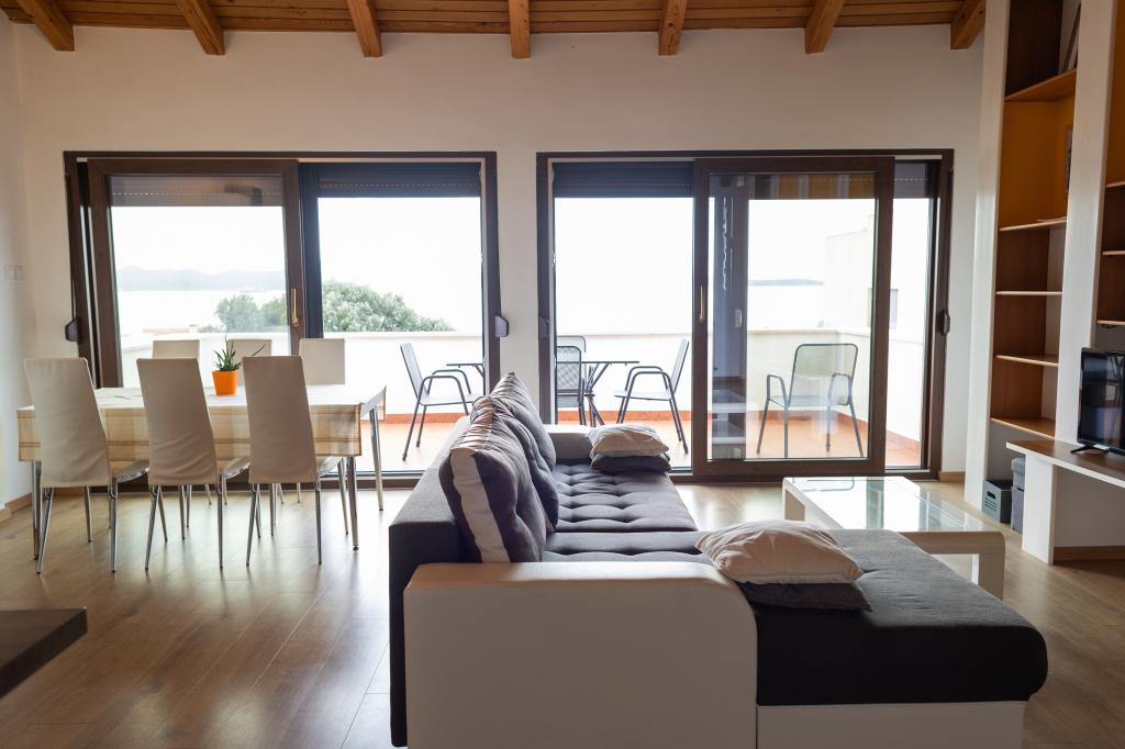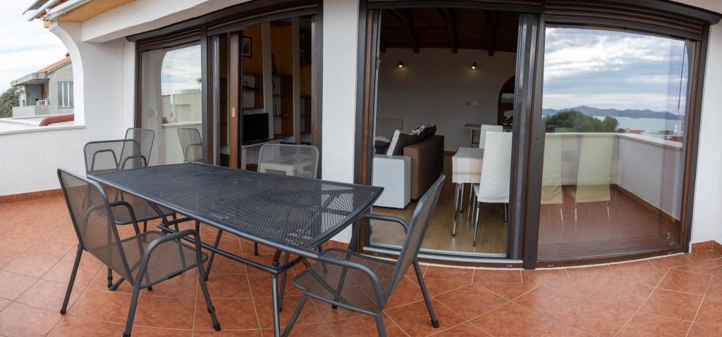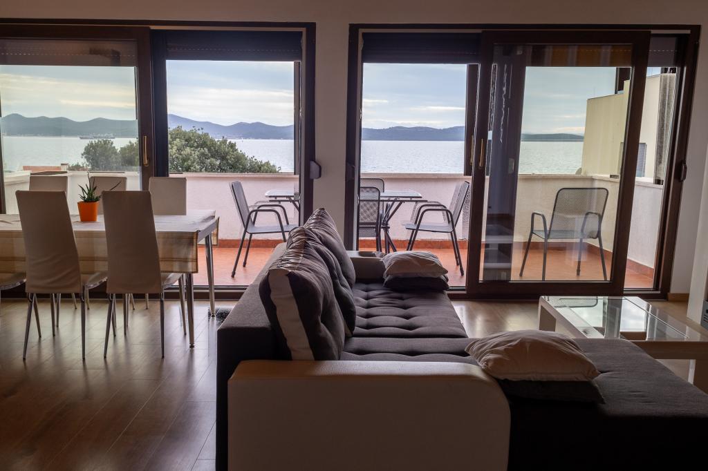 Rummelig 3-værelses lejlighed (100 m²) på 2. sal i det rustikke hus Anica, beliggende i det rolige Diklo, kun 6 km fra Zadars centrum og 100 m fra havet. Lejligheden er udstyret med en stor stue og spisestue (38 m²) med satellit-tv, aircondition og adgang til en terrasse med havudsigt. To komfortable soveværelser tilbyder fleksibel indkvartering - det ene med en dobbeltseng, det andet med en enkeltseng og en dobbeltseng samt eget bad/toilet. Begge har aircondition og adgang til en terrasse. Det fuldt udstyrede åbne køkken har ovn, opvaskemaskine, keramisk kogeplade, mikrobølgeovn og kaffemaskine. Et ekstra bad/toilet og en vaskemaskine er til rådighed for gæsterne. Tre sydvendte terrasser, udstyret med møbler, tilbyder havudsigt og er perfekte steder at slappe af. Parkering til to biler på grunden.