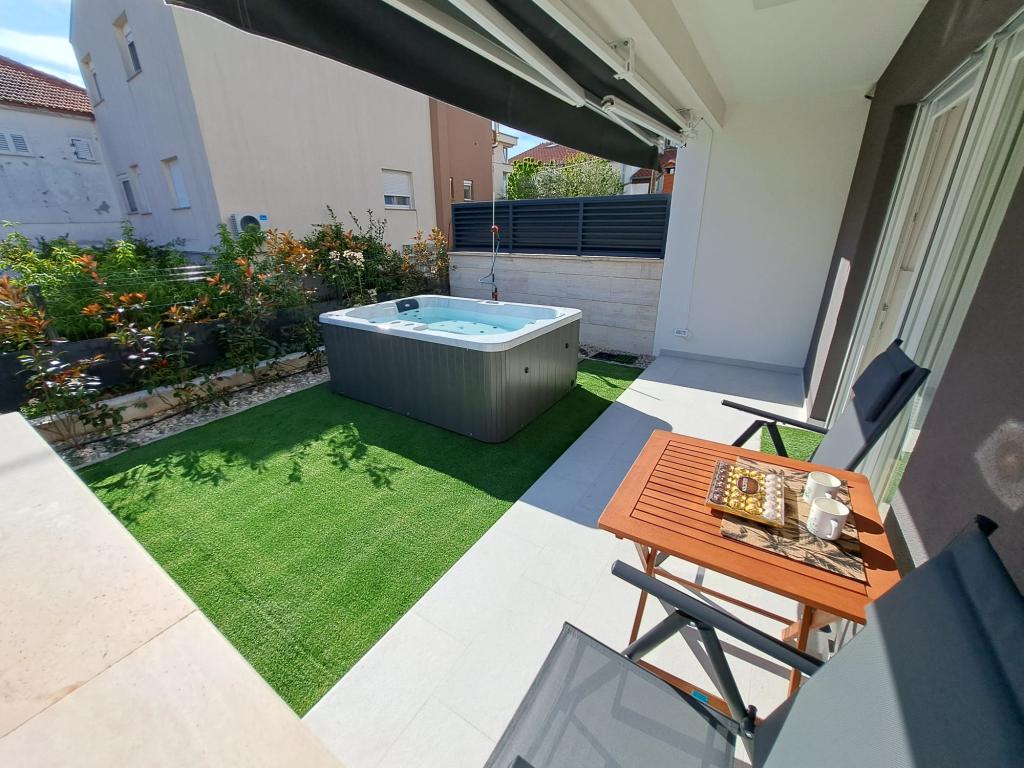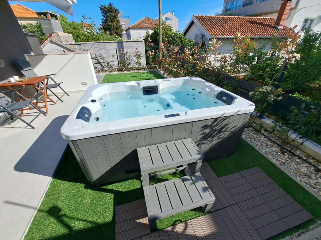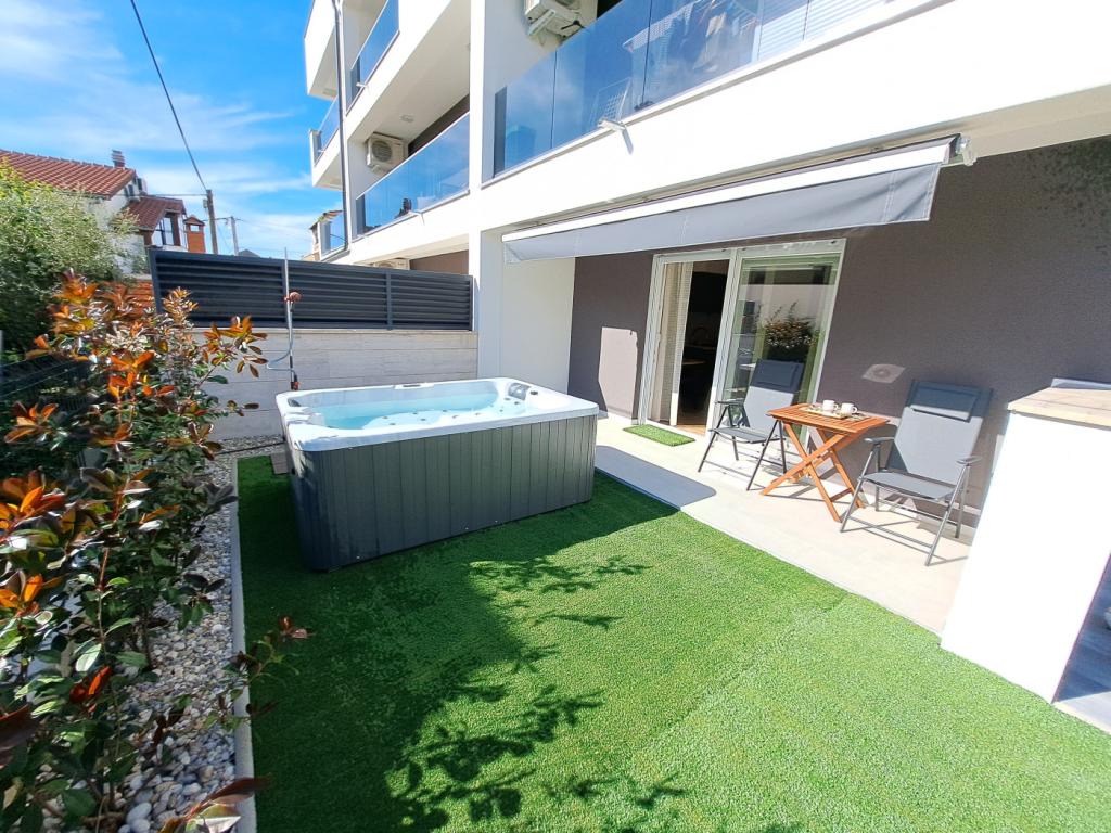 Lejligheden ligger i stueetagen i en bygning i det rolige Stanovi-kvarter i Zadar, som ikke besøges af skarer af turister. I umiddelbar nærhed (gåafstand) er der butikker, restauranter, caféer og Višnjik sports- og rekreationscenter - alt hvad du behøver til dit ophold, uden at du behøver at bruge bil. Lejligheden har separat indgang fra egen have (ca. 55m2), hvor gæsterne har adgang til privat jacuzzi. Haven er omgivet af grønne områder. Lejligheden består af en stue med køkken og spiseplads, 2 soveværelser (hver med en dobbeltseng, der kan adskilles i to enkeltsenge), et badeværelse med bruser og en overdækket loggia (ca. 7m2). Den del af haven med spabadet kan skygges med et automatisk rullegardin. Vi har 2 private parkeringspladser foran bygningen. (uden ekstra gebyr) Vi tilbyder også vores egen ladestation til elbiler. (ekstra gebyr)