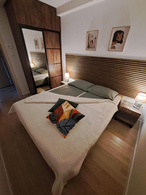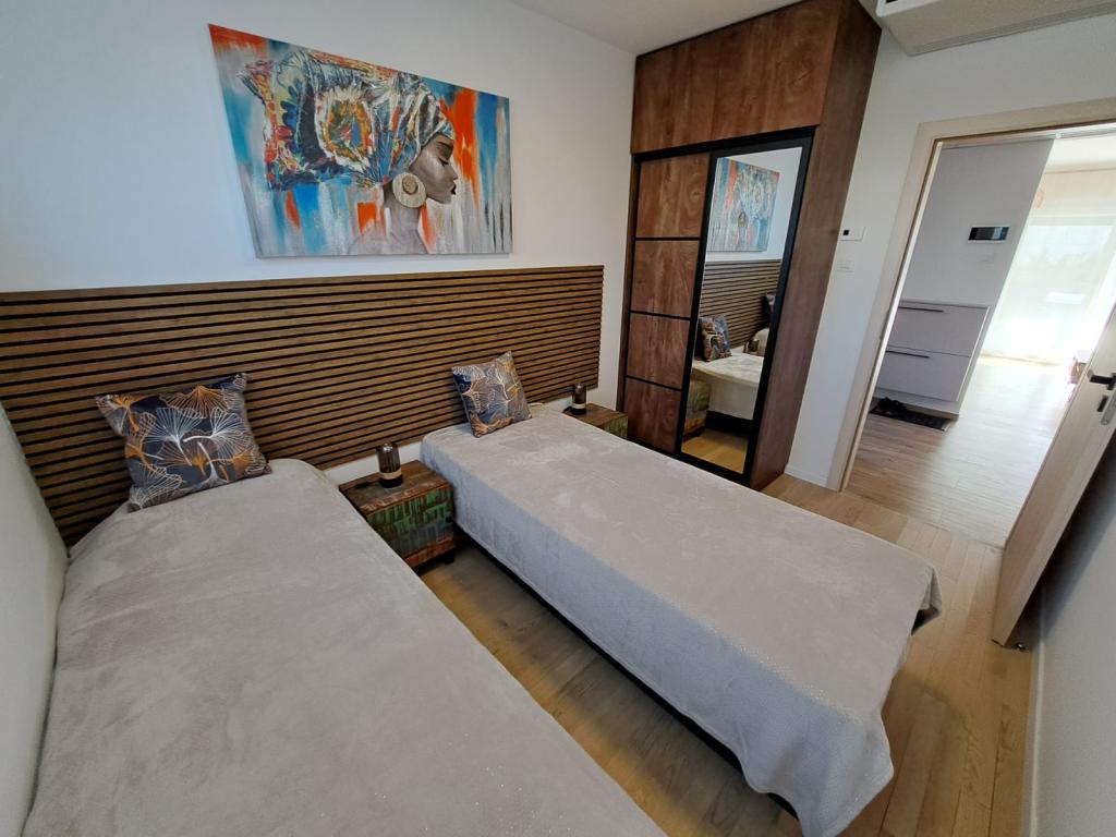 Udstyr: - køling og opvarmning i hvert værelse - varmepumpe, gulvvarme på badeværelset - WiFi - TV - vaskemaskine-tørretumbler - opvaskemaskine - ovn med mikroovn - induktionskomfur - køleskab - tallerkener, køkkenredskaber, bestik - elkedel - kaffemaskine ( kapsler) - viskestykker - sengelinned - håndklæder - jacuzzi håndklæder - hårtørrer - pengeskab - havemøbelsæt - udendørs bruser - tørretumbler og tøjklemmer - grundlæggende rengøringsmidler Lejligheden har ikke en grill. Fremragende grillretter kan købes på nærliggende restauranter. AFSTAND: 600m - Višnjik Sports- og Fritidscenter (indendørs svømmebassiner, tennis- og paddlebaner, fodbold, basketball, bordtennis, løbebaner, udendørs fitnessrum, legepladser, trampolinpark, minigolf, hoppeslot, rulleskøjtebane/skøjtebane i vinter) /) 1,8 km - gamle bydel - Poluotok 2 km - Kolovare strand 1,6 km - hovedbusstation 10 km - Zemunik lufthavn