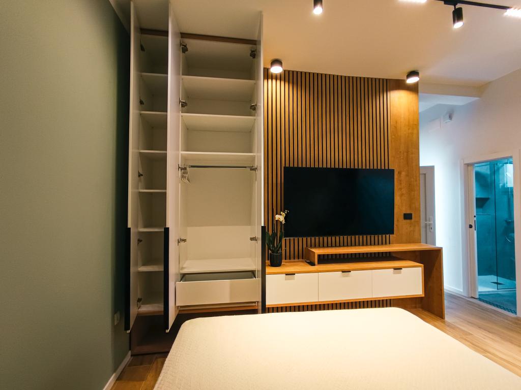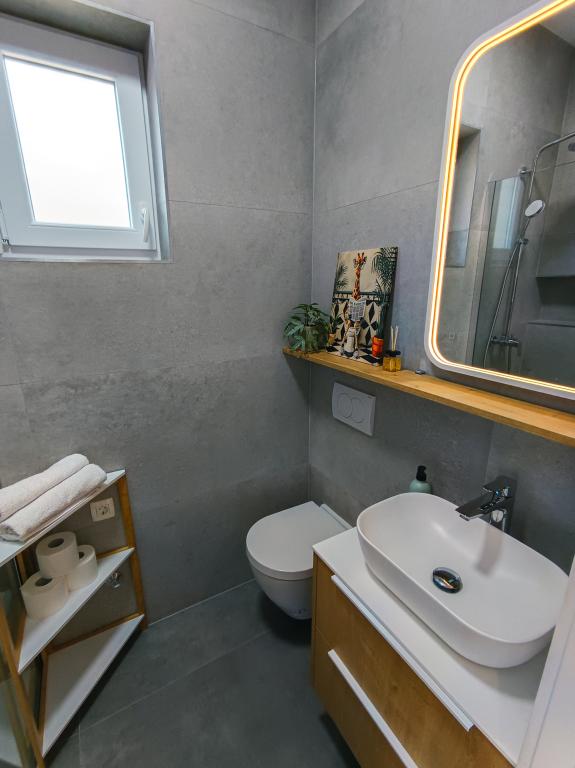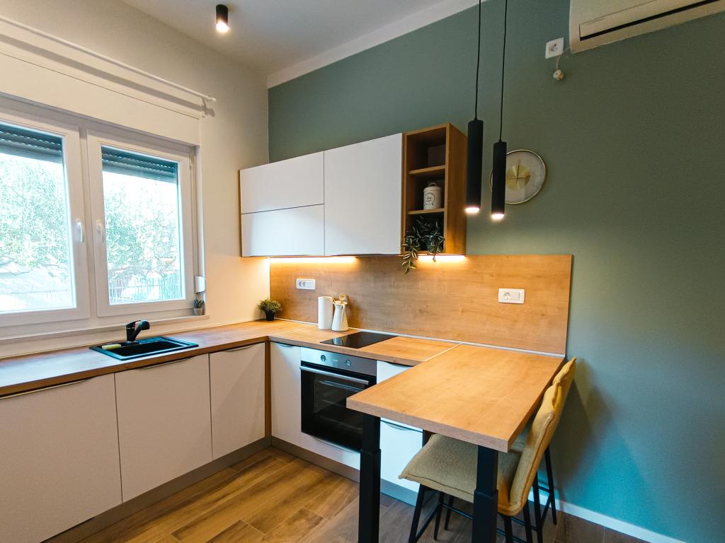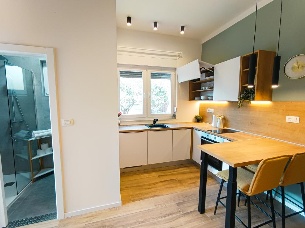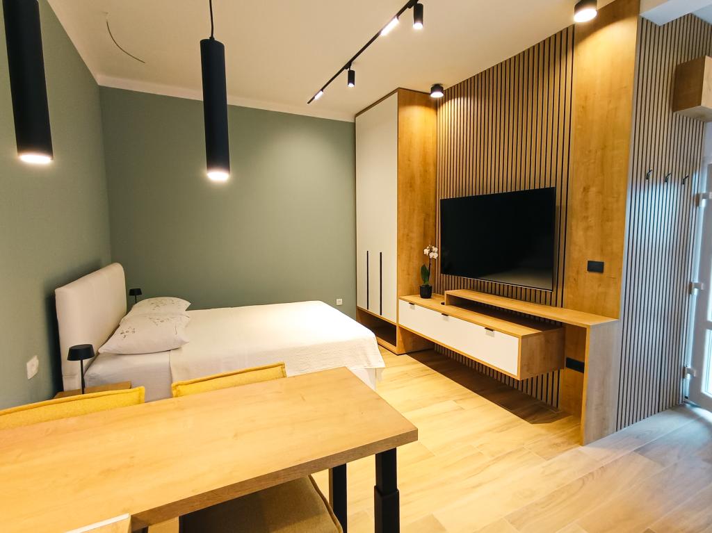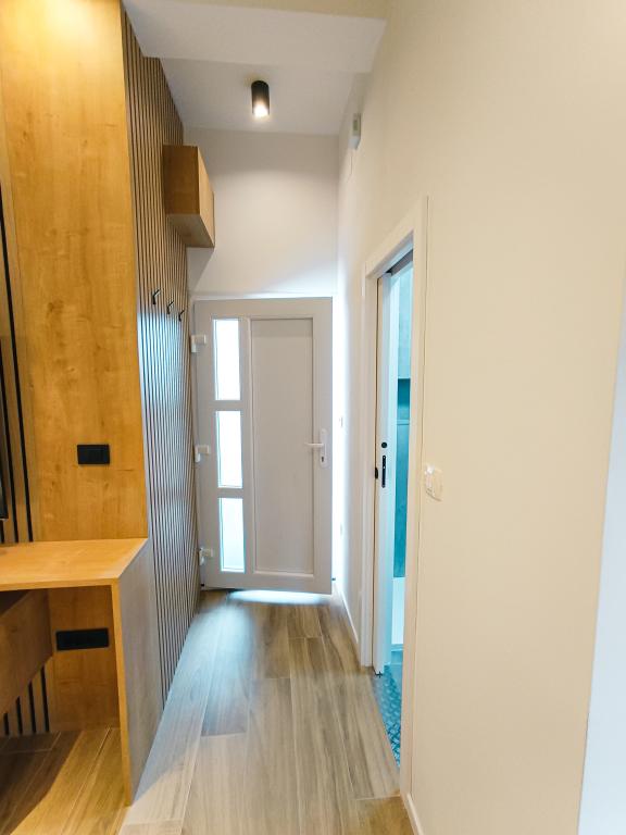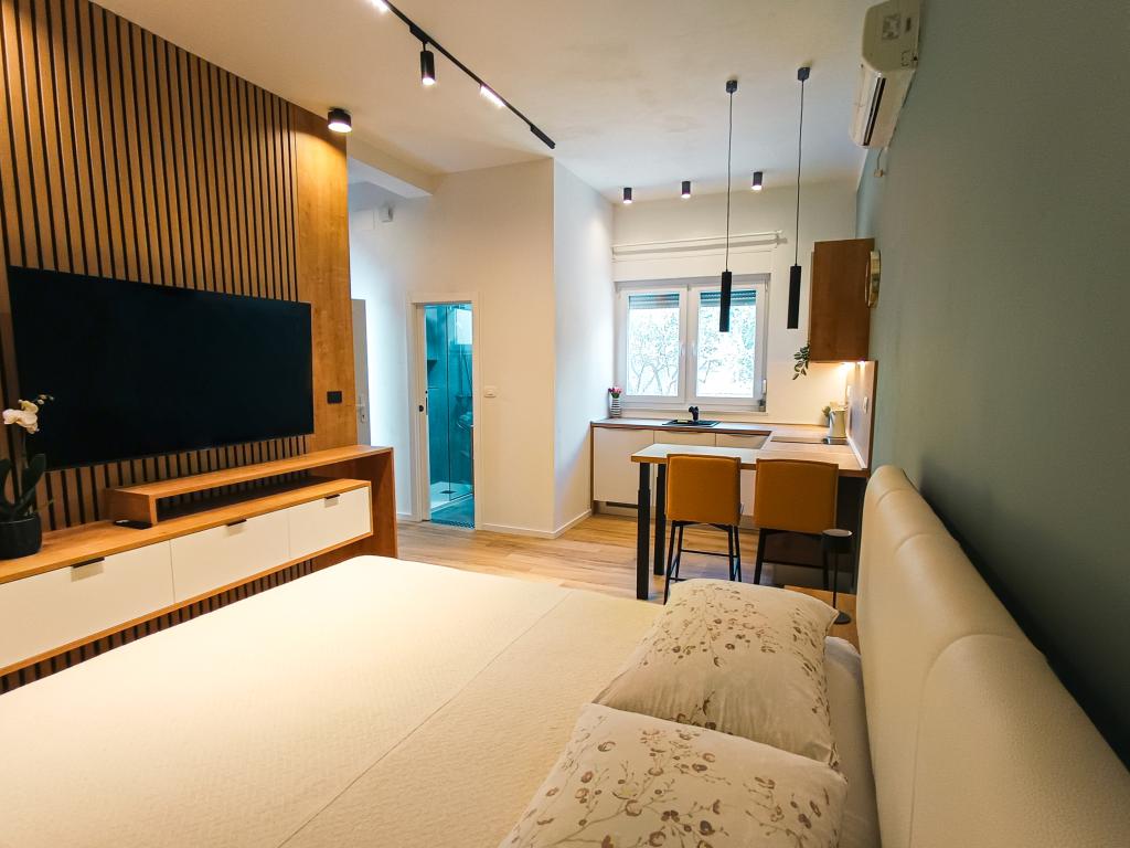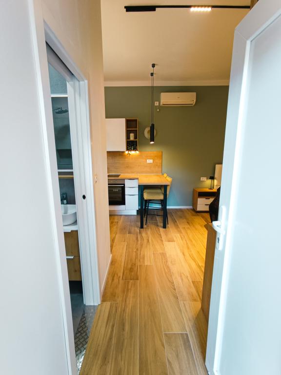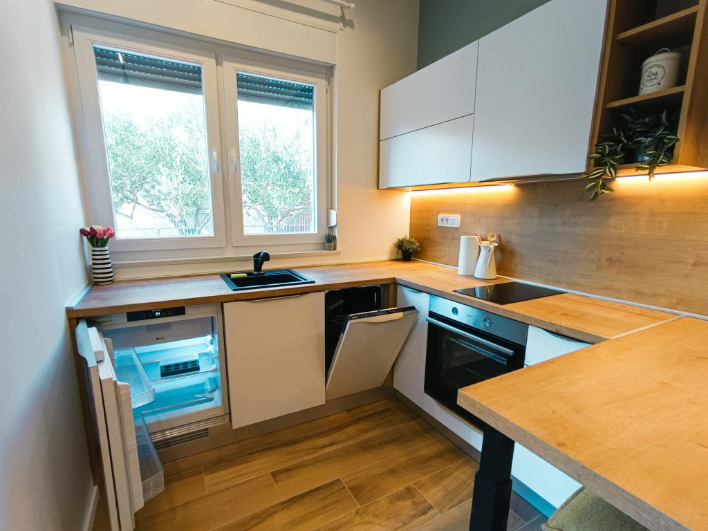 Fuldt og moderne udstyret studiolejlighed i rolige og familiære omgivelser. Velegnet til par eller en familie med et barn. Studiolejligheden har aircondition og alle de apparater og faciliteter, der er nødvendige for en ubekymret ferie i Zadar. Dobbeltseng af typen BOX, mål 160x200 med en komfortabel madras. Af de elektroniske apparater fremhæver vi især et stort tv, opvaskemaskine, vaskerum med vaskemaskine og et indbygget køleskab med fryser. Studiolejligheden indeholder alt nødvendigt køkkenudstyr og basale krydderier. Efter aftale kan vi tilføje en barneseng, højstol eller ekstra seng. Studiolejligheden har privat parkering, og for dem, der kan lide at gå, er byens centrum cirka 20 minutters gang væk. I nærheden ligger Višnjik sports- og fritidscenter, som er ideelt for alle, der kan lide at motionere udendørs, og ved siden af er der også en stor legeplads.