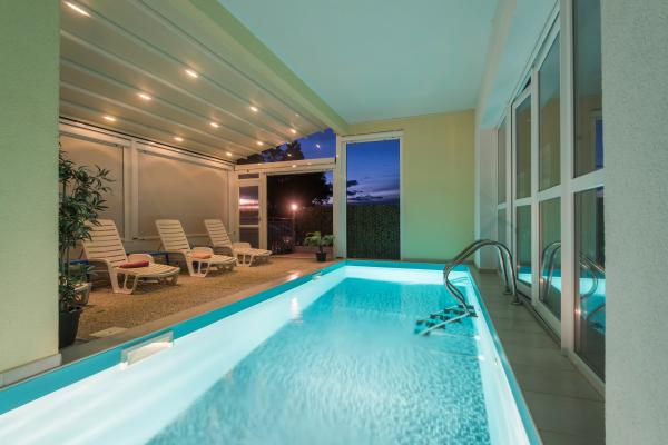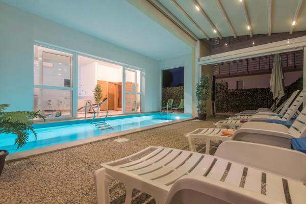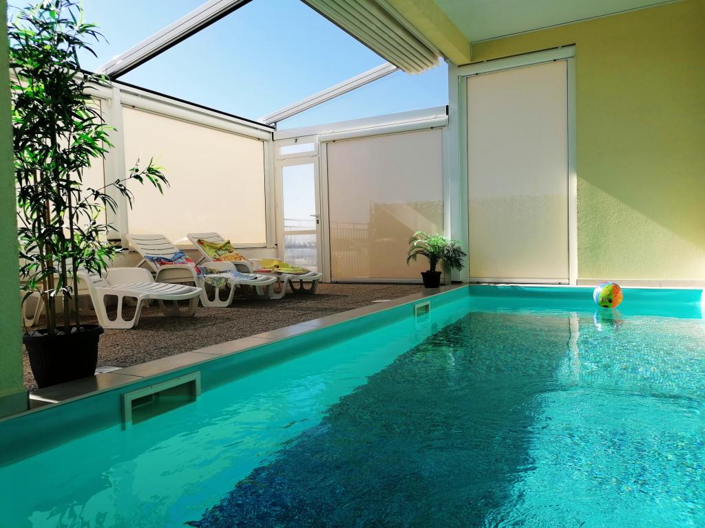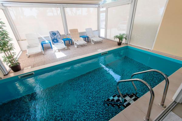 Den opvarmede pool kan nemt omdannes til en indendørs pool, hvilket er meget behageligt i koldere vejr. Poolen og wellness-området (jacuzzi, sauna, fitnesscenter, bordfodbold) benyttes af 3 lejligheder, hver lejlighed har sin egen private tid til brug i henhold til en tidsplan, der roterer hver dag, 210 minutter pr. dag pr. lejlighed, hvilket sikrer fuldstændig privatliv for gæsterne og hygiejne i rummet. Sofaen i stuen kan trækkes ud til en seng til to personer. En babyseng er tilgængelig. Udstyr: vaskemaskine, opvaskemaskine, mikrobølgeovn, ovn, induktionskogeplade, køleskab med fryser, elkedel, filterkaffemaskine, DolceGusto-maskine, brødrister, strygejern og lille strygebræt. Sengelinned, håndklæder og forbrugsvarer (opvaskemaskine- og vaskemaskinetabletter, toiletpapir, flydende sæbe, showergel) er inkluderet.
