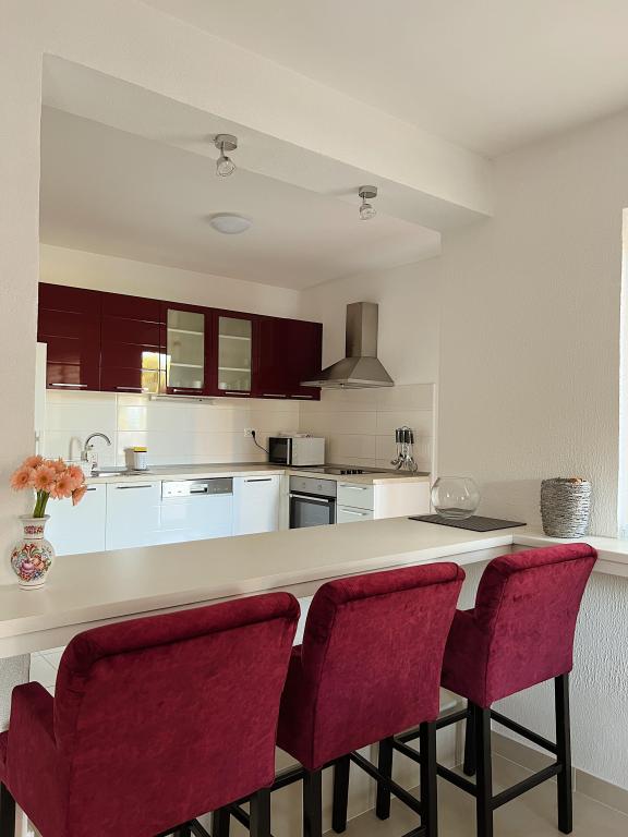 Denne smukke villa beliggende i første række til havet tilbyder den perfekte kombination af fred og afslapning, omgivet af en stor frodig have og en smuk udsigt over Biokovo-bjerget. Slap af på den rummelige terrasse eller balkoner, omgivet af smukke bougainvillea-blomster og høje palmer. Villa Ilaria består af to komfortable og rummelige fuldt udstyrede lejligheder, der vil give dig en behagelig ferie. Til lejligheden i stueetagen hører terrasse og gårdhave foran villaen med mulighed for at benytte udendørs murstensgrill, og lejligheden på 1. sal byder på tre altaner med udsigt over havet. Der er gratis privat parkering i gården på bagsiden. På forespørgsel tilbyder vi også udlejning af hele anlægget til større grupper. Lokale restauranter og caféer, et bageri, en lokal frugt- og grøntsagsbod, souvenirbutikker og forskellige udflugter er tilgængelige inden for få minutters gang.
