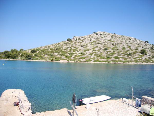 Lejlighed i stueetagen - 60 m2 (hovedområdet med køkken med spisestue og to senge, værelse med dobbeltseng, toilet, terrasse med udendørs spisebord - kapacitet: 4 personer) Huset har en køkken, et værelse og et toilet, el (fra solenergi - du kan oplade mobiltelefoner og bærbare) og drikkevand (fra regnvand). Prisen inkluderer en lille båd til svømning med motor (4m; 6hk). Transport til øen med båd tager 2 timer (båden og skipperen til transport er gratis, hvis du ankommer og tager af sted på en SØNDAG, gæsten betaler kun brændstof koster ca. €200) Nyd Kornati National Park, besøg klipperne, dyk , se dyr og udforsk nationalparken - oplev din ferie anderledes!