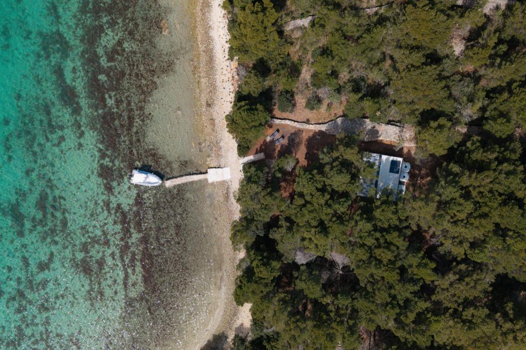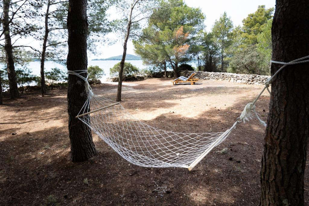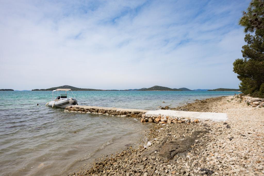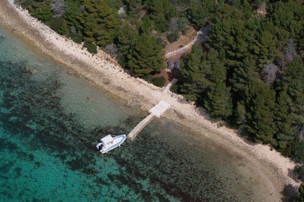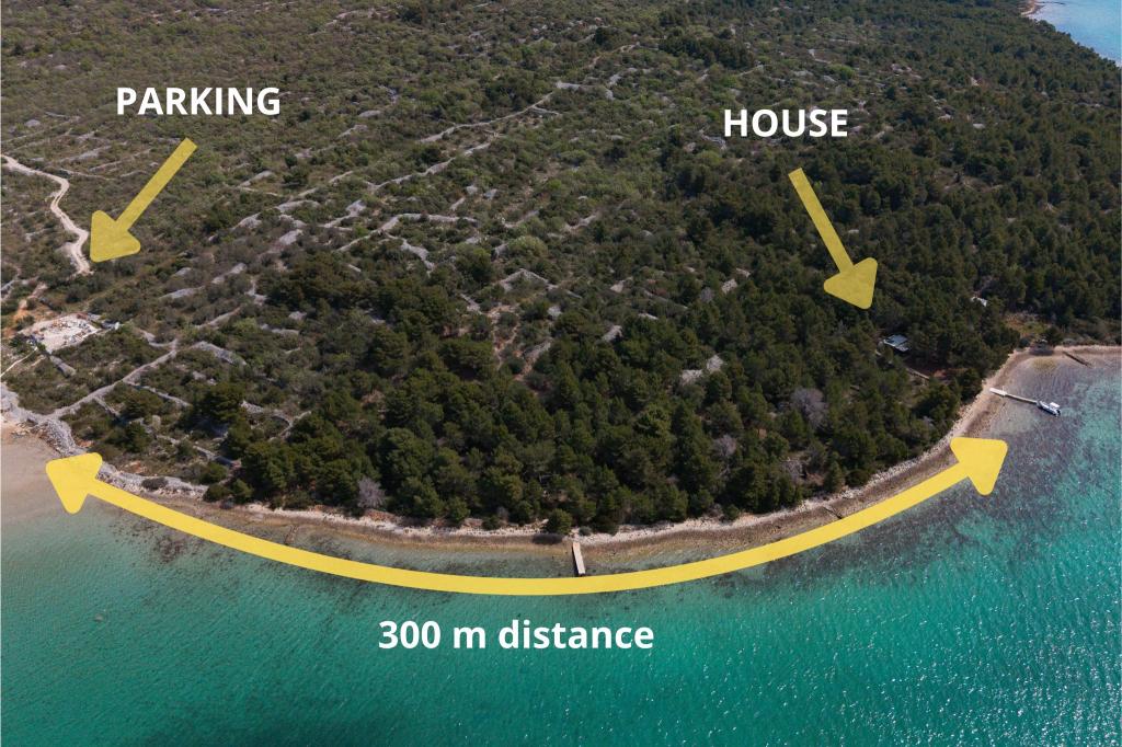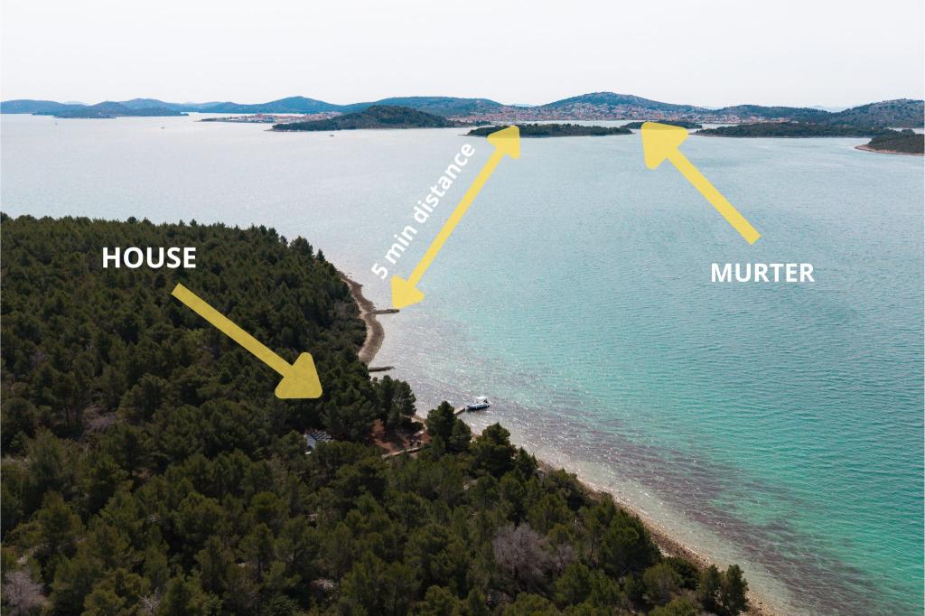 Kysthuset "Una" ligger fuldstændig isoleret, omgivet af grønne områder og uberørt natur, hvilket gør det til et ideelt sted at undslippe hverdagens stress. Det ligger kun 5 minutters speedbådstur fra øen Murter. Her kan du nyde stilheden, den naturlige skygge og havet, som kun ligger få skridt væk. Den nærmeste facilitet ligger 70 meter væk og er ikke i brug, hvilket yderligere garanterer fuldstændig fred og privatliv. Dette er det perfekte sted at slappe af og komme i kontakt med naturen, væk fra folkemængderne og støjen. Huset kan kun nås med båd, og transport er inkluderet i prisen. Ankomst i bil er ikke mulig - køretøjet skal parkeres på vores parkeringsplads i Murter.