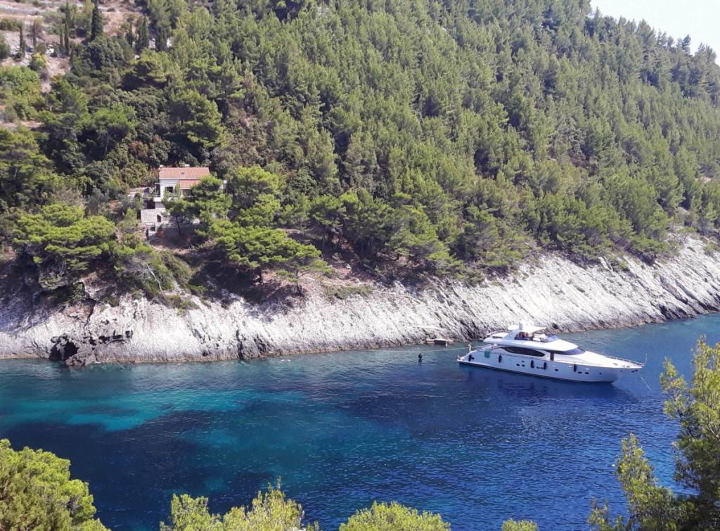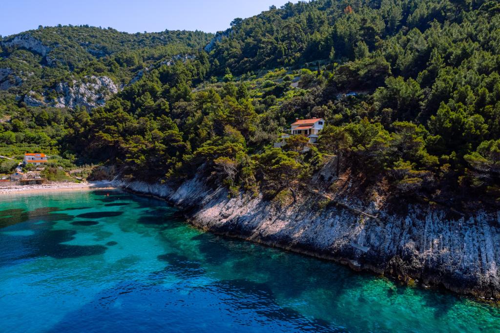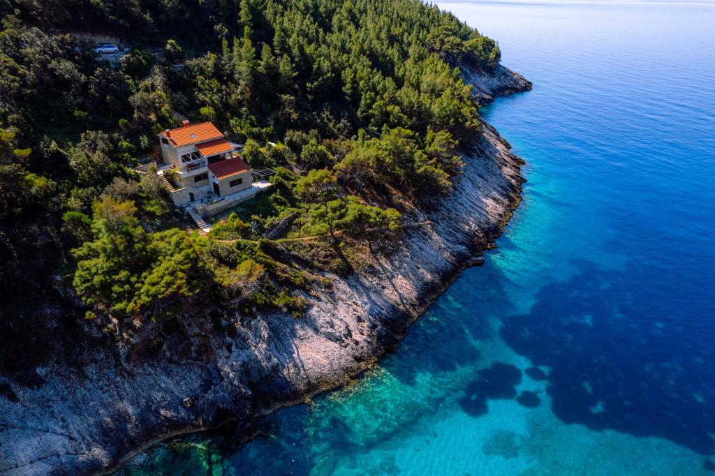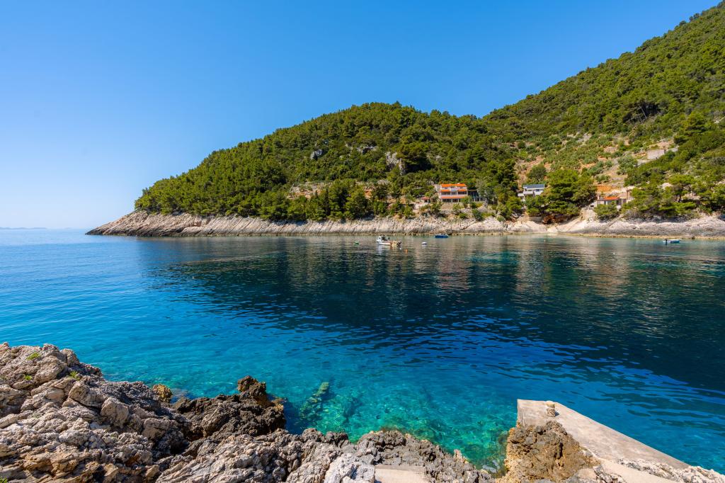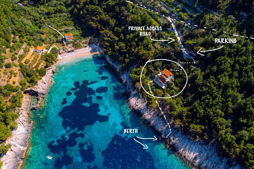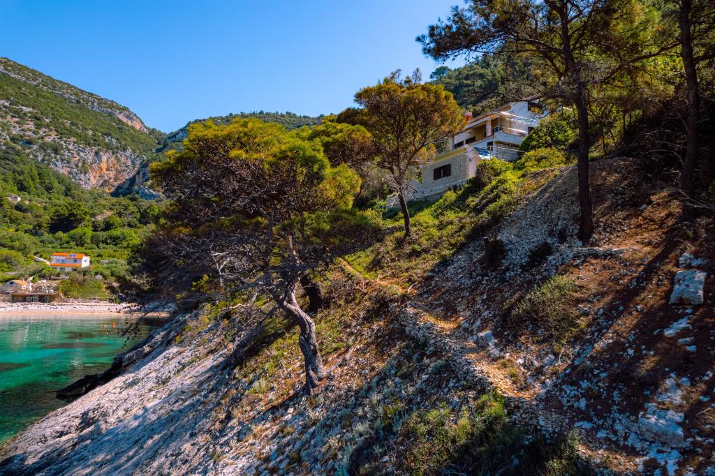 Fra bugten, der ser ud mod øen Lastovo, og videre: mod Italien, og som nærmest er afskåret fra civilisationen, ligger Robinsons hus. Huset har 4 soveværelser (kapacitet 8 personer), stue, flere terrasser, 3 badeværelser, to relativt veludstyrede køkkener, udendørs grill. Omgivelserne er stejle, stenede og grønne (stærk vegetation). I bugten er der en smuk stenstrand og en restaurant. På den anden side af bugten er der et par andre huse. Så du er ikke helt alene... Adgang til huset: Hovedvejen slutter, når du kommer til en lille, smal vej (5 km til huset). efter 5 km kan du efterlade din bil på parkeringspladsen. Derfra fører en smal sti til huset gennem rigelig vegetation (ca. 30m). Så kommer en unik oplevelse: en smuk udsigt og et meget velorganiseret og udstyret hus (selvfølgelig med de muligheder, som Robinson-området tillader). Vi ønsker at præsentere denne bolig for dig som noget unikt.