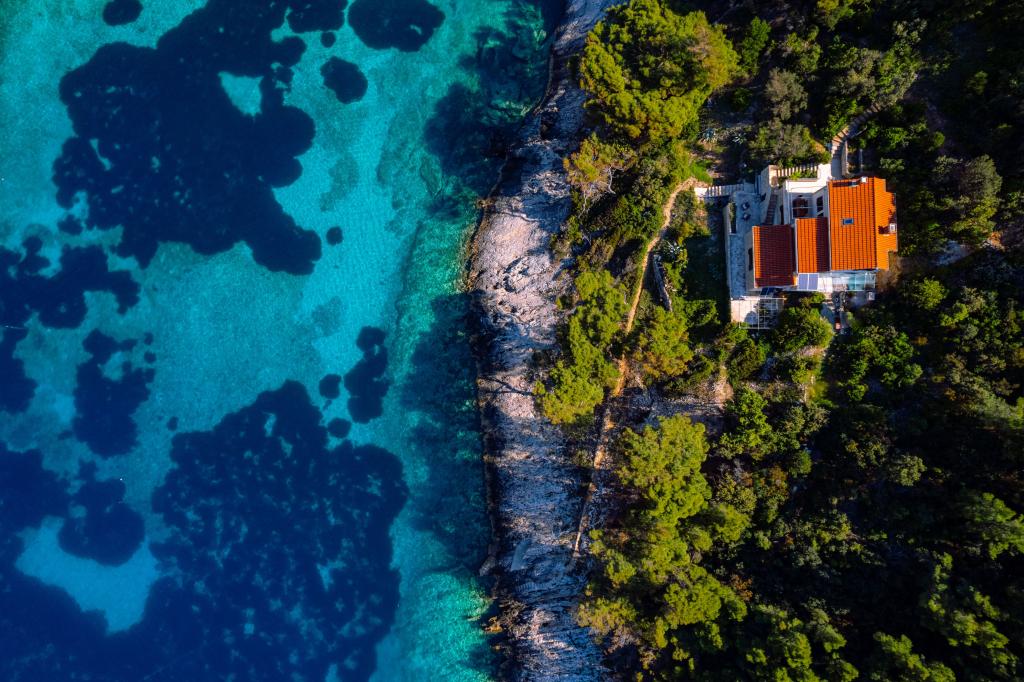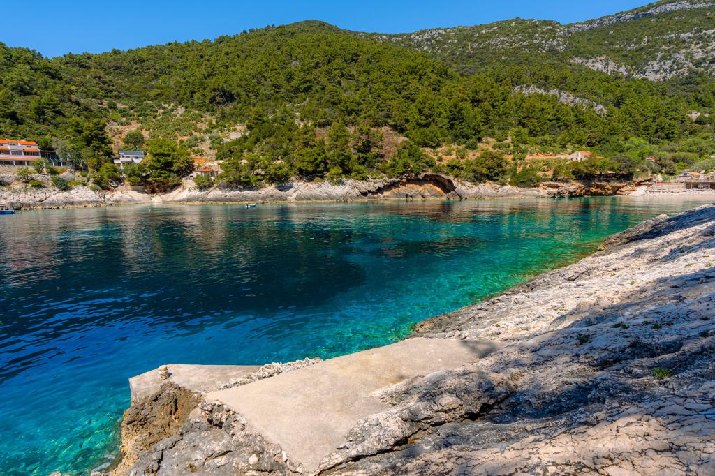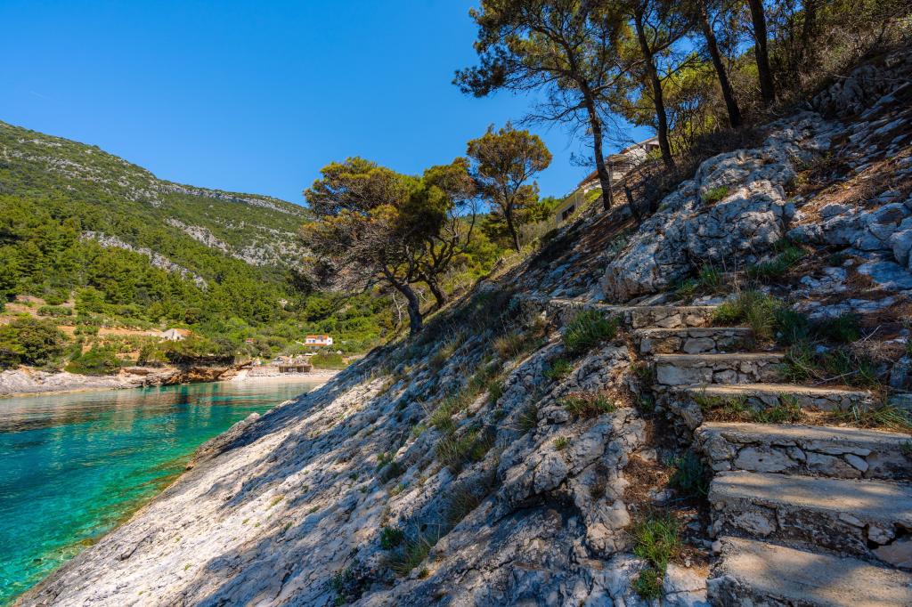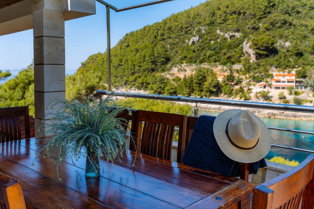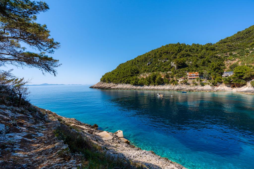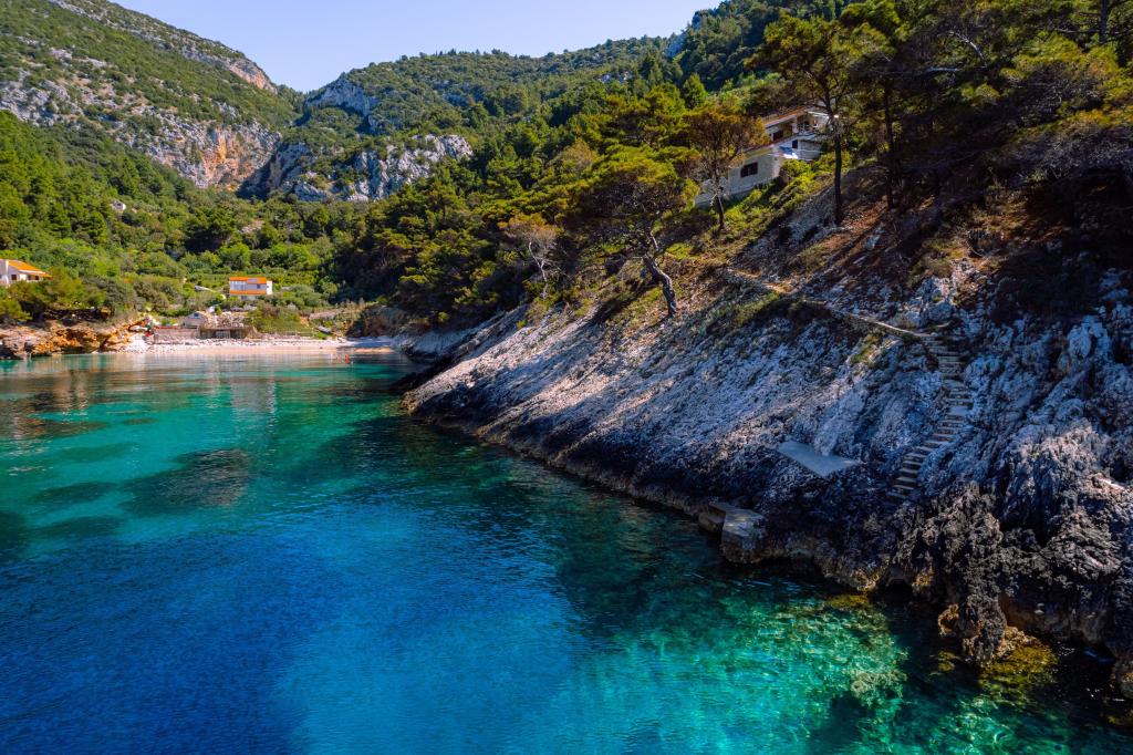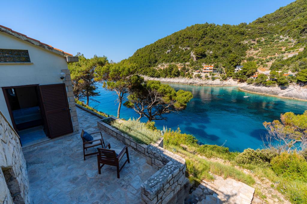 Fra bugten, der ser ud mod øen Lastovo, og videre: mod Italien, og som nærmest er afskåret fra civilisationen, ligger Robinsons hus. Huset har 4 soveværelser (kapacitet 8 personer), stue, flere terrasser, 3 badeværelser, to relativt veludstyrede køkkener, udendørs grill. Omgivelserne er stejle, stenede og grønne (stærk vegetation). I bugten er der en smuk stenstrand og en restaurant. På den anden side af bugten er der et par andre huse. Så du er ikke helt alene... Adgang til huset: Hovedvejen slutter, når du kommer til en lille, smal vej (5 km til huset). efter 5 km kan du efterlade din bil på parkeringspladsen. Derfra fører en smal sti til huset gennem rigelig vegetation (ca. 30m). Så kommer en unik oplevelse: en smuk udsigt og et meget velorganiseret og udstyret hus (selvfølgelig med de muligheder, som Robinson-området tillader). Vi ønsker at præsentere denne bolig for dig som noget unikt.