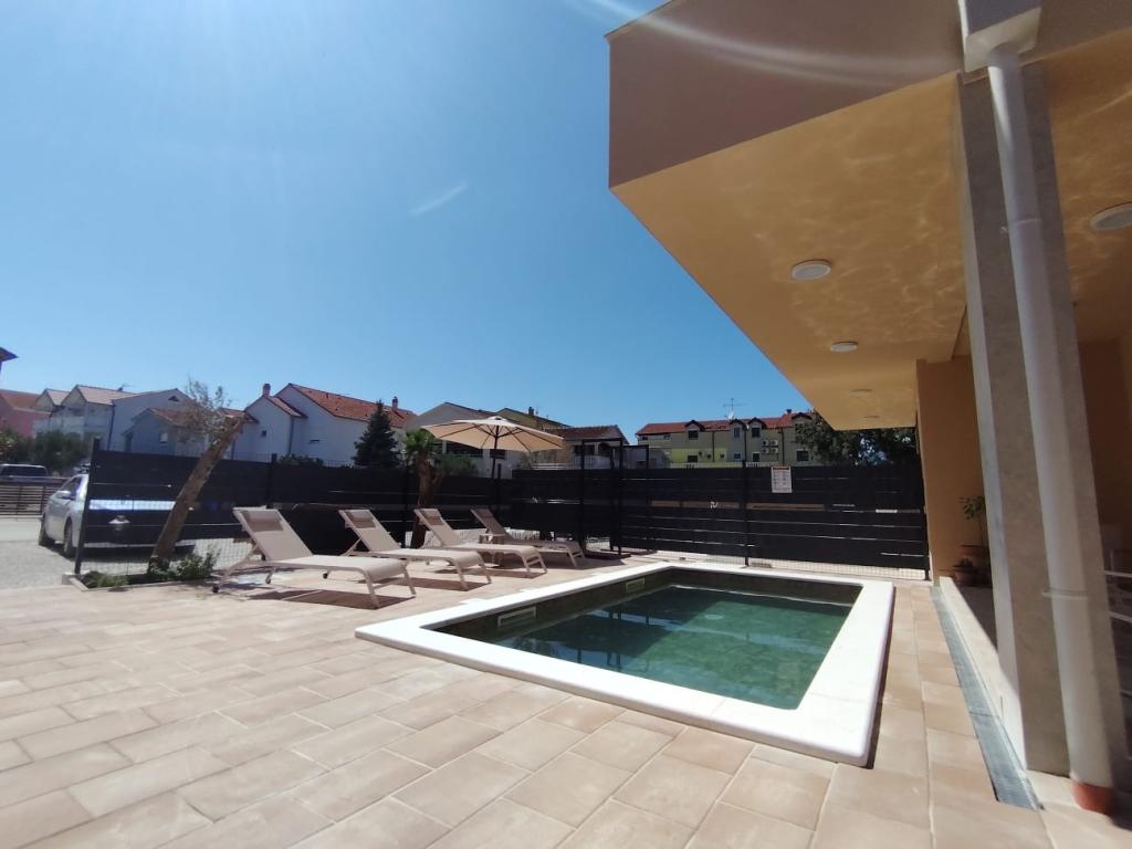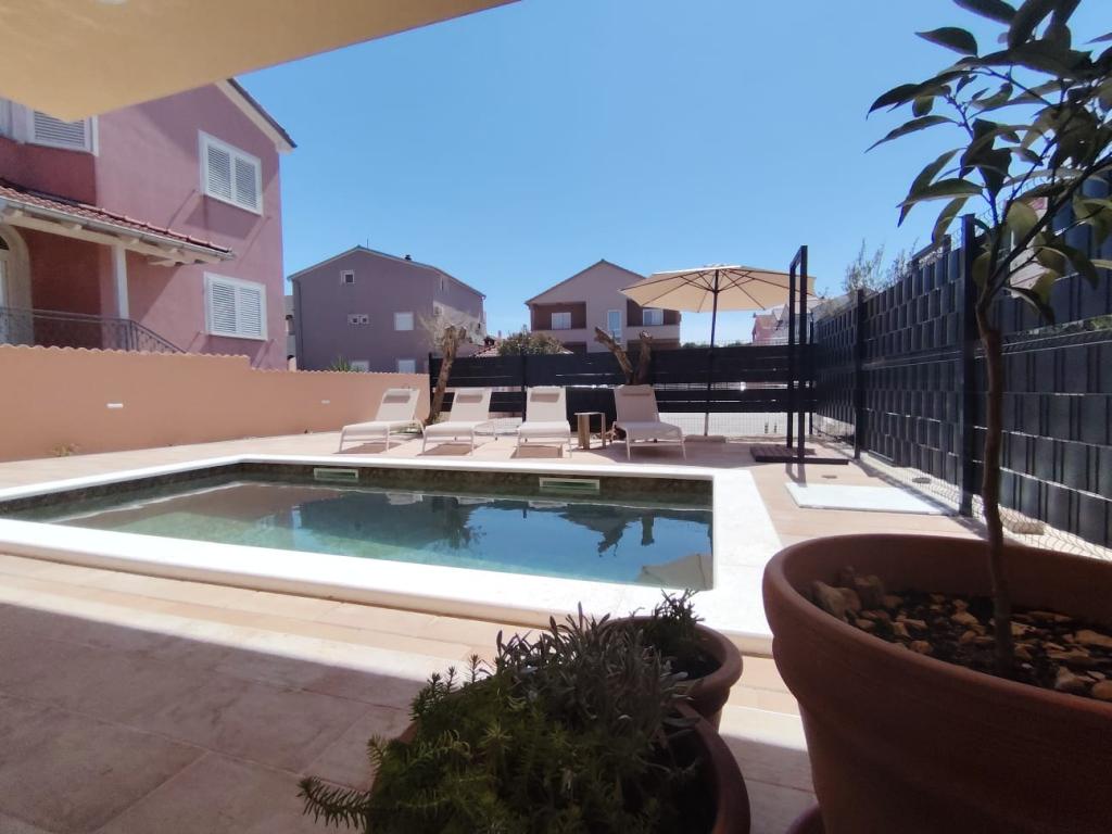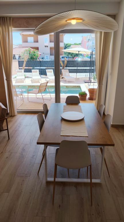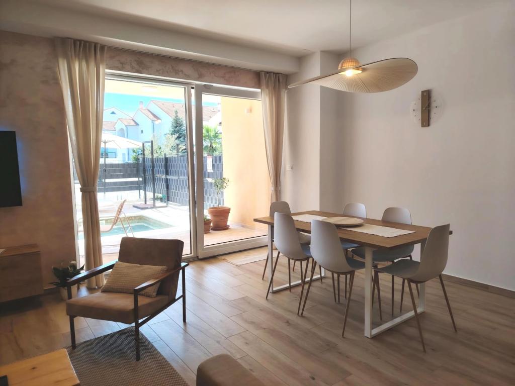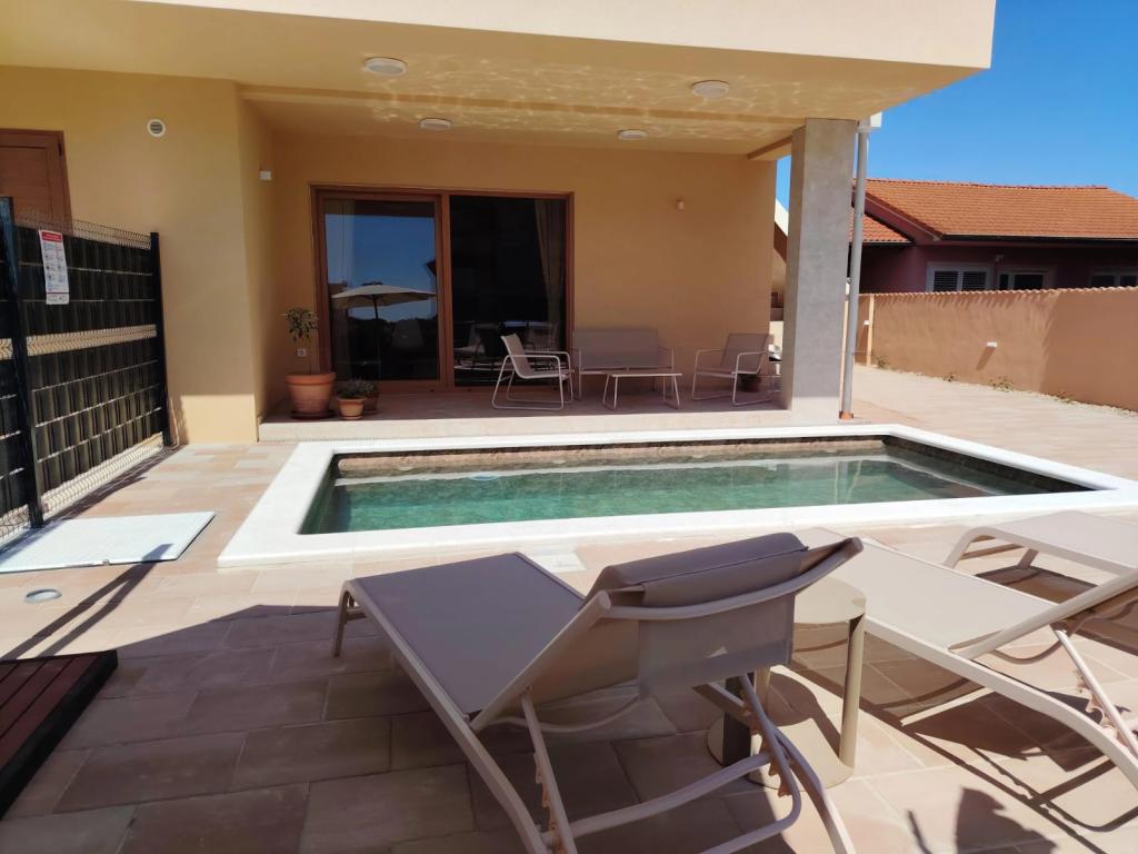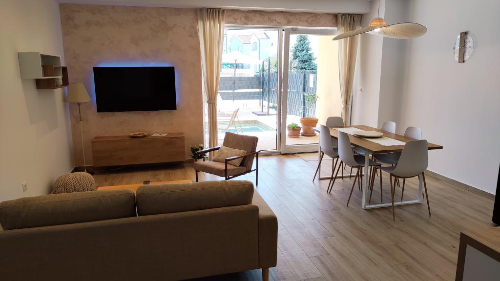 Nybygget toetagers feriehus med swimmingpool og to separate boligenheder (stueetage og første sal). Hver boligenhed er 95 kvadratmeter stor og er udstyret med 3 soveværelser, køkken, badeværelse, terrasse og stue. Parkering er til rådighed.