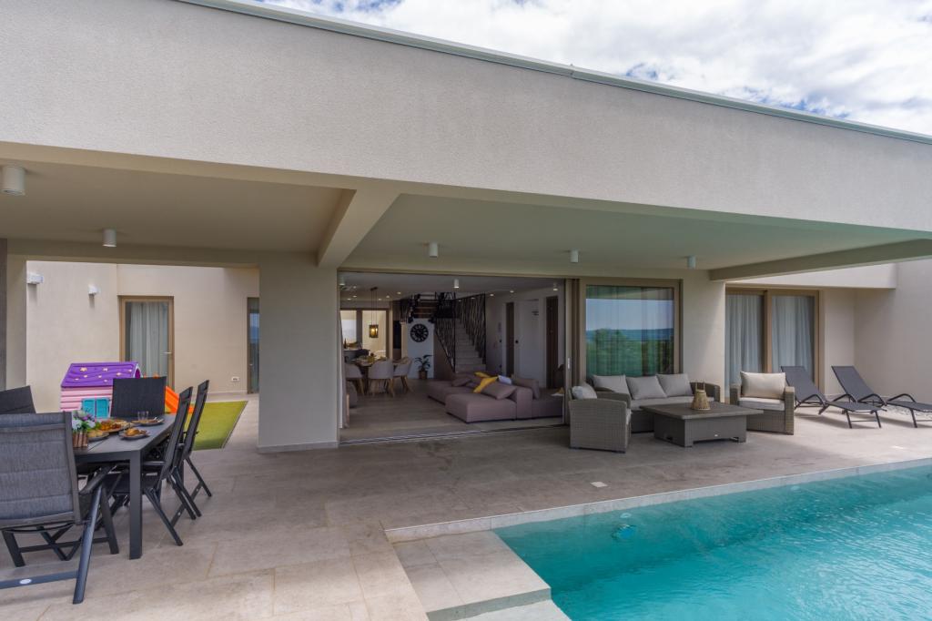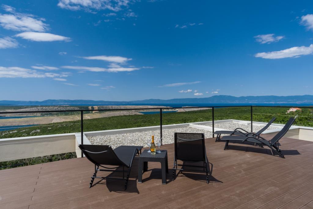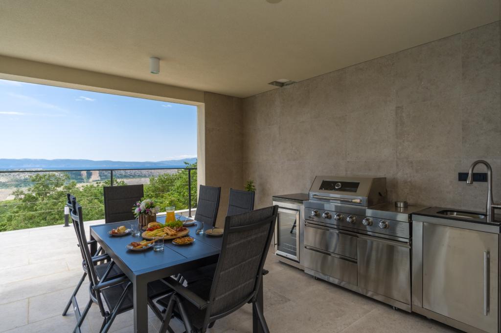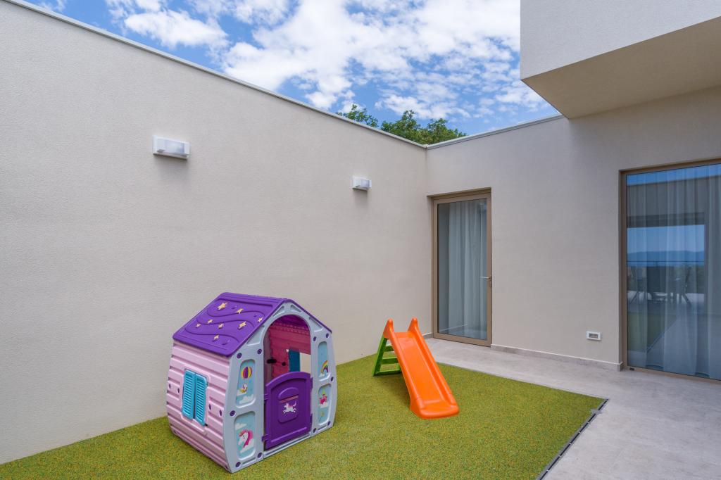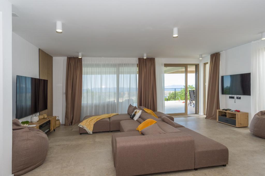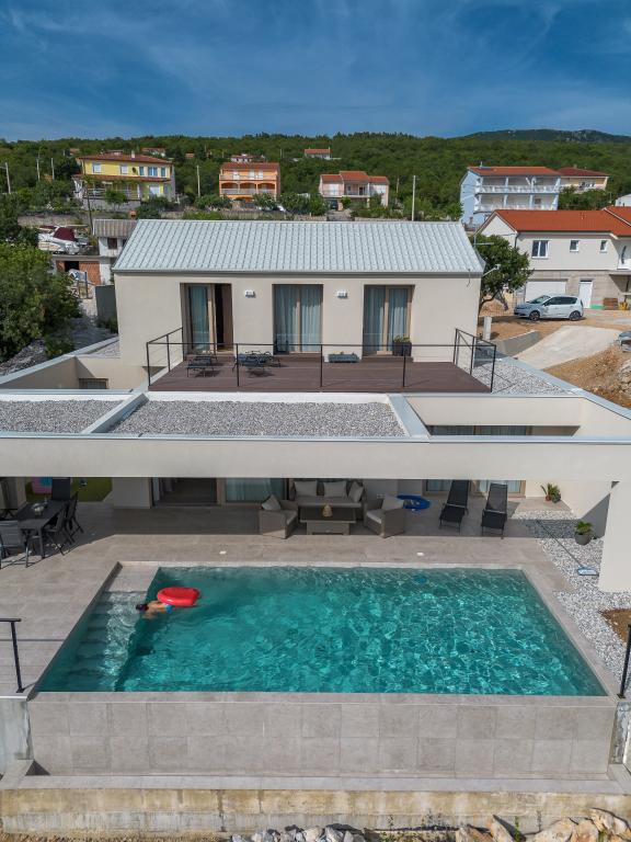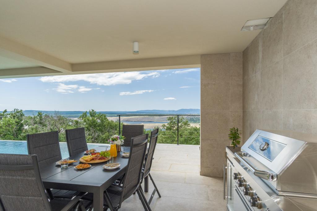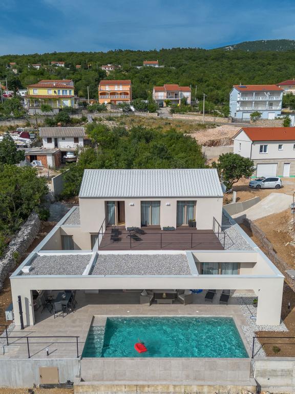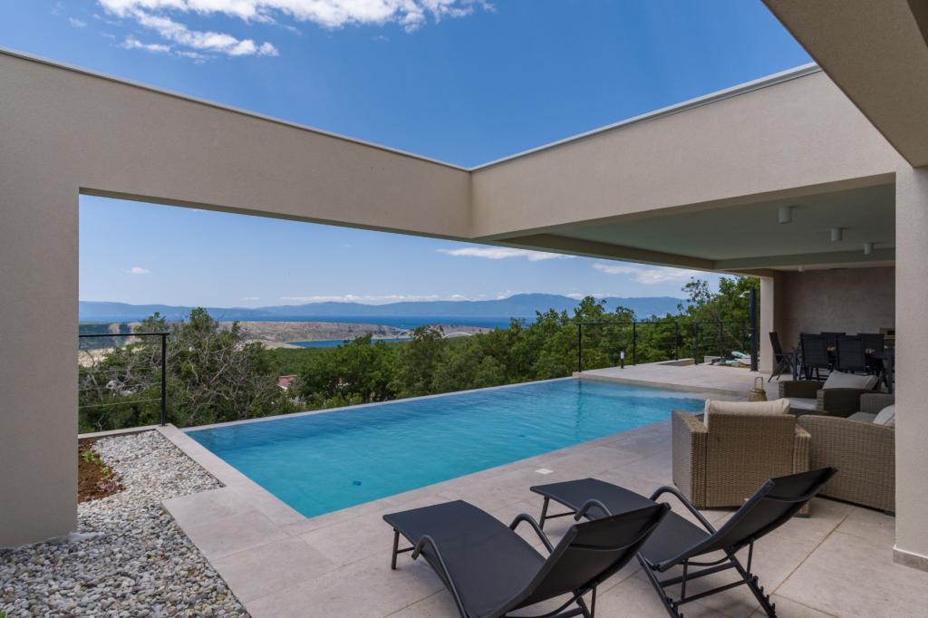 Ny. En fuldt udstyret ny villa med en swimmingpool, der måler 9x4 m, ligger i Šmrika, nær turiststedet Crikvenica. Villaen ligger et roligt sted og er skjult for indsyn. Fra hvert hjørne af huset er der udsigt over havet, øen Krk, øen Cres, Istrien og fra terrassen på første sal, Rijeka og Opatija. Villaen har 3 store soveværelser og badeværelse i hvert værelse samt stor stue med køkken og spisestue. Ved siden af poolen er der også et udendørs køkken med gasgrill. For at børnene ikke skal kede sig, er der legeplads 4, og for de mindste er der en legeplads med hus og rutsjebane. Voksne kan slappe af i fitnesscentret. Ved siden af køkkenet er der en lille have med krydderier, der kan bruges i madlavningen - basilikum, rosmarin, cherrytomater... Afstanden fra sandstranden i Jadranovo er 4 km. I en afstand af kun 1 km er der Bura kartingbane og en æselfarm, yderst attraktiv for børn.